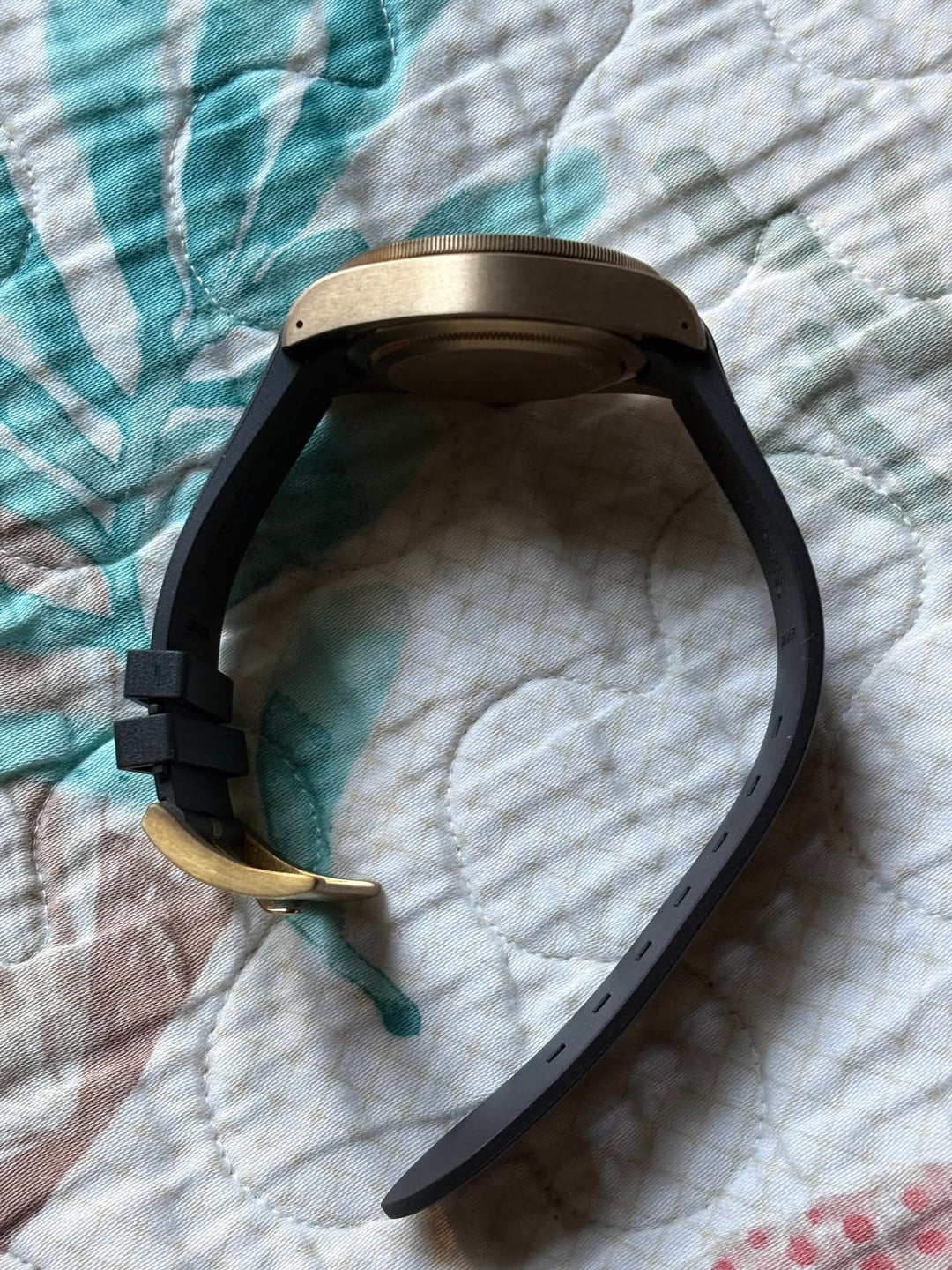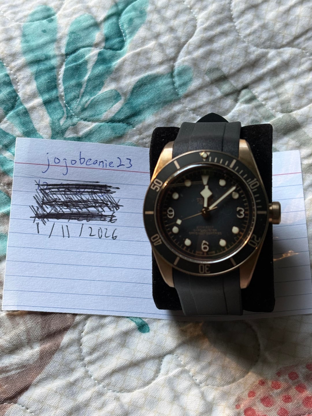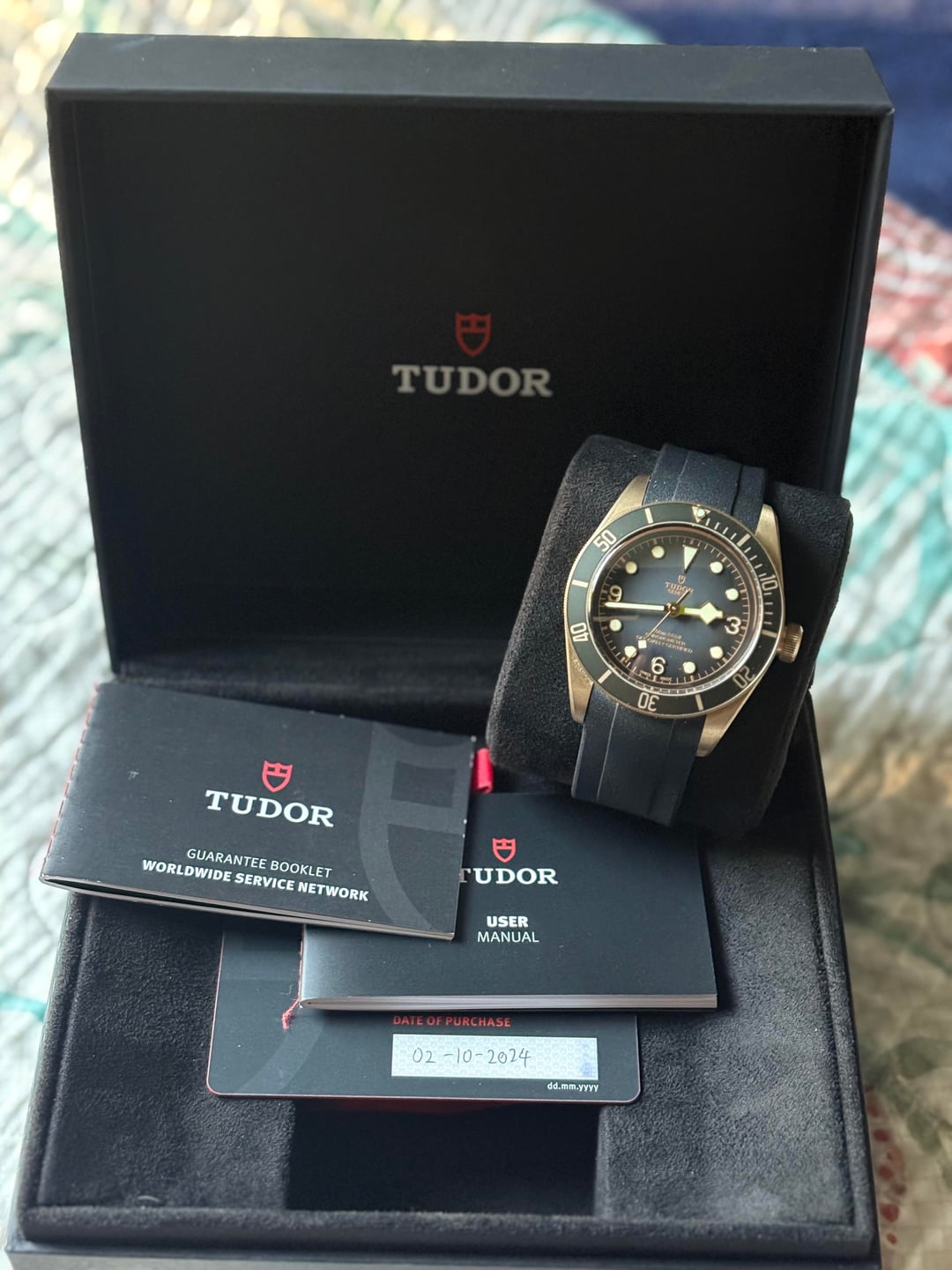 Black Bay Bronze 43mm Black Bay Bronze 43 on RubberB strap with aftermarket bronze buckle. Original nato strap included. Box, papers, warranty card dated 2/10/2024 Scratches on bottom left lug, clean crystal and bezel. Running great Price: $3000+shipping CONUS only, no trades please PayPal F&F, Venmo, Zelle Shipping via FedEx Please comment here before PMing