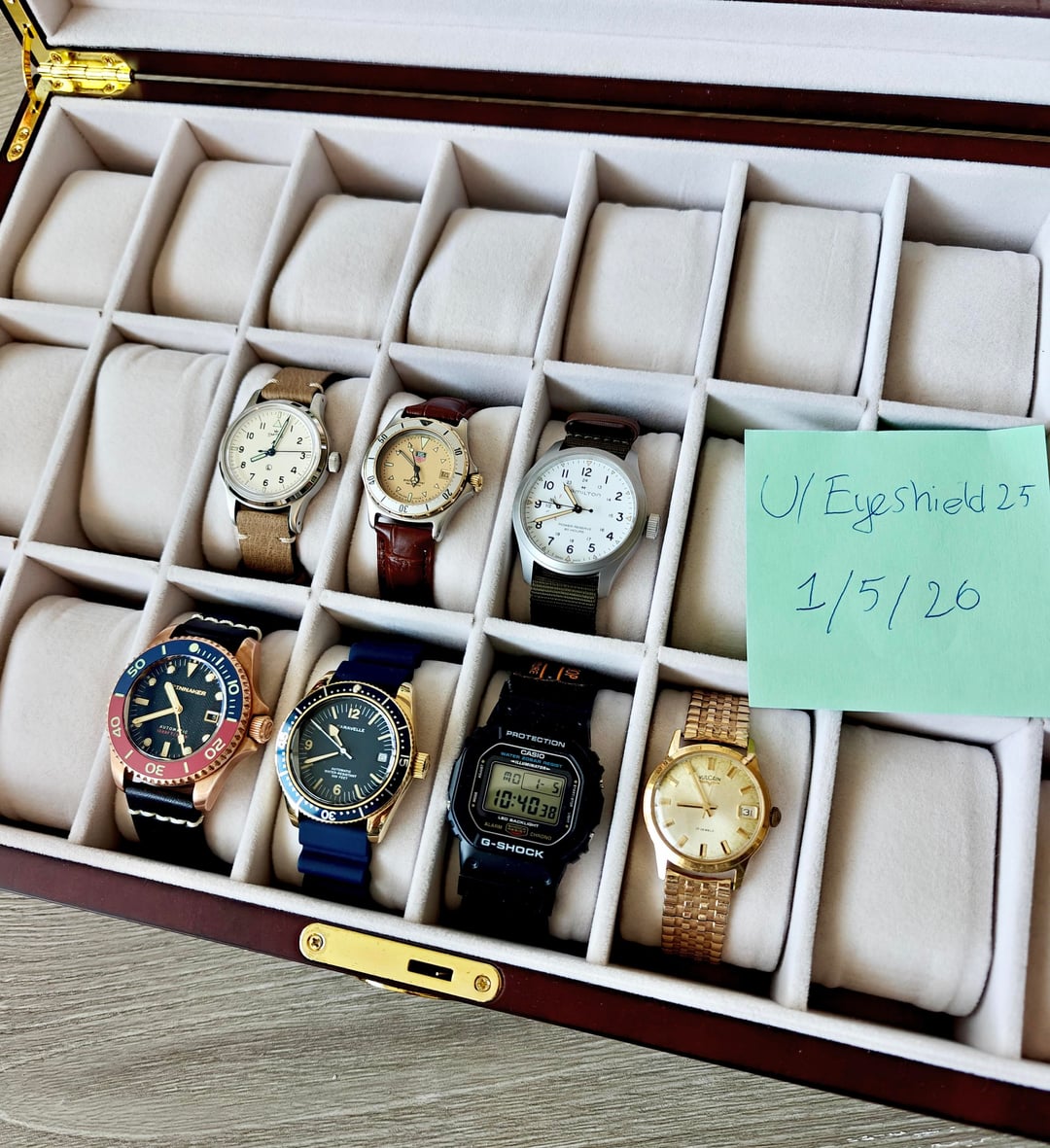 Up for sale is a couple of watches that I have available. Please read the details below, and if you have any other questions please reach out. All watches are in pre-owned condition, and prices include shipping in the continental U.S. No trades, sorry. • $275 - Tag Heuer Professional 200 Quartz 974.013F - Good condition for age. Moderate scratches and wear throughout, wear marks on crown. Runs well and bezel action is crisp. Watch only, on a new aftermarket strap. • $695 - Hamilton Khaki Field Power Reserve H69509910 - Near mint condition. Light wear throughout, mainly on the strap. With box and papers. • $450 - Spinnaker Tesei Bronze Soda Black - Near mint condition. Light wear throughout, mainly on the strap. With box and papers. • $50 - G-Shock DW-5600UE - Very good pre-owned condition. light scratches on parts of the watch, and wear on the afternarket strap. No box or papers. • $120 - Vintage Vulcain manual wound - Fair condition for age. Plenty of scratches and wear throughout the watch. Winds and runs. Watch only. I take Zelle and bank wire as payment. Paypal F&F/Venmo can be an alternative if you have feedbacks on this subreddit. I have 120+ confirmed transactions on watchexchange, and many more on other platforms. Buy with confidence!
