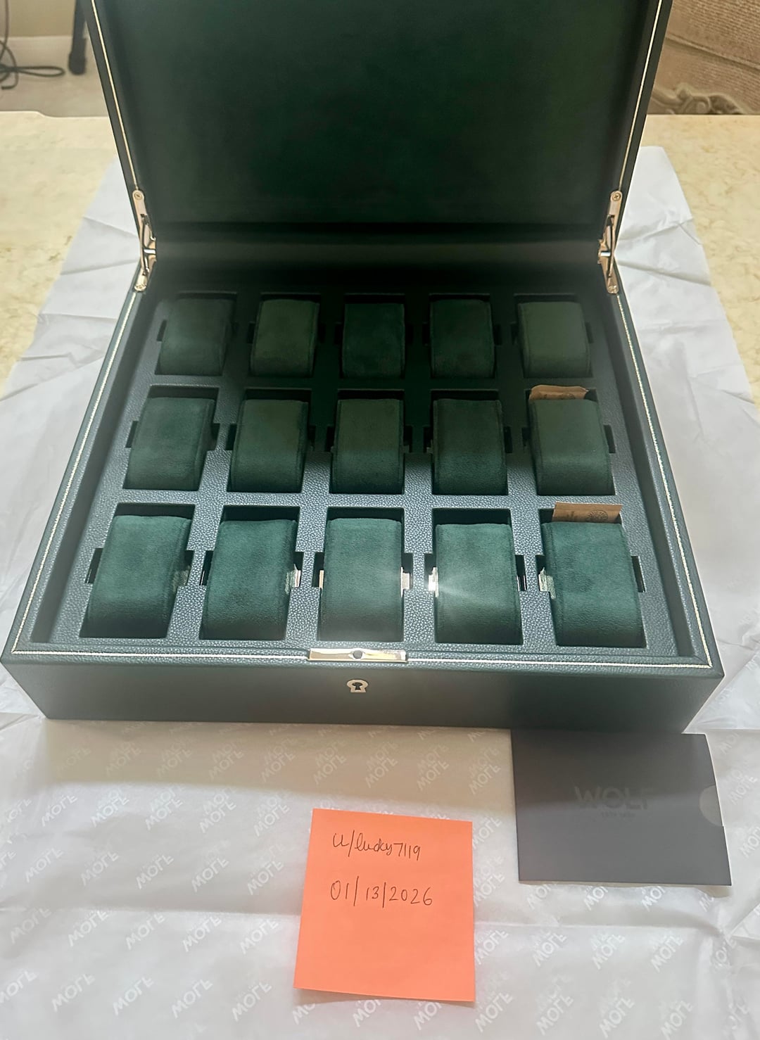 **WOLF British Racing Watch Box** Quad angled paneled lid, Lock and key security, Suspended watch cushions. 15 pc Watch Box - $395 Color - Green [Product Link](https://www.wolf1834.com/us/british-racing-15pc-watch-box) BNIB with all original packaging. Zelle, Venmo, PayPal FF Free USPS/UPS Shipping within CONUS.