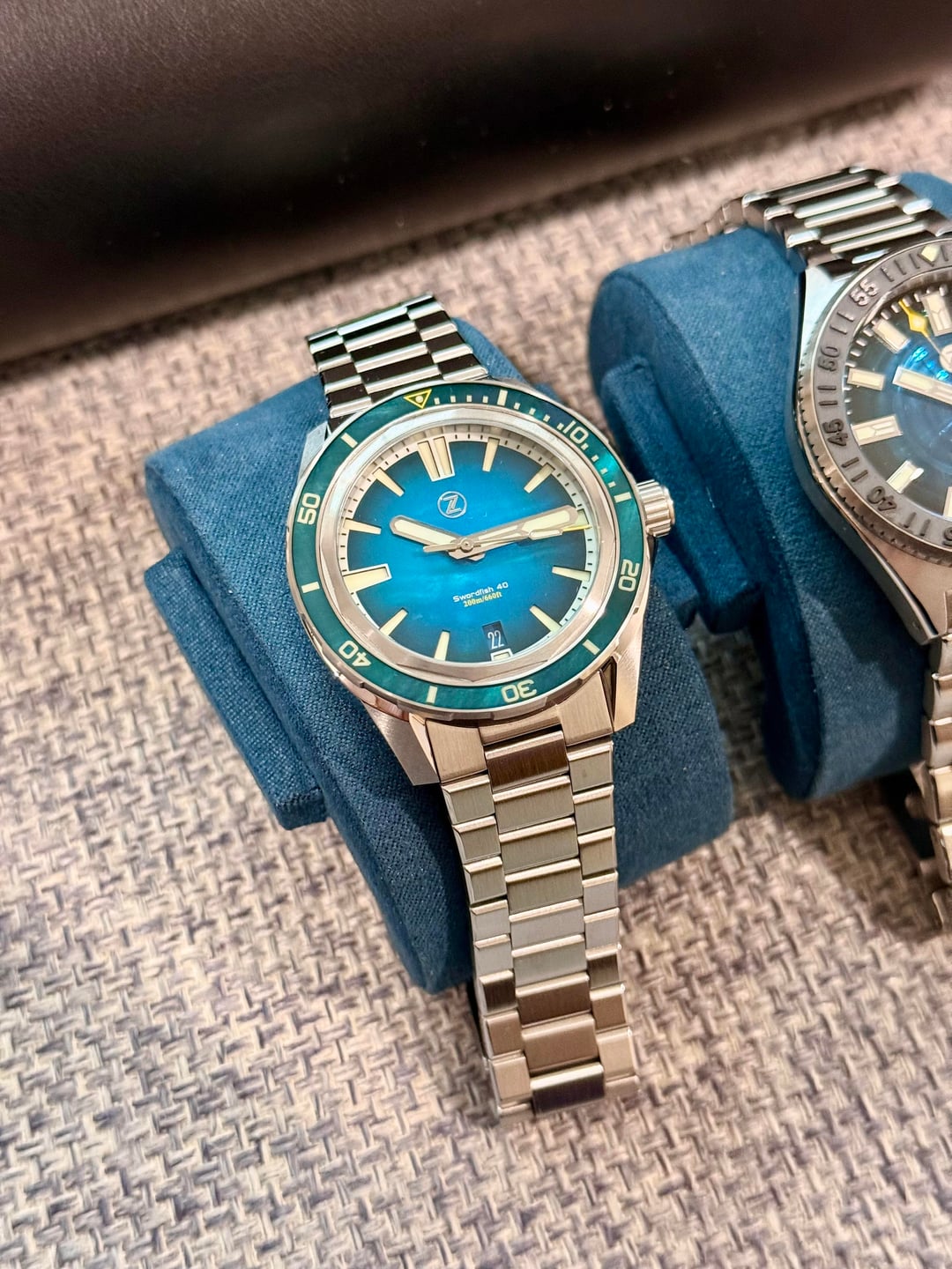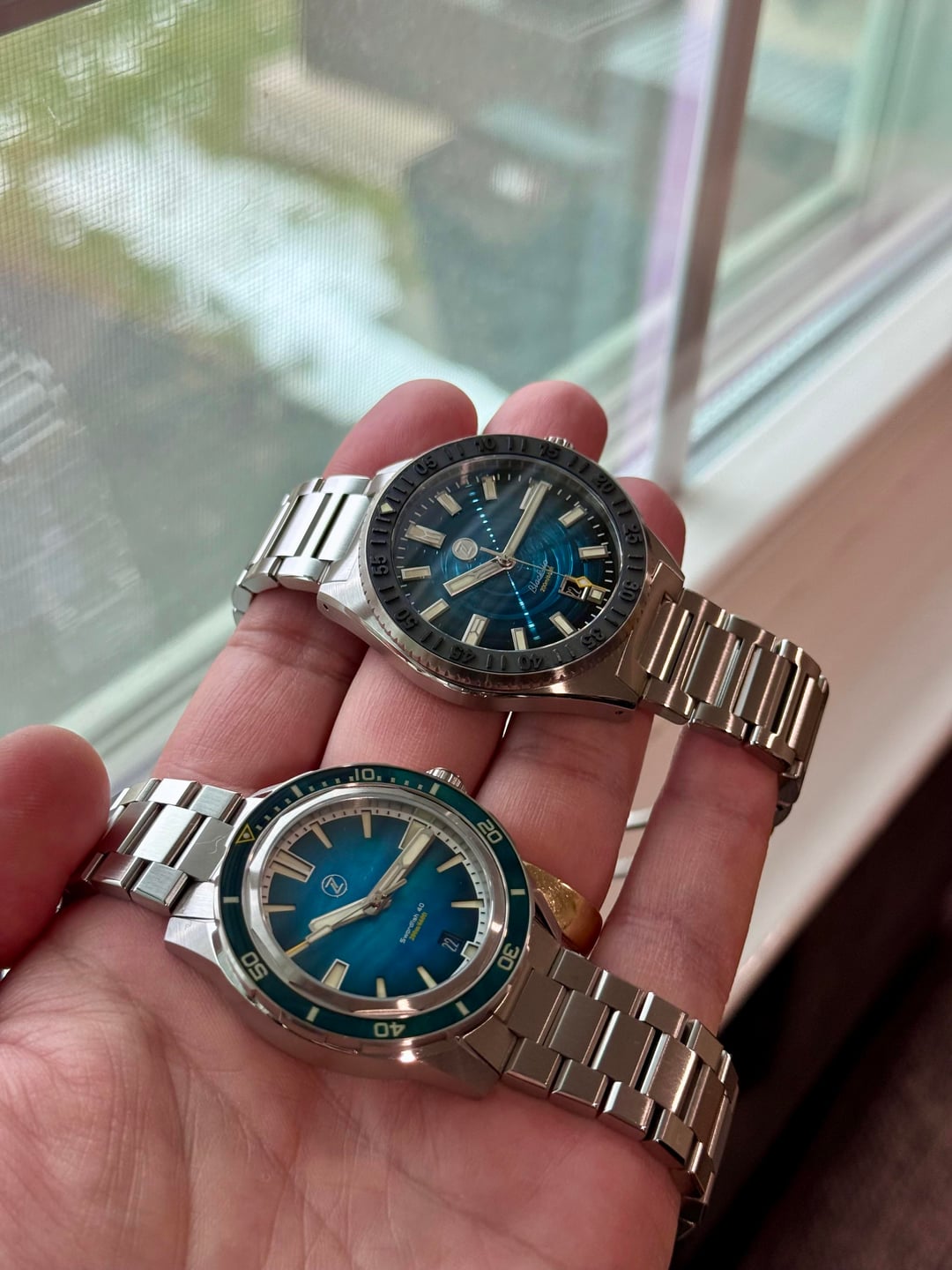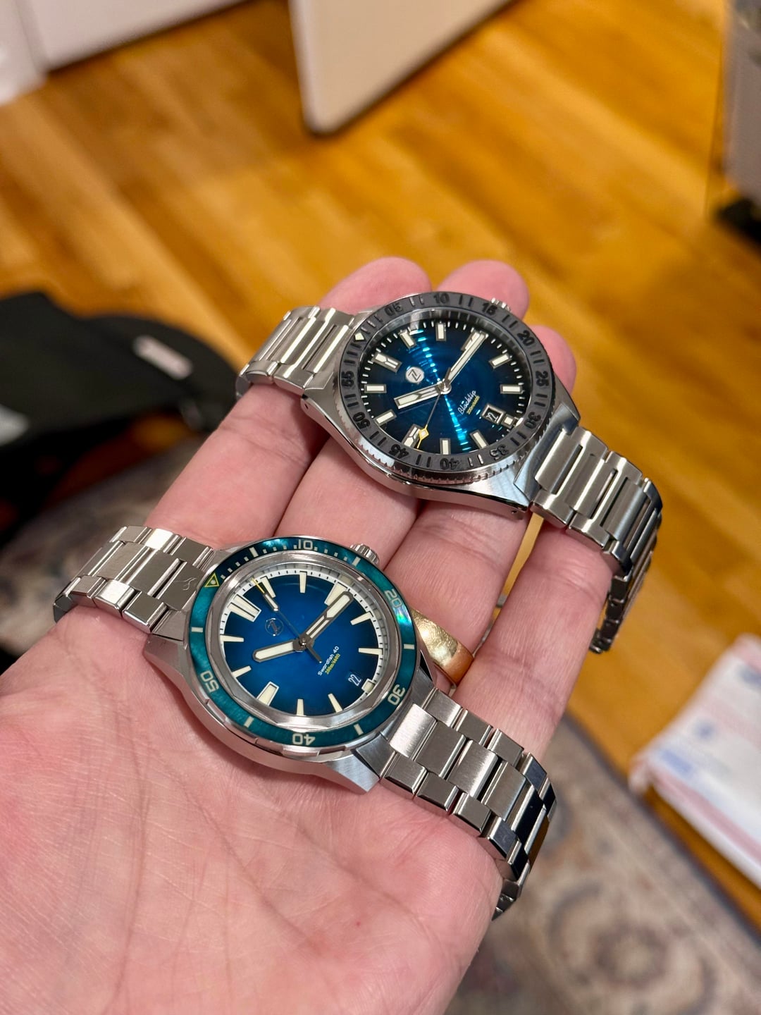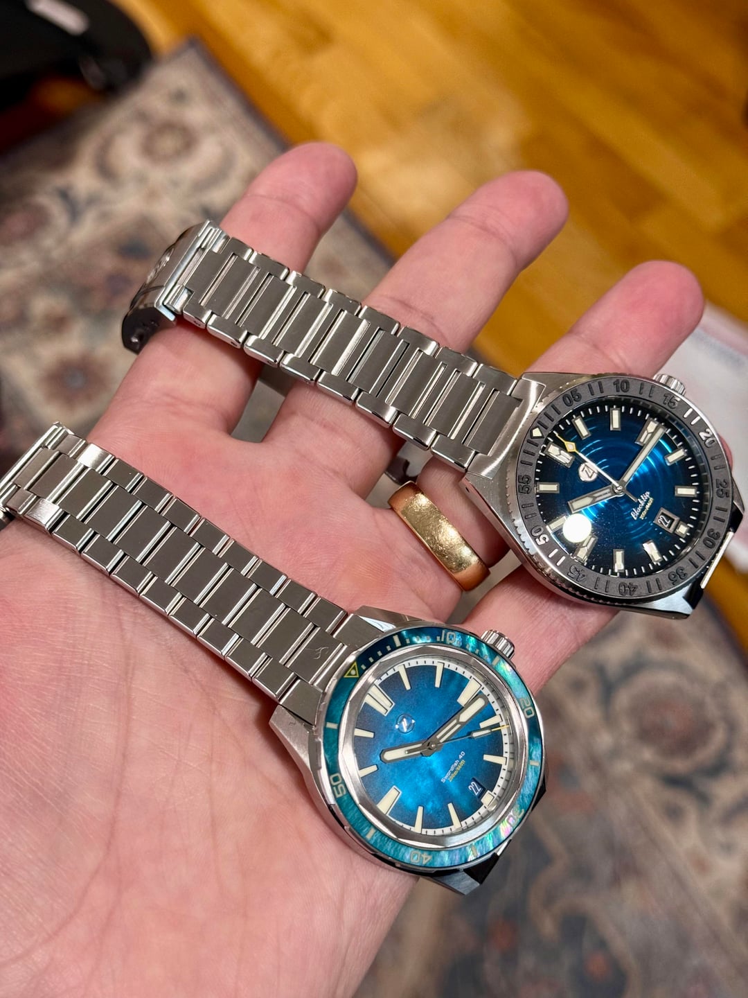 Hello WatchEx, Love teal watches? Love a stunning/mesmering watch dial? You’re in the right place. Up for sale are my two mint condition Zelos teal watches. The teal mother of pearl Swordfish came out last year and last I checked is trading for bonkers prices on eBay. The Whirlpool came out in December 2025. Both of these are mint. The Whirlpool is complete with warranty card and all links. The Swordfish is sized for a 7.5 inch wrist and has some room with the on the fly clasp, and it comes with three additional links but they are missing the screw pins. It is also missing the warranty card. Both watches will come in the one 3-watch Zelos travel roll that came with my Whirlpool, it is basically brand new. Both of these watches are mint. $850 zelled shipped within CONUS. This is a great deal for both, and these two watches will never be released in their current configurations again. Both are wonderful robust stainless steel dive watches with uber comfortable bracelets with on the fly adjustment. Both will put constant smiles on your face. Timestamp/video: https://imgur.com/a/H7XHfr5 Reach out with any questions!