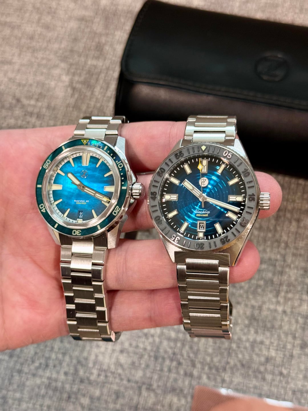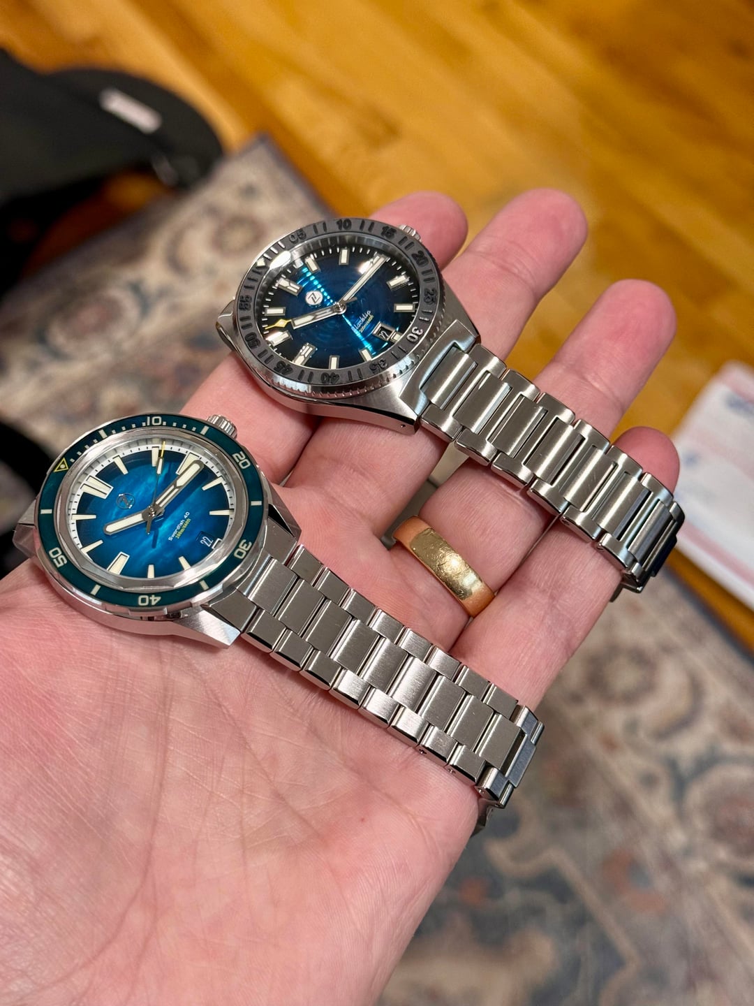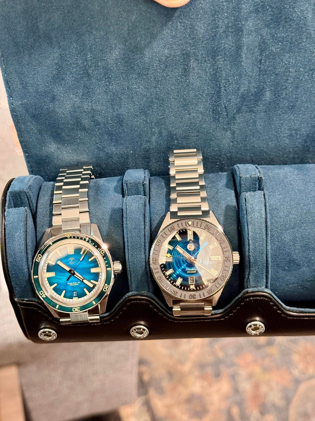 Hello WatchEx, Love teal watches? Love a stunning/mesmering watch dial? You’re in the right place. Up for sale are my two mint condition Zelos teal watches. The teal mother of pearl Swordfish came out last year and last I checked is trading for bonkers prices on eBay. The Whirlpool came out in December 2025. Both of these are mint. The Whirlpool is complete with warranty card and all links. The Swordfish is sized for a 7.5 inch wrist and has some room with the on the fly clasp, and it comes with three additional links but they are missing the screw pins. It is also missing the warranty card. Both watches will come in the one 3-watch Zelos travel roll that came with my Whirlpool, it is basically brand new. Both of these watches are mint. $850 zelled shipped within CONUS. This is a great deal for both, and these two watches will never be released in their current configurations again. Both are wonderful robust stainless steel dive watches with uber comfortable bracelets with on the fly adjustment. Both will put constant smiles on your face. Timestamp/video: https://imgur.com/a/H7XHfr5 Reach out with any questions!