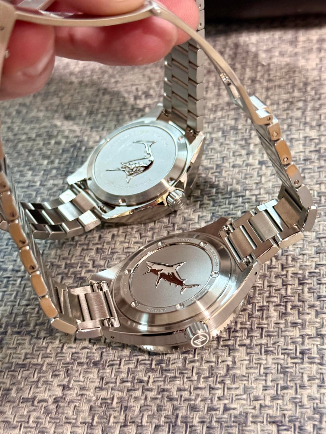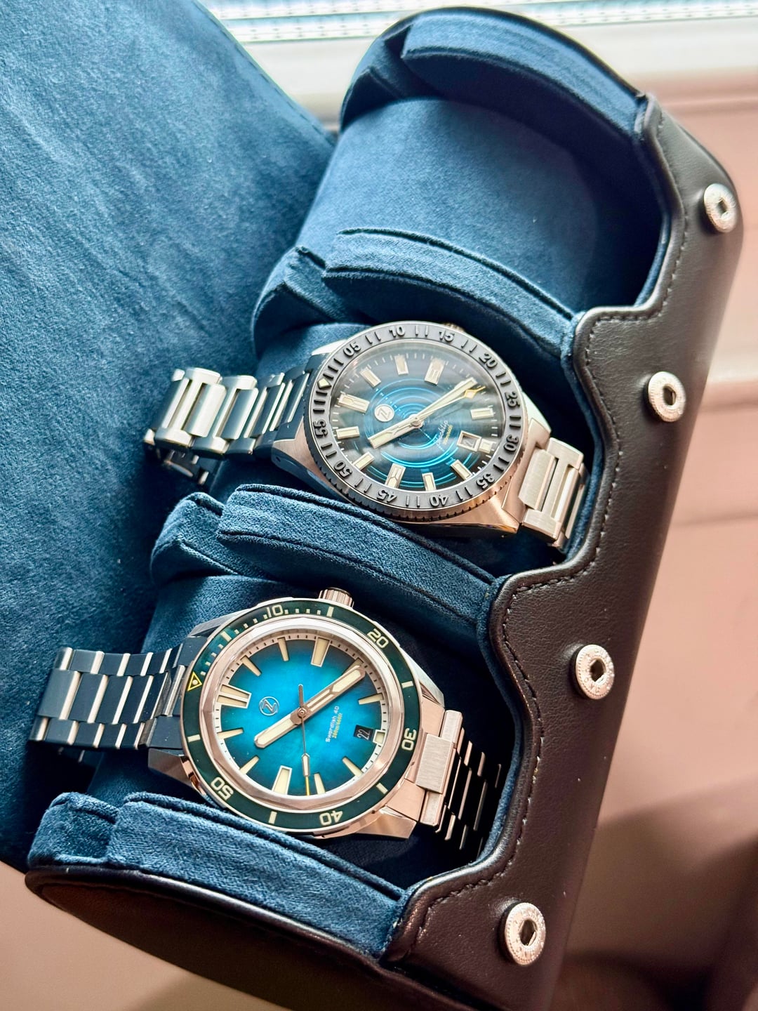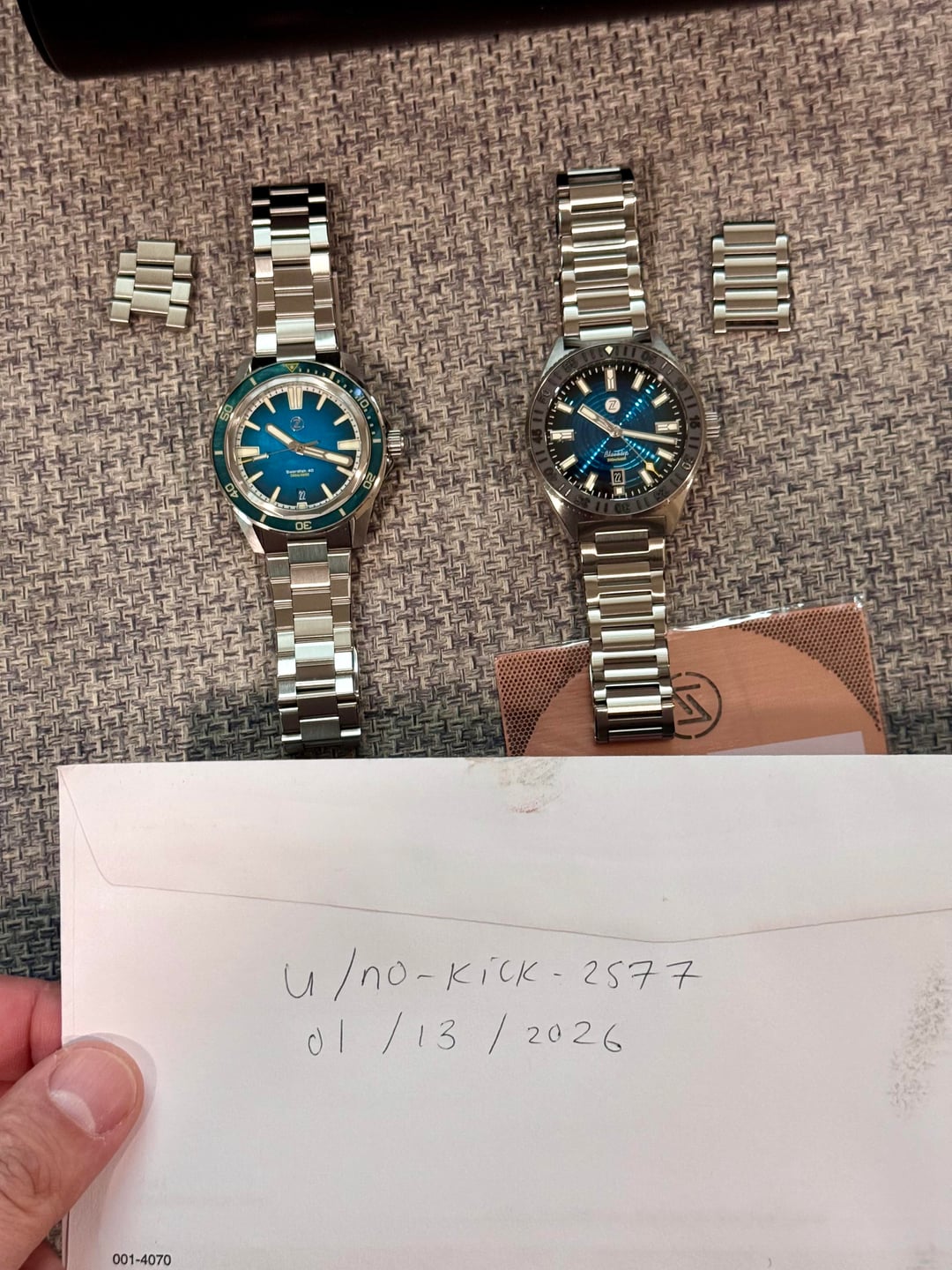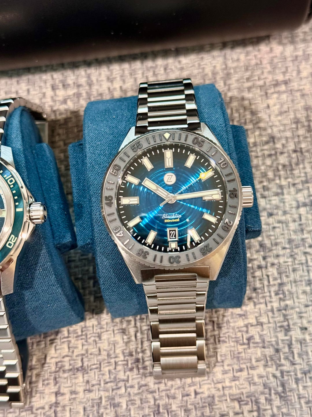 Hello WatchEx, Love teal watches? Love a stunning/mesmering watch dial? You’re in the right place. Up for sale are my two mint condition Zelos teal watches. The teal mother of pearl Swordfish came out last year and last I checked is trading for bonkers prices on eBay. The Whirlpool came out in December 2025. Both of these are mint. The Whirlpool is complete with warranty card and all links. The Swordfish is sized for a 7.5 inch wrist and has some room with the on the fly clasp, and it comes with three additional links but they are missing the screw pins. It is also missing the warranty card. Both watches will come in the one 3-watch Zelos travel roll that came with my Whirlpool, it is basically brand new. Both of these watches are mint. $850 zelled shipped within CONUS. This is a great deal for both, and these two watches will never be released in their current configurations again. Both are wonderful robust stainless steel dive watches with uber comfortable bracelets with on the fly adjustment. Both will put constant smiles on your face. Timestamp/video: https://imgur.com/a/H7XHfr5 Reach out with any questions!