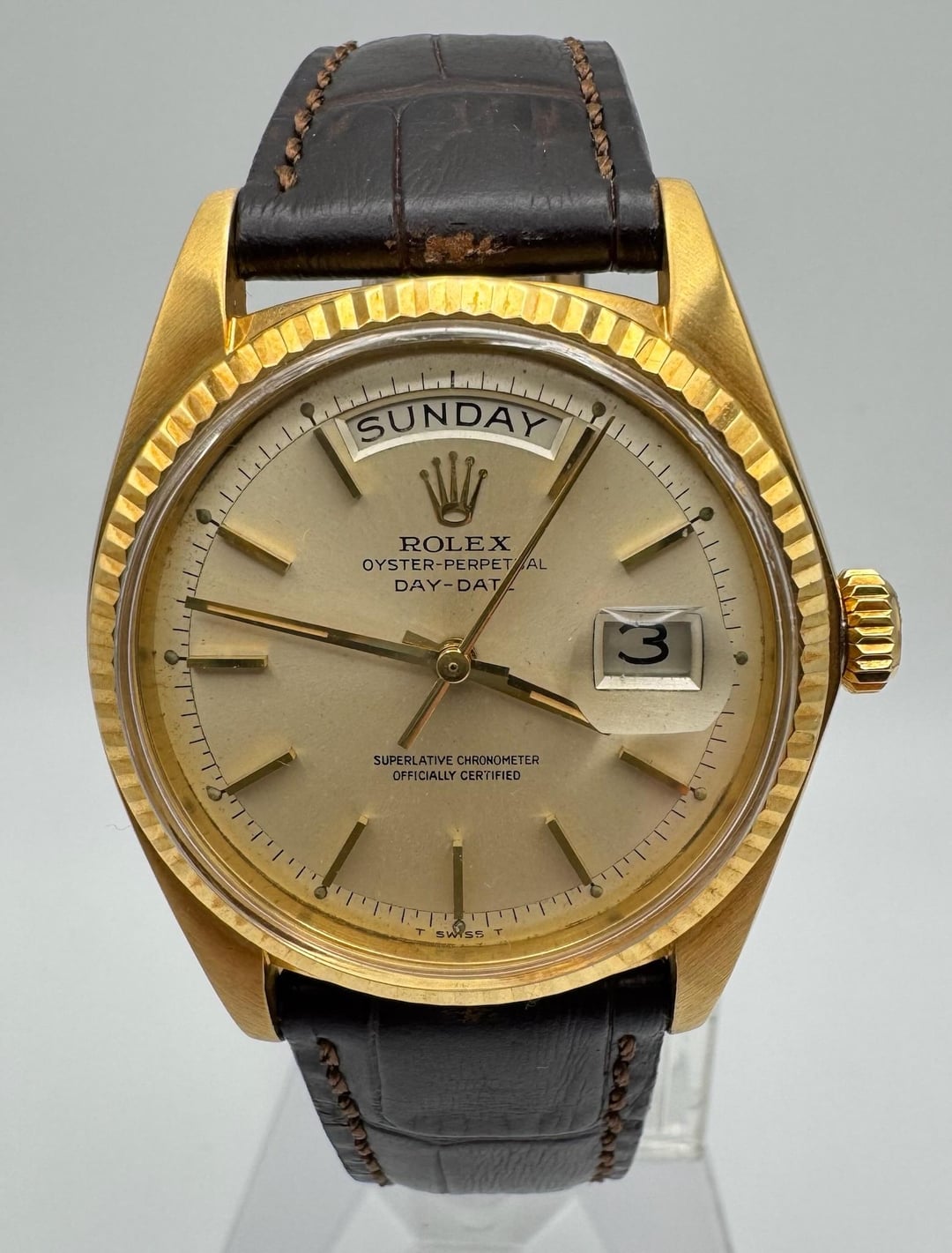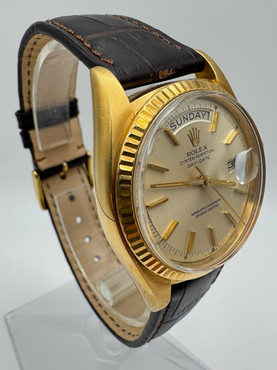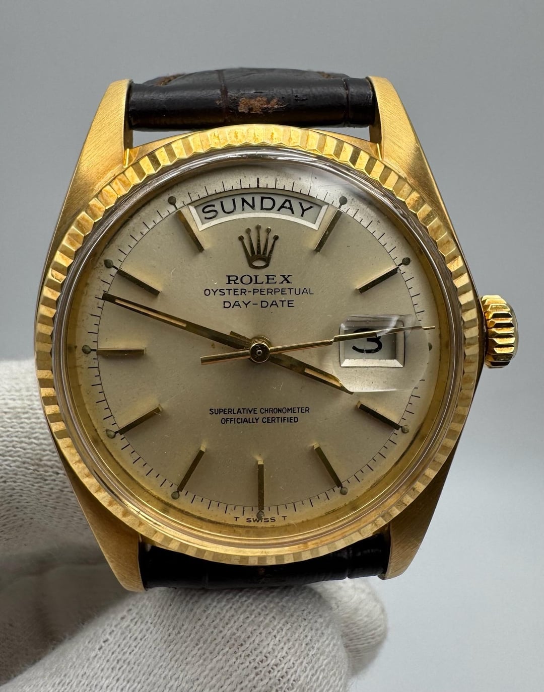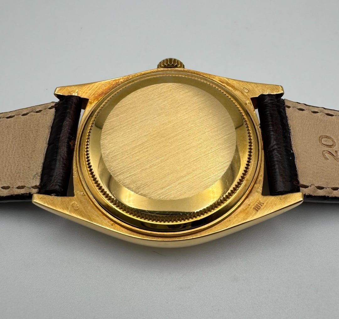 Rolex Day-Date 1803 in 18K yellow gold, fully original and presented in very good overall condition. The case retains thick, sharply defined lugs and was polished in the past by the previous owner. The fluted bezel remains crisp and in excellent condition. The period-correct silver dial has aged attractively, developing a warm patina, with all tritium plots present and intact. The movement was last serviced in January 2025 and runs properly, and the watch passed a 3ATM (30m) pressure test in November 2025. It is fitted with a 20/16mm brown alligator strap paired with a gold-plated Rolex pin buckle. All case numbers are fully visible and intact, with a 4.1 million serial placing production around 1974. **Reference:** 1803 **Size:** 36mm **Year:** 1974 📜 Includes: Custom [travel pouch](https://bogossia.com/products/travel-carrying-case) ($50+ value) 💵 Price: $8,150 + FREE overnight shipping with FedEx fully insured. [Timestamp](https://imgur.com/a/JlxjUfm) 🔗 Other Listings: [profile](https://www.reddit.com/u/BoghossianJewelry/s/vm81HAdB7o) | [watchrecon](https://www.watchrecon.com/?query=BoghossianJewelry&last_days=0) 🔥 Follow us on [Instagram](https://www.instagram.com/bogossiajewelers) 📍 Location: New York 🔒 Authenticity: 100% guaranteed, buy with confidence. We have 160+ reviews on Chrono24 with 180+ transactions, and Excellent rating score on Trustpilot. Visit our [profile](https://www.reddit.com/u/BoghossianJewelry/s/vm81HAdB7o) for links and references. 📦 Domestic Shipping: Ships with FedEx overnight, within 24 business hours of payment, from New York, NY to CONUS. The shipment is fully insured against damage, loss or theft. 🌍 International Shipping: Incurs an additional $100. 💳 Payment: Crypto (+2%), PayPal/CC (+4%), Web, or Face-to-face deal in NY. 🔐 [Seller References](https://bogossia.com/authenticity) 📸 [IG: @bogossiajewelers](https://www.instagram.com/bogossiajewelers)
