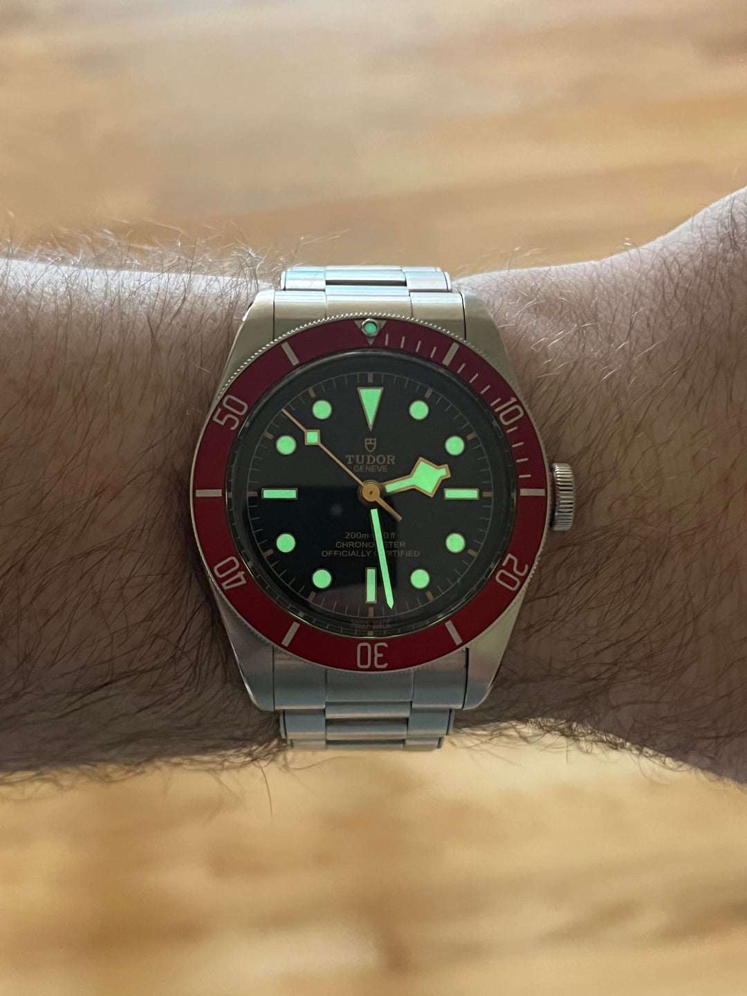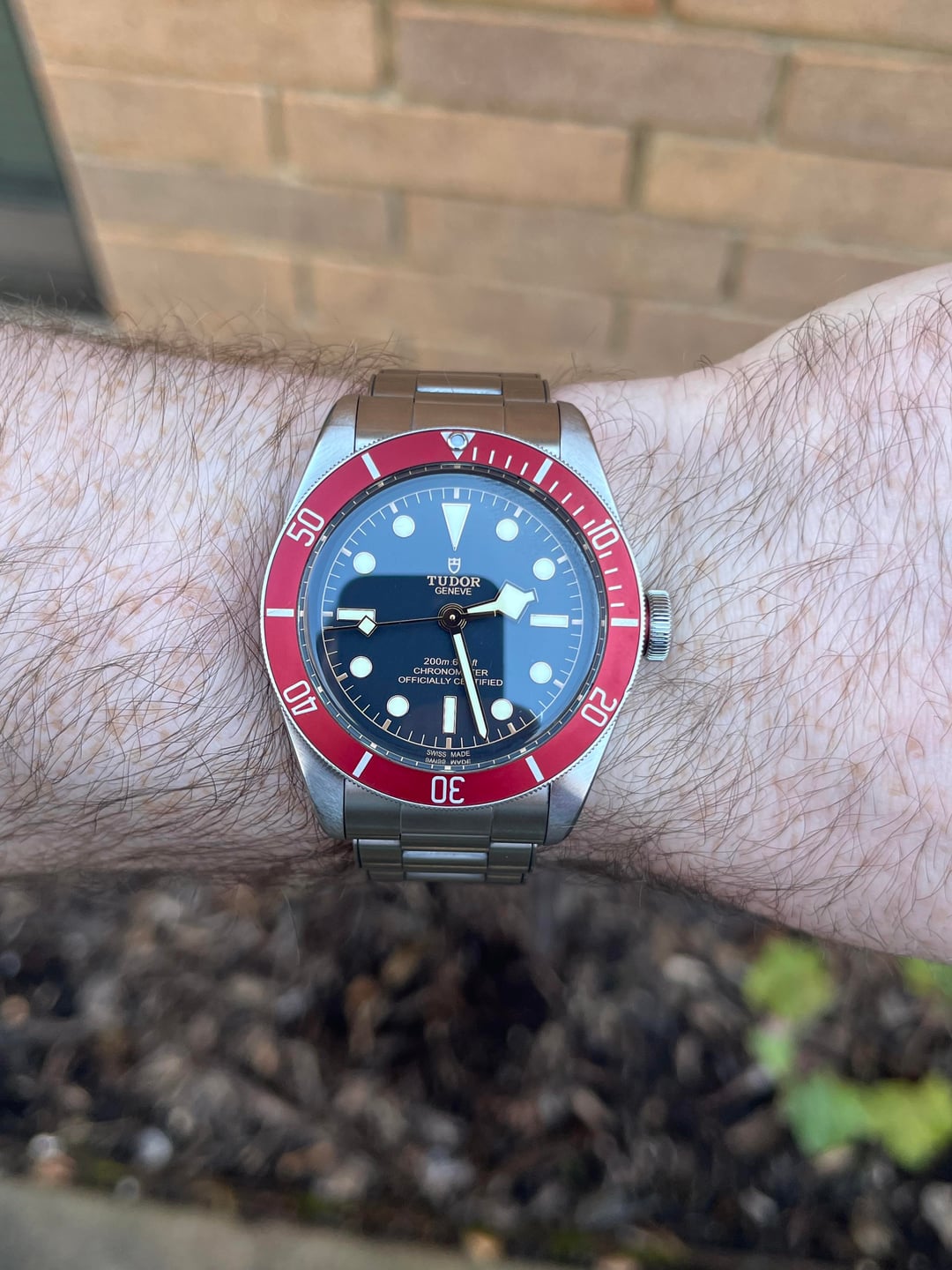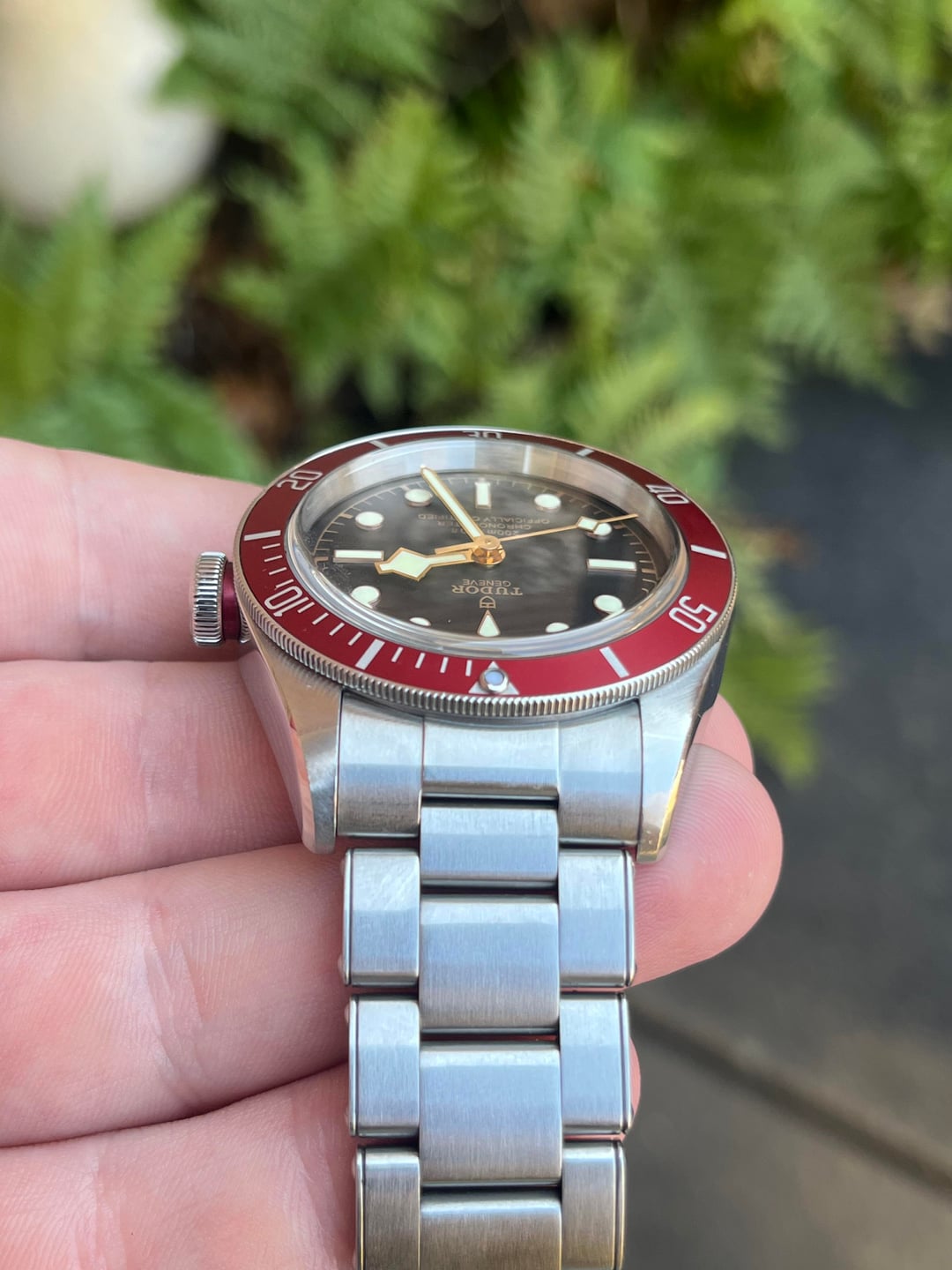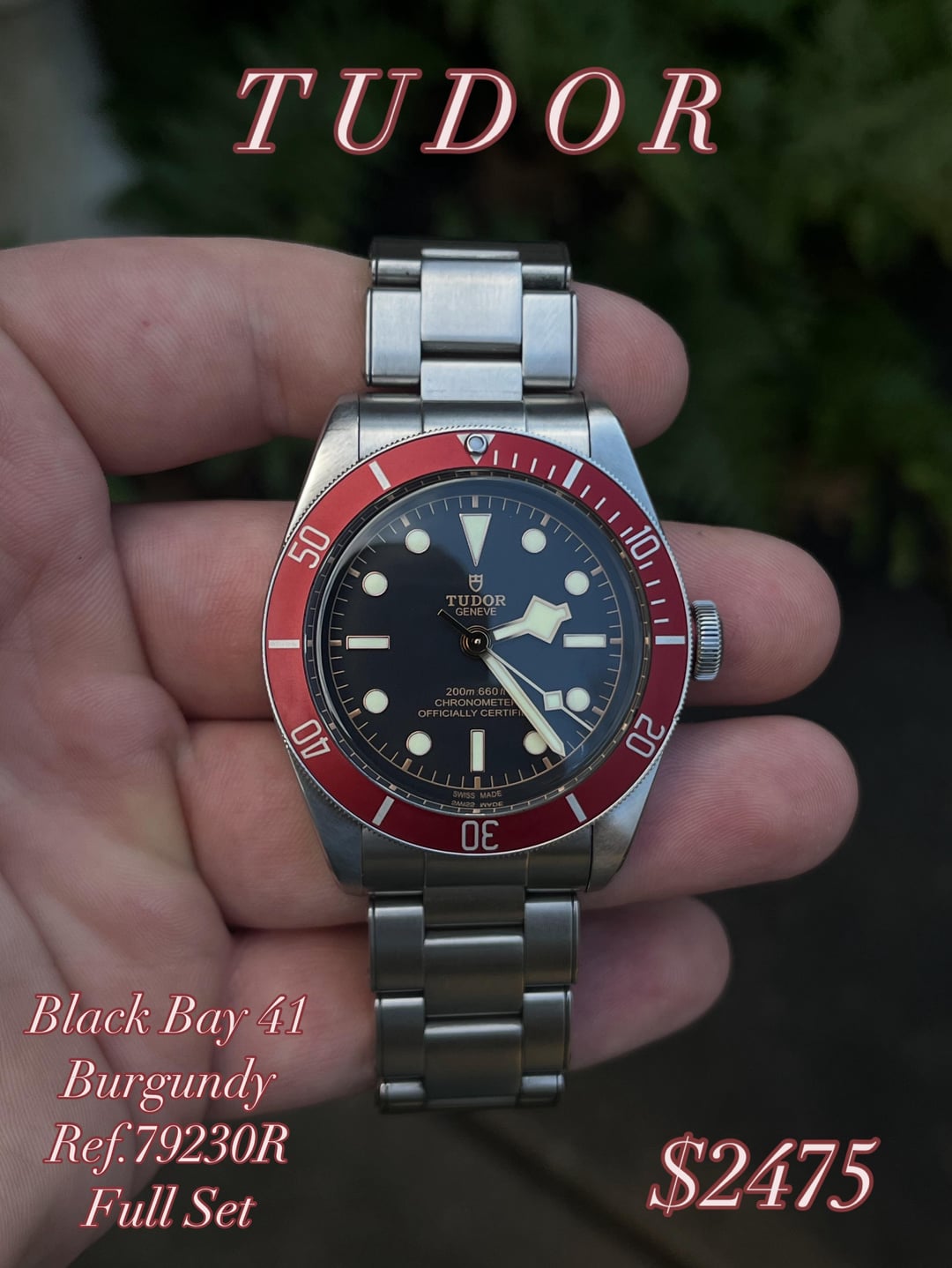 – FOR SALE – 2021 Tudor Black Bay 41 Burgundy ref. 79230R FULL SET (Original Box & Card + Manuals) Condition: Pre-Owned (Great) Case Specs: • Case Material: Stainless Steel • Case Diameter: 41mm • Case Thickness: 14.5mm • Lug Width: 22mm • Water Resistance: 200m • Bezel: Aluminum 60-click unidirectional diver • Crown: Screw-down • Crystal: Sapphire Movement Specs: • Movement: Tudor MT5602 (COSC) • Power Reserve: 70 hours • Jewels: 25 • VPH: 28,800 • Type: Automatic Asking $2,475 CONUS OBO DMs open for price and shipping negotiations Located in Arkansas, USA