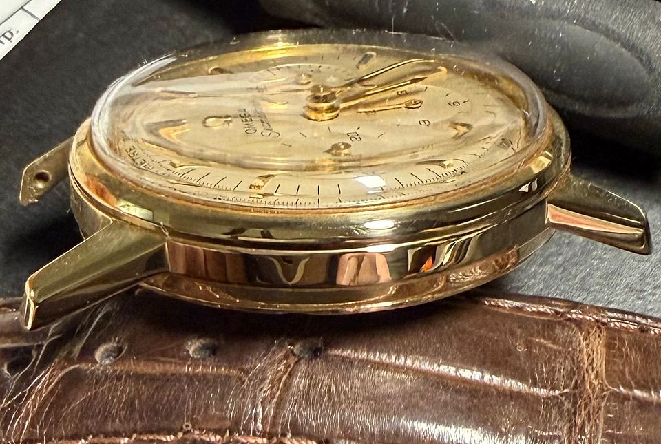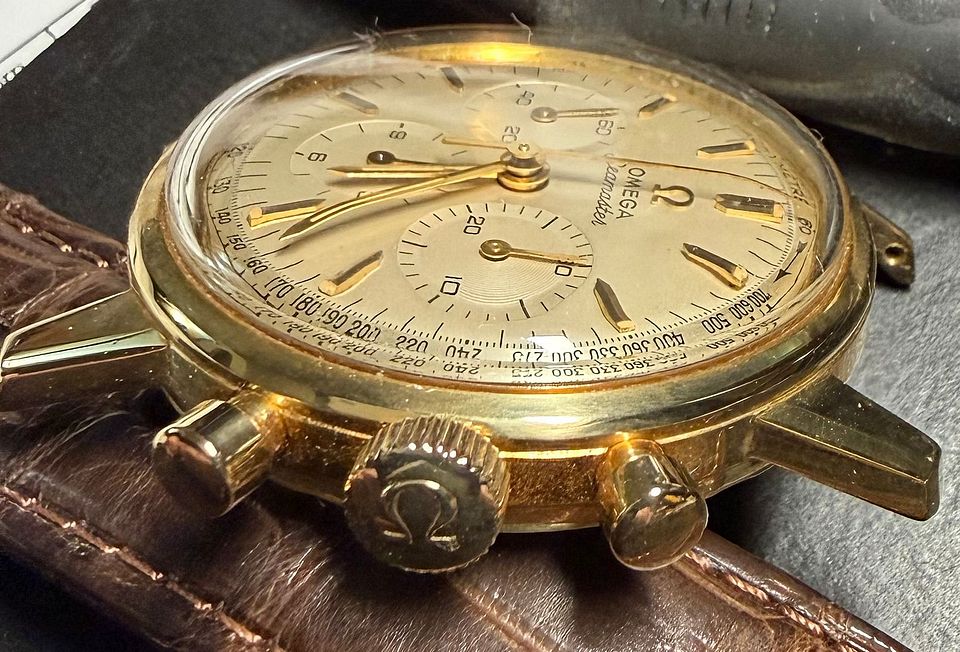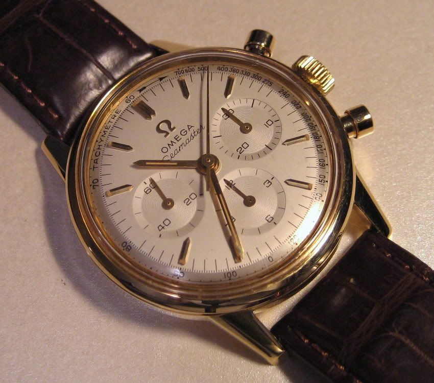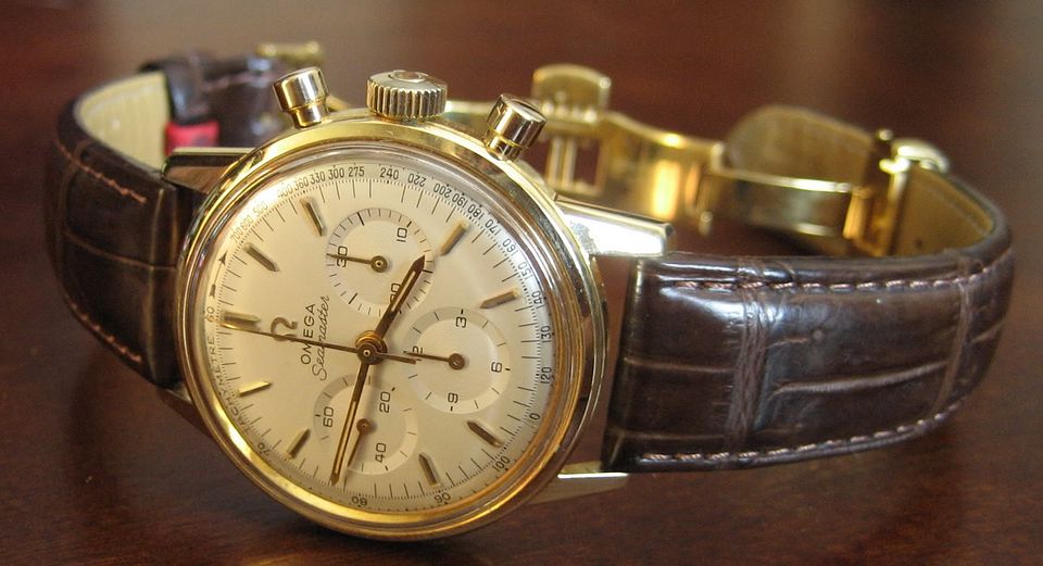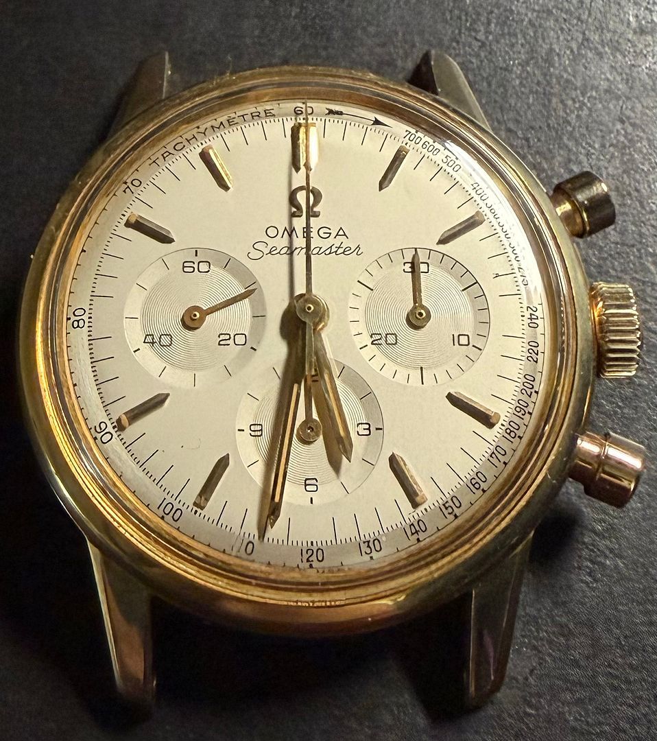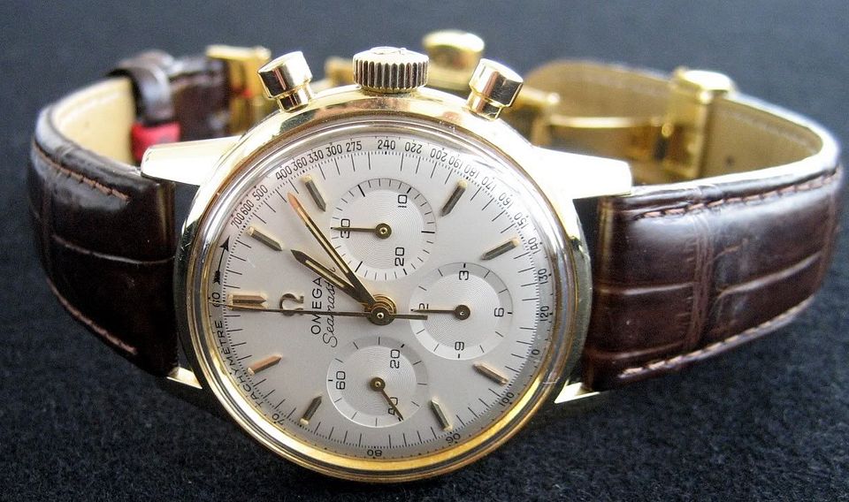 For sale is my *all original* 1963-ish Omega 321 Seamaster chronograph in solid 14k gold. All original including 321 movement and the dial which is VERY hard to find in this condition. Vast majority of these have been redialed (rather poorly imo) or are original with bad staining. This one still looks good. Keeps good time and runs well. Chrono function works as it should and resets perfectly. It dates from approximately 1963 and I've owned it for about 20 years. Had the movement serviced about 15 years ago without a polish. I prefer not to polish vintage watches but the light scratches and scuffs present could be polished out if you like. It presents well as is imo.
