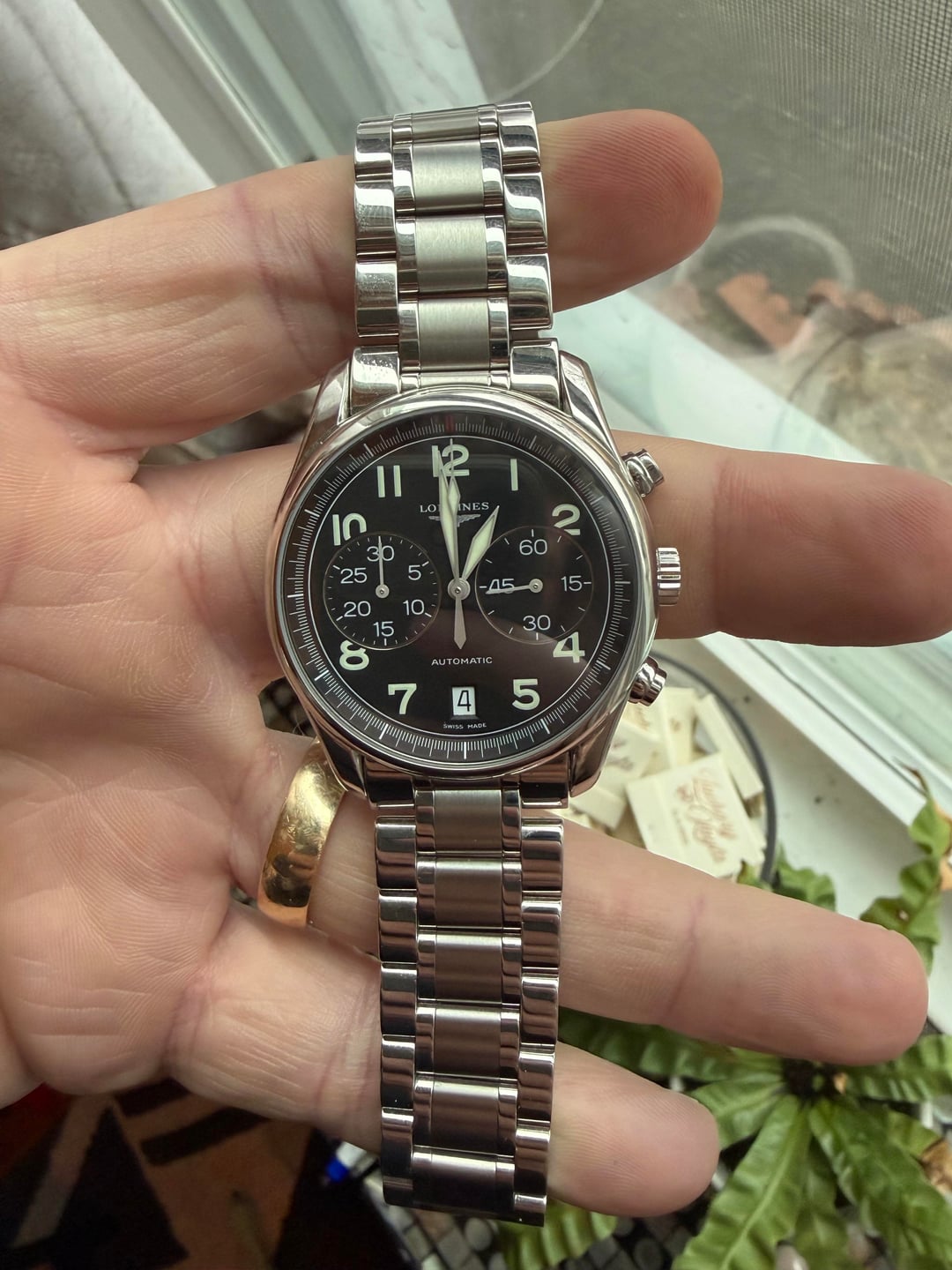 Longines Avigation Chronograph 40mm, black dial reference L2.629.4 Watch is running strong and keeping great time. Lightly used condition. I was told it was serviced not long before I bought it last year. It comes with an OEM leather strap and a barely used master collection steel bracelet ordered directly from swatch group for $400. This is the thinnest chronograph with a date I own. The bracelet fits perfectly and gives it a more sporty look. This watch will fit up to an 8+ inch wrist on leather and on steel. $1400 +shipping I have some experience buying, selling and shipping watches. My account is newer, so I’m willing to do a FaceTime or whatever it takes to make buyer comfortable. I will ship FedEx “hold at location” and will require a picture of your ID. I will also share a picture of mine. I accept Zelle, cash app, PayPal F&F and G&S(+4.5%). If you’d like to meet in person I’m located in southern CT.