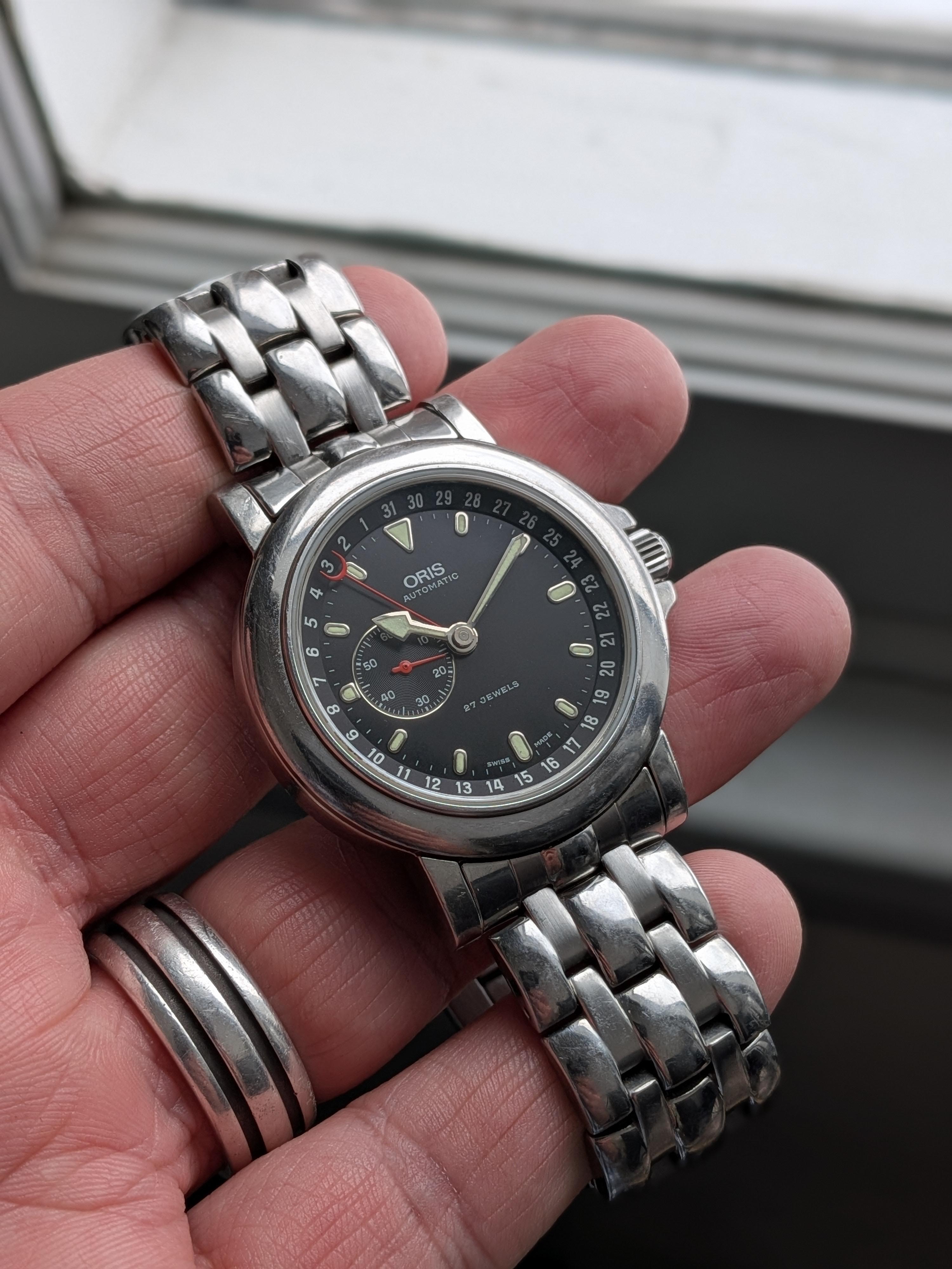 Hello everyone! Up for sale is this fantastic neo-vintage reverse pointer date from Oris. This model is relatively rare, only made for a year or two (from what I've read). I picked this up locally from the original owner who bought it new and kept great care of it. This example is in excellent all original condition, including retaining its hidden clasp bracelet. It was worn and not stashed away, so there are some scuffs and signs of wear. Service history is unknown but it is currently running well. [Photos](https://imgur.com/a/fzJ8zRK) [Timestamp](https://imgur.com/gtcnAaN) * Case: 37mm Stainless Steel * Dial: Original * Crown: Original, Screw Down * Bracelet: Original, fits up to 7.5" * Movement: Oris Automatic **I’m asking $975 for this piece.** If interested, please consider following [Crooked River Vintage](http://www.instagram.com/crookedrivervintage) on Instagram for other vintage watch offerings. I will respond more quickly to inquiries via Instagram, Reddit can be difficult for me to check during the day. Please don't hesitate to DM me with specific questions or pic requests! **I will consider offers.** Asking price includes shipping CONUS via USPS Priority Mail. I prefer Zelle or PayPal F&F for payment. As with all vintage watches, exposure to water is not recommended and total accuracy and duration cannot be guaranteed. Unless otherwise noted service history is unknown. [Please check my profile for my other offerings!](https://www.reddit.com/user/farkasvirag/submitted/) Thanks and take care everyone!