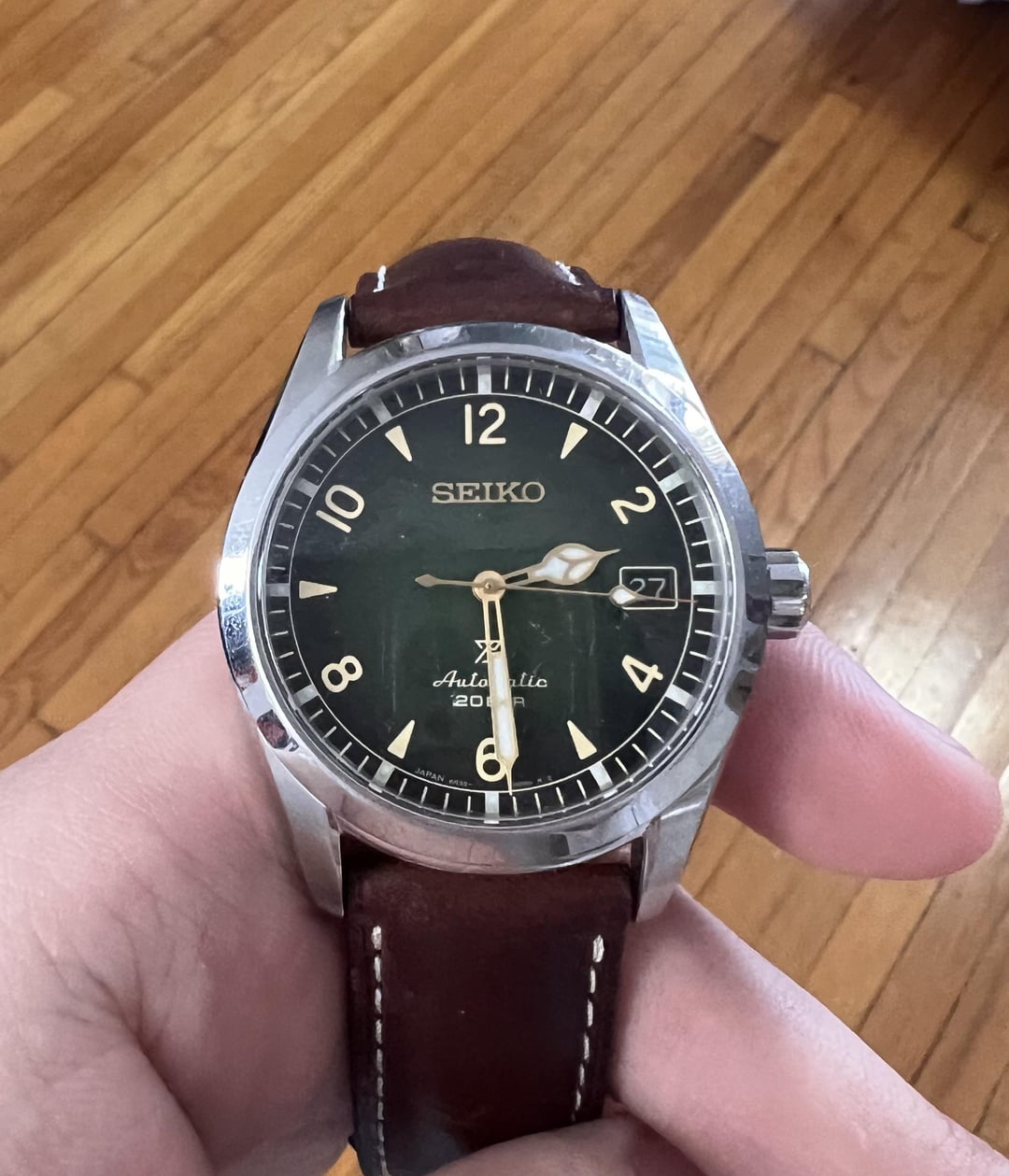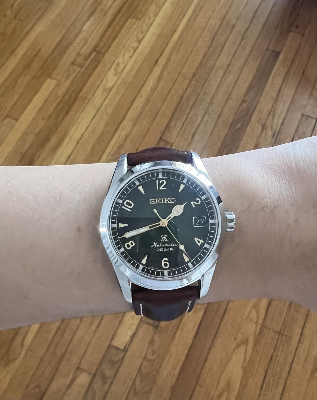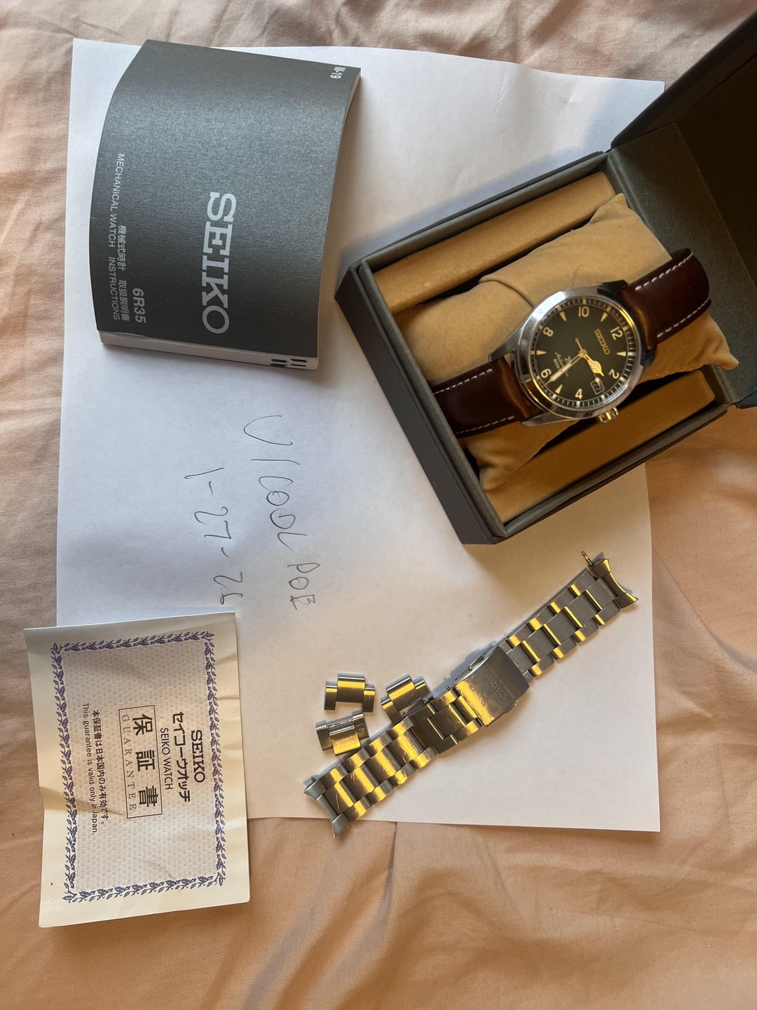 Hello hello r/Watchexchange Here I am selling my Seiko SPB155 "Baby Alpinist" I'm looking for 415$ (or roughly 400 + shipping, if you want to use your own shipping services that may be cheaper). Payment can be done by Zelle, Paypal F/F or Paypal G/S (granted you pay fees and only if you are established.) CONUS only please I'm pricing this below market as it's in good condition (but not excellent), bought in Nov 2020. There's a good amount of hairline scratches on the OEM bracelet which I will include. However I will also throw in the Tuns leather strap pictured on the watch. Perfect for any buyers who want the leather strap or will look to buy the Uncle Seiko bracelet in the future. In terms of performance, it runs well and I counted about a 10-15 second lost after a 24 hour period given the average performance of 6R35 movement. Otherwise, works perfect! I can provide more pictures, facetime, etc if you'd like. Feel free to PM me.