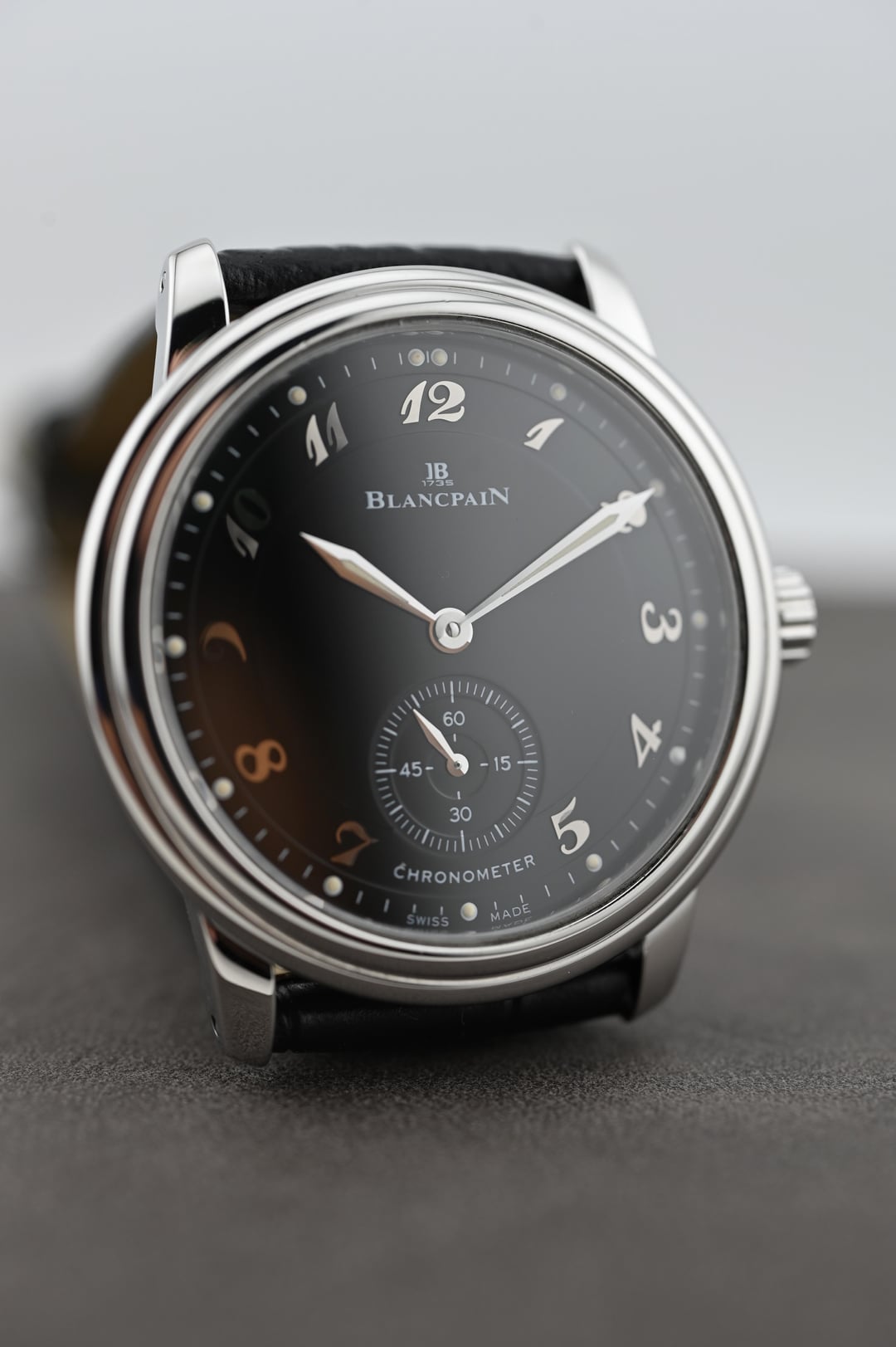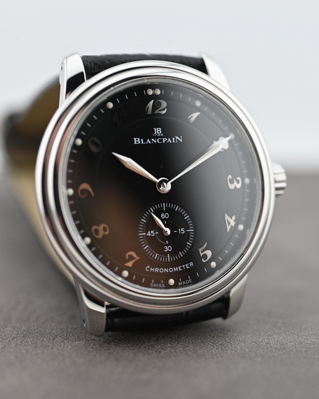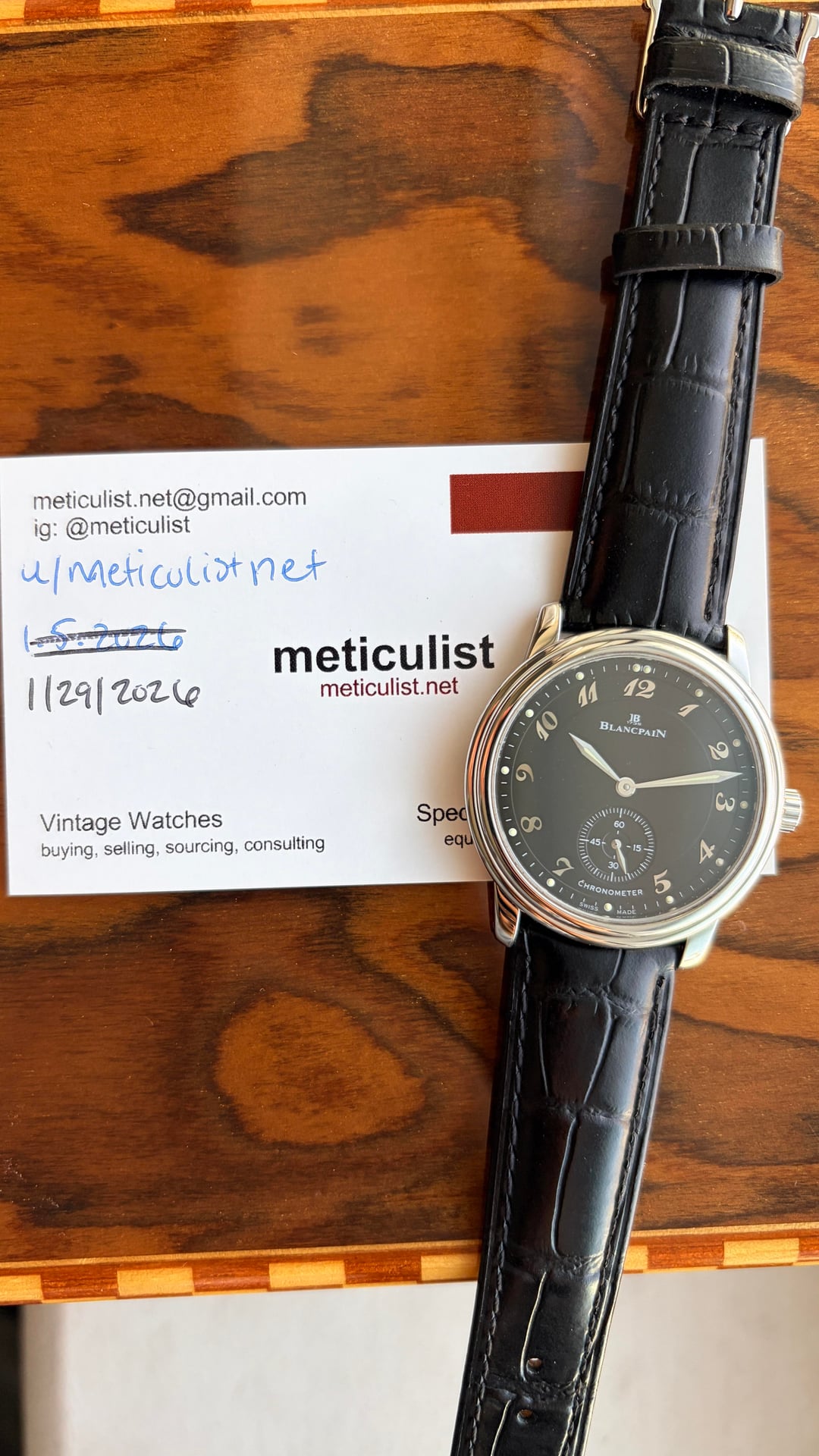 The rarest of the perennial favorite Reference 7002, featuring the a movement that was subject of numerous [**wonderful articles**](https://www.timezone.com/2002/09/16/the-a-b-cs-of-watch-finish/) and reviews of yesteryear. It is estimated that fewer than 1000 reference 7002’s were produced, and though it is currently unknown, my estimation is that is across all dial variants, white, blue, and black, with the black dial being the least frequent to come to market. **Reference:** Villeret Ultra Slim Chronometer Reference 7002 **Case**: The 36 × 40.8 mm stainless steel case is just 6.8mm thin with its thin signature double shoulder bezel and nicely sized signed crown. The 7002 was the brand’s first (and only at the time) stainless steel case to feature a sapphire caseback displaying the beautifully finished movement. The case is in nice condition throughout with, thick, full lugs, and minor hairlines present as photographed. **Dial:** The rich and deeply saturated black dial is as mysterious as it moody, with a mix of deep glossy and finely grained eggshell surfaces, that swallow the black polished applied Breguet numerals at various lighting angles. The original dial and hands are in excellent condition with minor specks of dust present on the dial only visible at certain angles due to the highly reflective nature of the surface. **Movement:** the manually wound Blancpain caliber 64-1 is a heavily modified and finished Pseaux 7001 that was Blancpain’s only certified chronometer at time of launch. The watch is winding, setting, and running well, averaging approximately -5 s/d. **Includes:** Presented on a signed Blancpain alligator strap with it’s original signed stainless steel pin buckle. **Price:** $8,900 USD including fully insured shipping from Phoenix, AZ to a FedEx Office location or commercial address within the continental US, international shipping available at cost based on location. Payment by ACH or wire, no trades please. I have all positive references here, [Chrono24](https://www.chrono24.com/dealer/meticulist/index.htm), forums, and [Instagram (@)meticulist](http://instagram.com/meticulist). All available watches can be found at [meticulist.net](http://meticulist.net/) Thanks mods for the space.