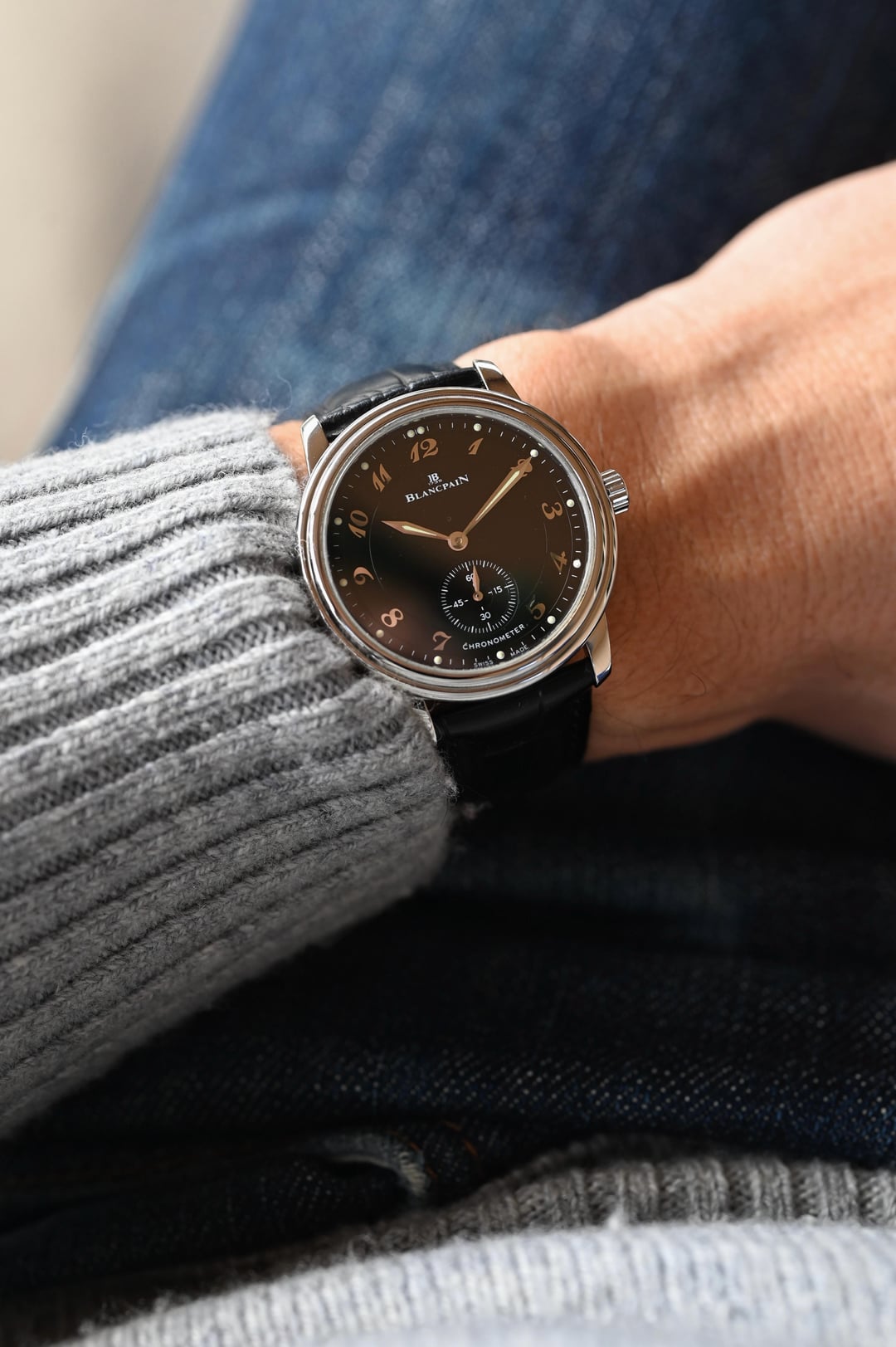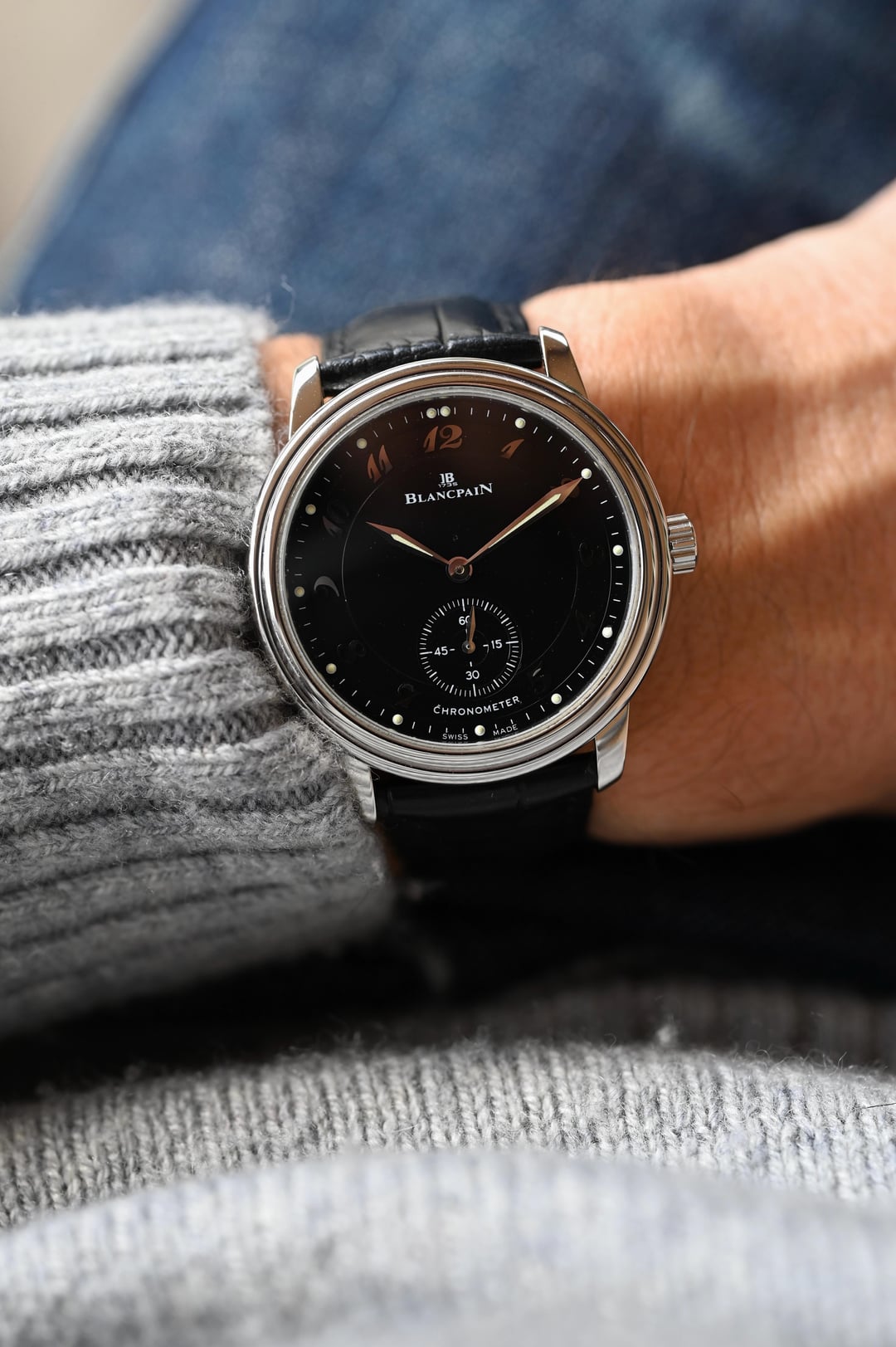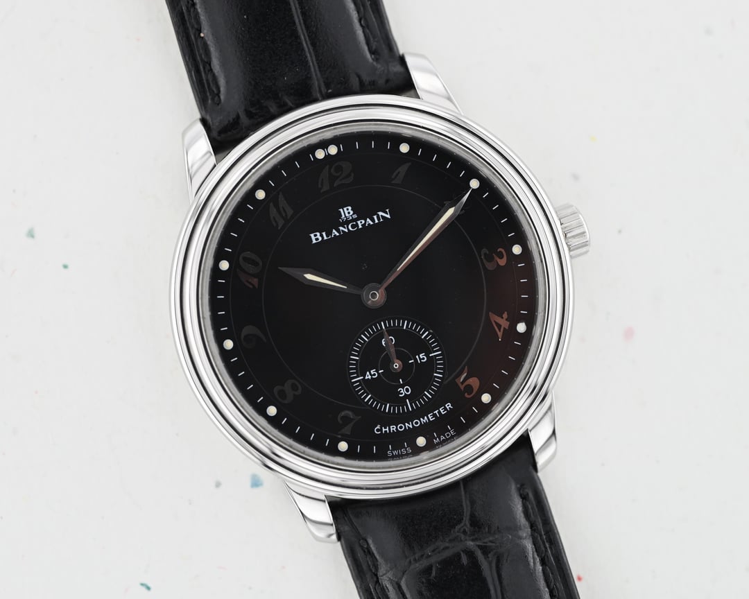 The rarest of the perennial favorite Reference 7002, featuring the a movement that was subject of numerous [**wonderful articles**](https://www.timezone.com/2002/09/16/the-a-b-cs-of-watch-finish/) and reviews of yesteryear. It is estimated that fewer than 1000 reference 7002’s were produced, and though it is currently unknown, my estimation is that is across all dial variants, white, blue, and black, with the black dial being the least frequent to come to market. **Reference:** Villeret Ultra Slim Chronometer Reference 7002 **Case**: The 36 × 40.8 mm stainless steel case is just 6.8mm thin with its thin signature double shoulder bezel and nicely sized signed crown. The 7002 was the brand’s first (and only at the time) stainless steel case to feature a sapphire caseback displaying the beautifully finished movement. The case is in nice condition throughout with, thick, full lugs, and minor hairlines present as photographed. **Dial:** The rich and deeply saturated black dial is as mysterious as it moody, with a mix of deep glossy and finely grained eggshell surfaces, that swallow the black polished applied Breguet numerals at various lighting angles. The original dial and hands are in excellent condition with minor specks of dust present on the dial only visible at certain angles due to the highly reflective nature of the surface. **Movement:** the manually wound Blancpain caliber 64-1 is a heavily modified and finished Pseaux 7001 that was Blancpain’s only certified chronometer at time of launch. The watch is winding, setting, and running well, averaging approximately -5 s/d. **Includes:** Presented on a signed Blancpain alligator strap with it’s original signed stainless steel pin buckle. **Price:** $8,900 USD including fully insured shipping from Phoenix, AZ to a FedEx Office location or commercial address within the continental US, international shipping available at cost based on location. Payment by ACH or wire, no trades please. I have all positive references here, [Chrono24](https://www.chrono24.com/dealer/meticulist/index.htm), forums, and [Instagram (@)meticulist](http://instagram.com/meticulist). All available watches can be found at [meticulist.net](http://meticulist.net/) Thanks mods for the space.