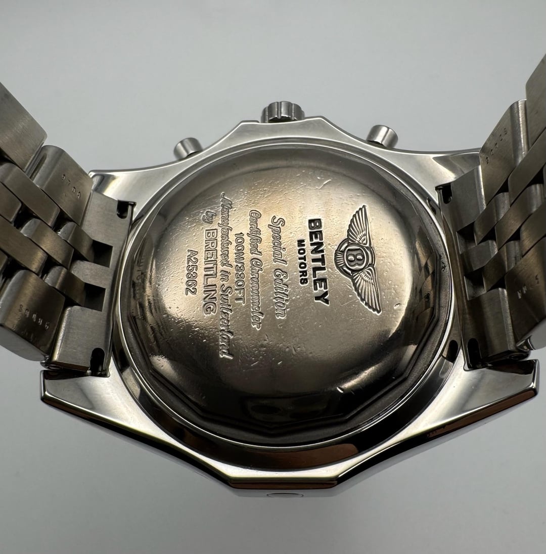 This rare Breitling for Bentley Ref. A25362 is presented in all-original, full stainless steel configuration and remains in very good overall condition. The case shows only minimal signs of wear, retaining strong lines and an honest, well-preserved finish throughout. The watch features a striking and uncommon original purple dial, preserved in pristine condition and offering a distinctive presence within the Breitling for Bentley collection. The crystal shows a light scratch near the bottom edge, visible only from certain angles and consistent with careful use. Powering the watch is Breitling’s unusual 30-second chronograph configuration, functioning correctly and adding a unique technical character to the model. The movement was professionally serviced in January 2026 and is running properly. The original steel bracelet remains tight with no stretch, reflecting limited wear over time. This example is accompanied by its original Breitling certificate and papers dated 2006, making it a compelling offering for collectors seeking a scarce and distinctive Breitling for Bentley reference. **Reference:** A25362 **Size:** 48mm **Year:** 2006 📜 Includes: Original papers 💵 Price: $5,625 + FREE overnight shipping with FedEx fully insured. [Timestamp](https://imgur.com/a/70ZBNxg) 🔗 Other Listings: [profile](https://www.reddit.com/u/BoghossianJewelry/s/vm81HAdB7o) | [watchrecon](https://www.watchrecon.com/?query=BoghossianJewelry&last_days=0) 🔥 Follow us on [Instagram](https://www.instagram.com/bogossiajewelers) 📍 Location: New York ✉️ Email: [email protected] 🔒 Authenticity: 100% guaranteed, buy with confidence. We have 160+ reviews on Chrono24 with 180+ transactions, and Excellent rating score on Trustpilot. Visit our [profile](https://www.reddit.com/u/BoghossianJewelry/s/vm81HAdB7o) for links and references. View [reddit feedback](https://watchcharts.com/repcheck/reddit/BoghossianJewelry/feedback) and [reddit transactions](https://www.reddit.com/r/watchexchange/wiki/confirmations/boghossianjewelry). 📦 Domestic Shipping: Ships with FedEx overnight, within 24 business hours of payment, from New York, NY to CONUS. The shipment is fully insured against damage, loss or theft. 🌍 International Shipping: Incurs an additional $100. 💳 Payment: Crypto (+2%), PayPal/CC (+4%), Web, or Face-to-face deal in NY. 🔐 [Seller References](https://bogossia.com/authenticity) 📸 [IG: @bogossiajewelers](https://www.instagram.com/bogossiajewelers)