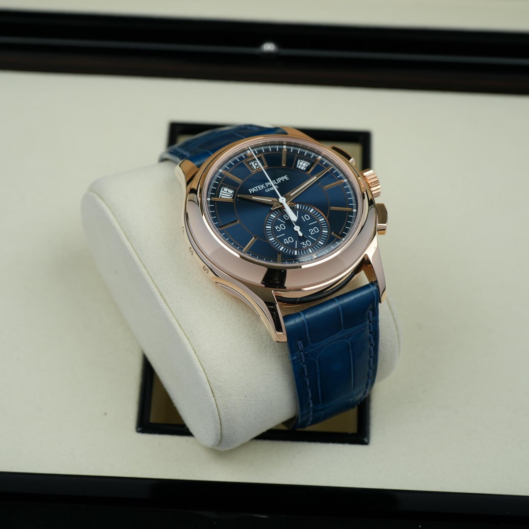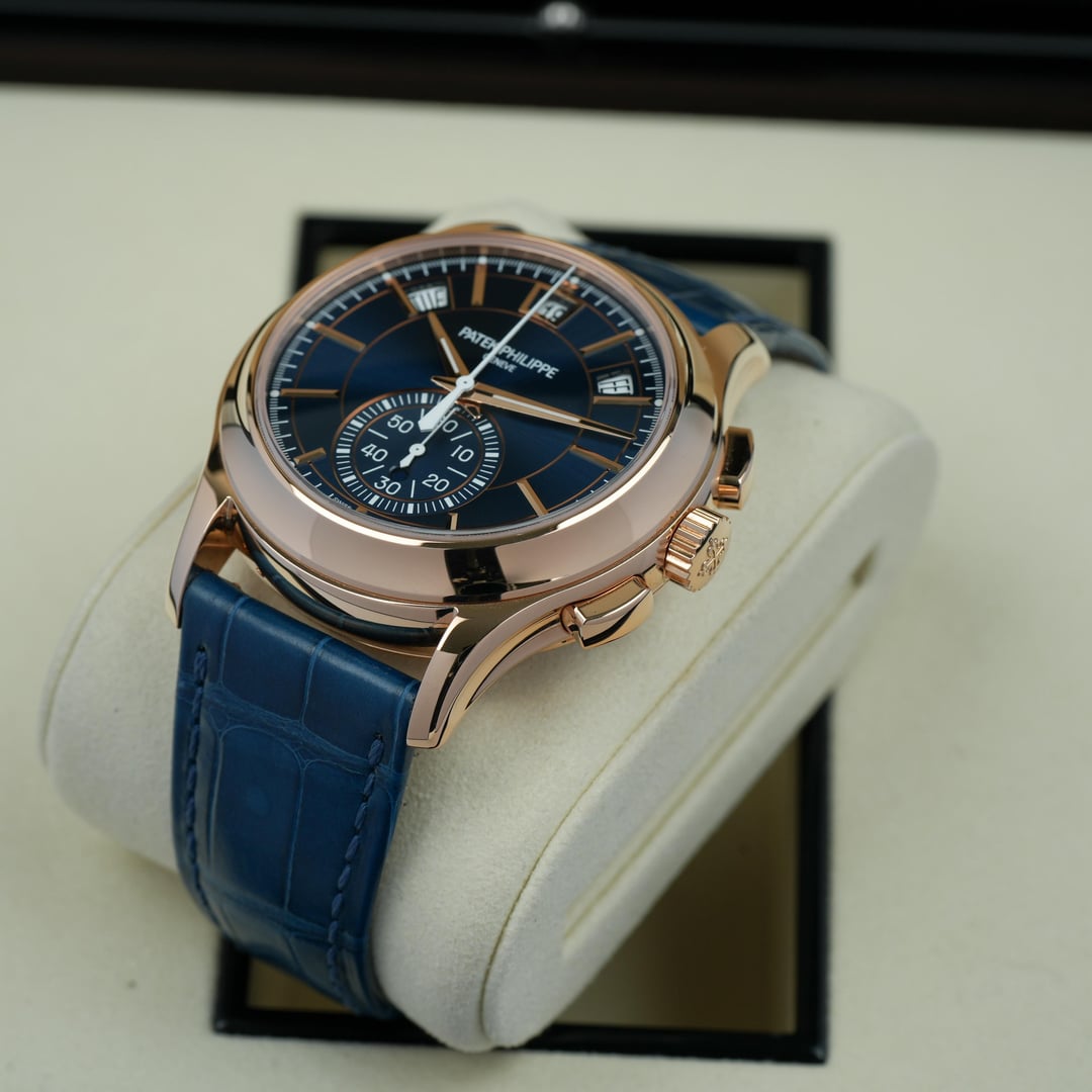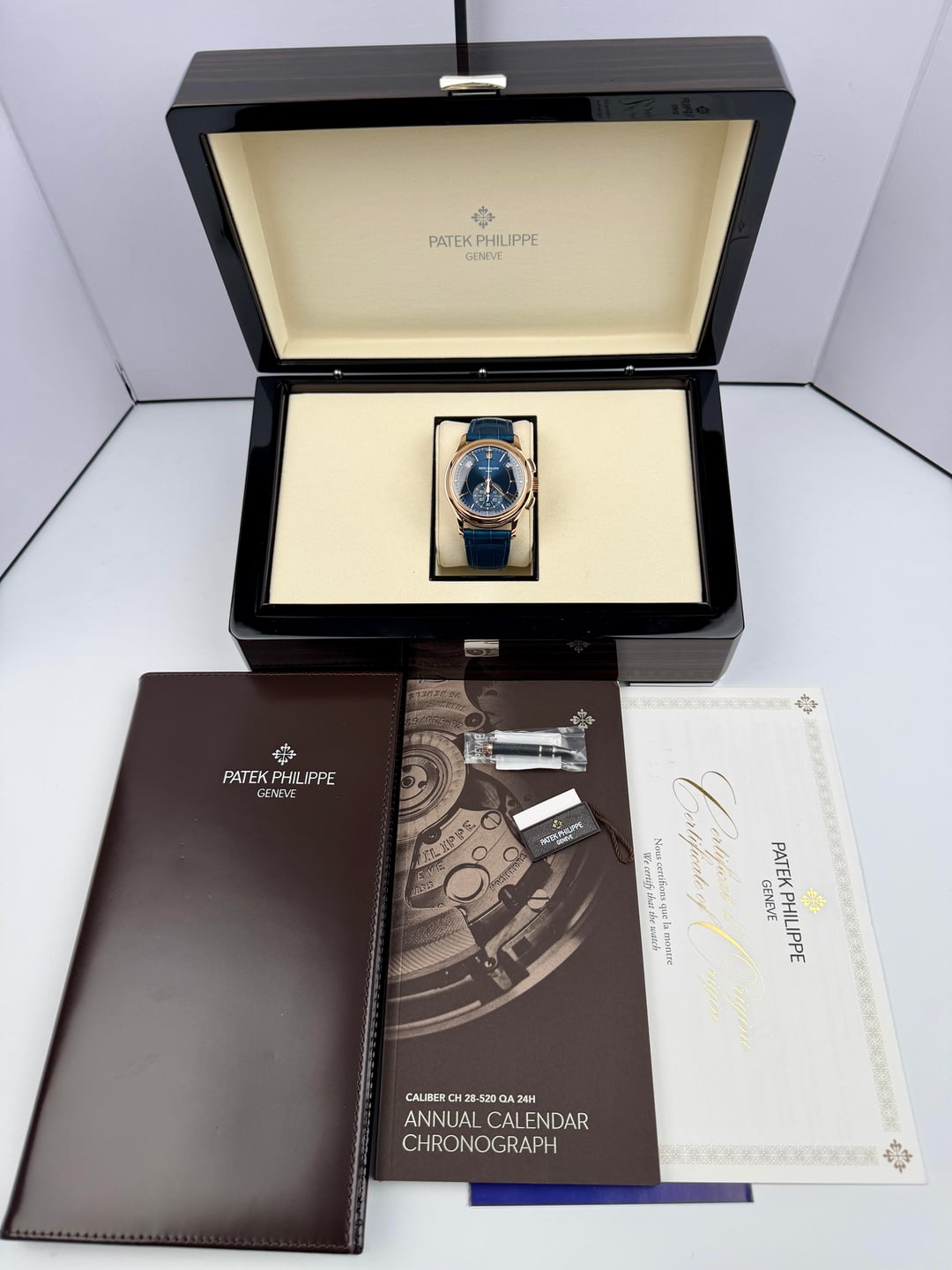 2025 Patek Philippe Complications Flyback Chronograph Annual Calendar 5905R-010 Complete Set Timestamp: [https://imgur.com/0n9lbvA](https://imgur.com/0n9lbvA) The Patek Philippe Annual Calendar Chronograph Ref. 5905R-010 represents one of the manufacture’s most compelling modern complications, seamlessly blending technical sophistication with contemporary elegance. Crafted in 18k rose gold, the 42mm case offers a confident yet refined presence on the wrist, perfectly balanced by Patek Philippe’s signature proportions and finishing. The watch features a striking sunburst blue dial, a highly sought-after configuration that elevates the model with depth, warmth, and modern appeal. Rose-gold applied hour markers and hands contrast beautifully against the dial, while the annual calendar display—showing day, date, and month—remains intuitively legible. A flyback chronograph complication is discreetly integrated, allowing instantaneous restart with a single press, underscoring the watch’s technical prowess. Powering the timepiece is the in-house automatic Caliber CH 28-520 QA 24H, visible through the sapphire caseback. Watch comes a complete set with Inner/Outer box, Booklet, Certificate of Origin, Pusher. Watch is overall in mint condition. Please look at my pictures as I like to fully represent the exact condition of the watch through my photography. **Offered at $74,999 shipped in US or OBO.** Payments accepted: Wire or Direct Bank Transfer (Bank of America). Shipping is always FedEx/UPS overnight, fully insured. I am an avid enthusiast and collector and am not affiliated with any watch brand I post. **Always open to trades or purchases! Looking for Audemars Piguet, Rolex, Patek Philippe, F.P. Journe, Vacheron Constantin, and other luxury brands.** I guarantee every watch I sell to be 100% authentic. Follow me on IG: JJ\_Timepiece\_Co Call or text (941) 800-3931