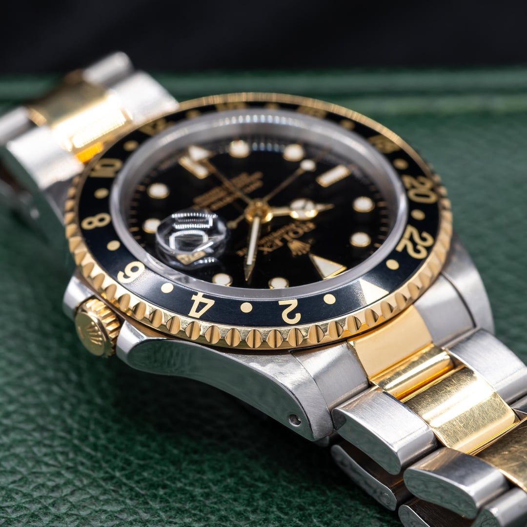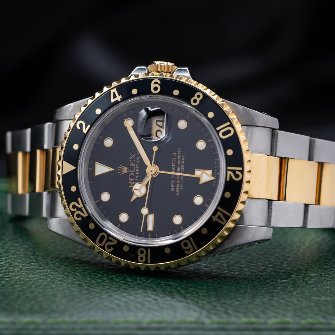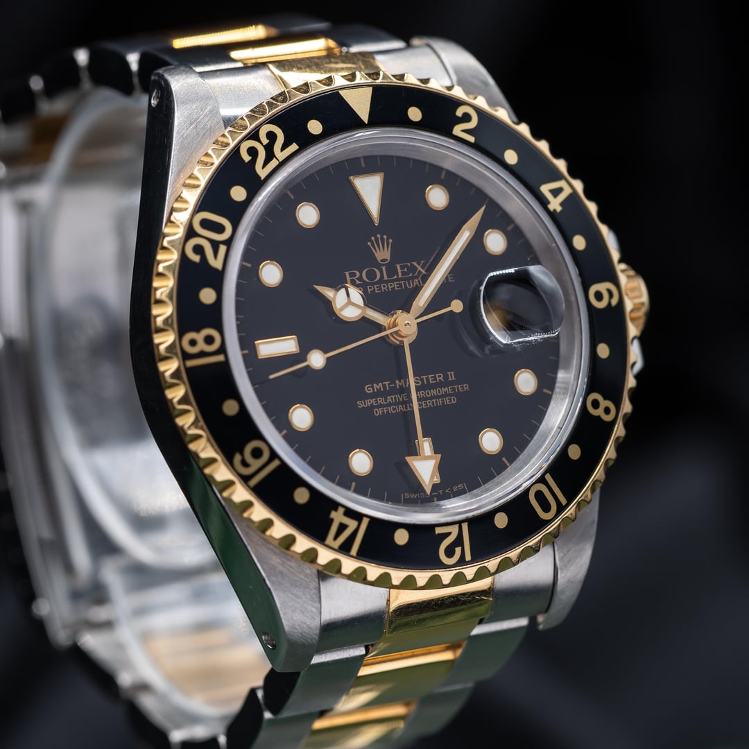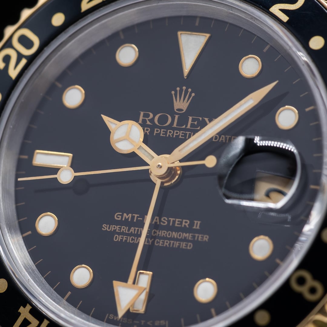 Rolex GMT-Master II Two Tone Gold Ceramic Bezel Black Dial Bidirectional Bezel