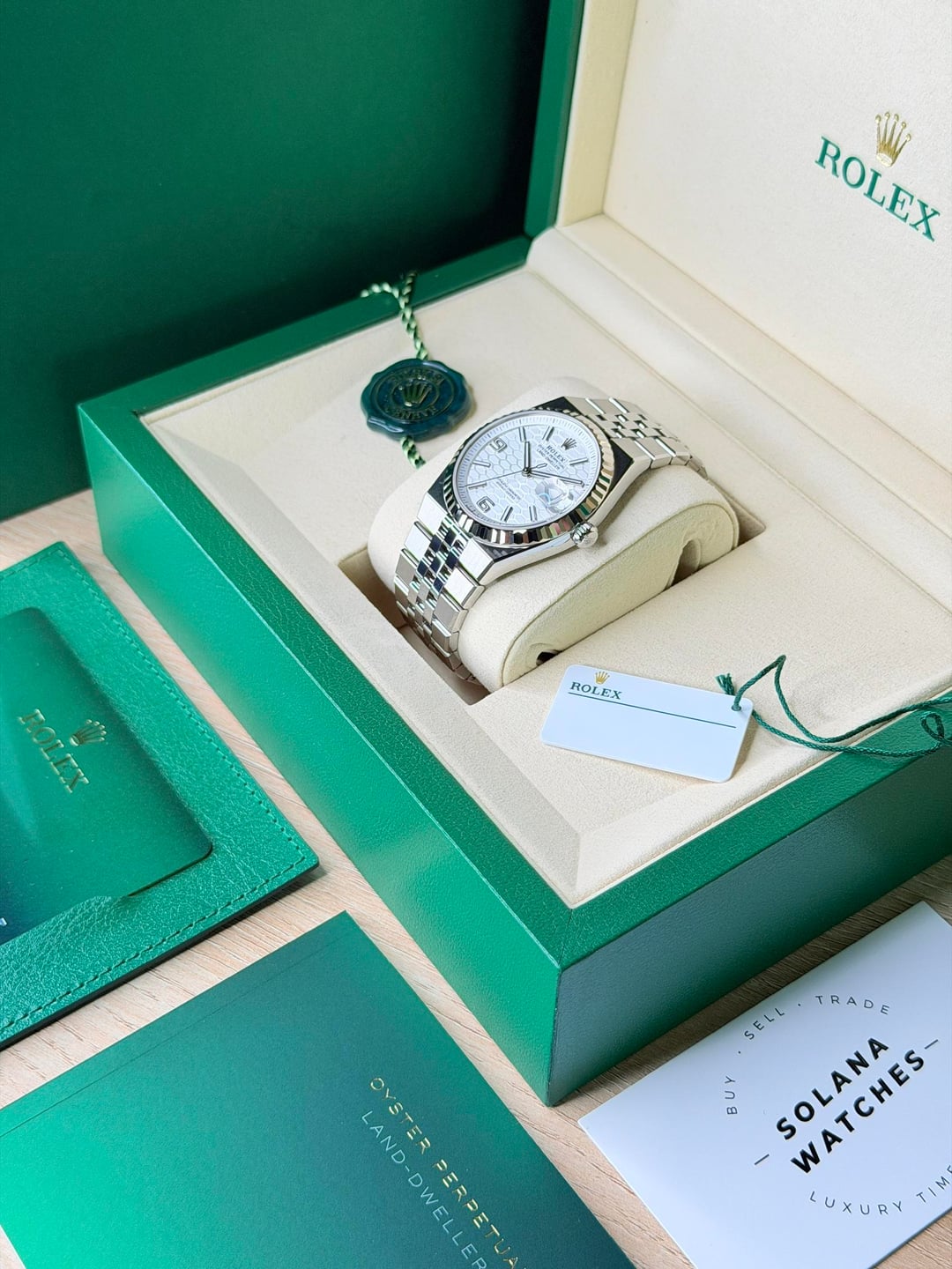 It comes as a full set, including the Rolex green box, outer box, manual, warranty booklet, leather wallet, serialized hangtag, green hangtag, and warranty card dated 1/2026.