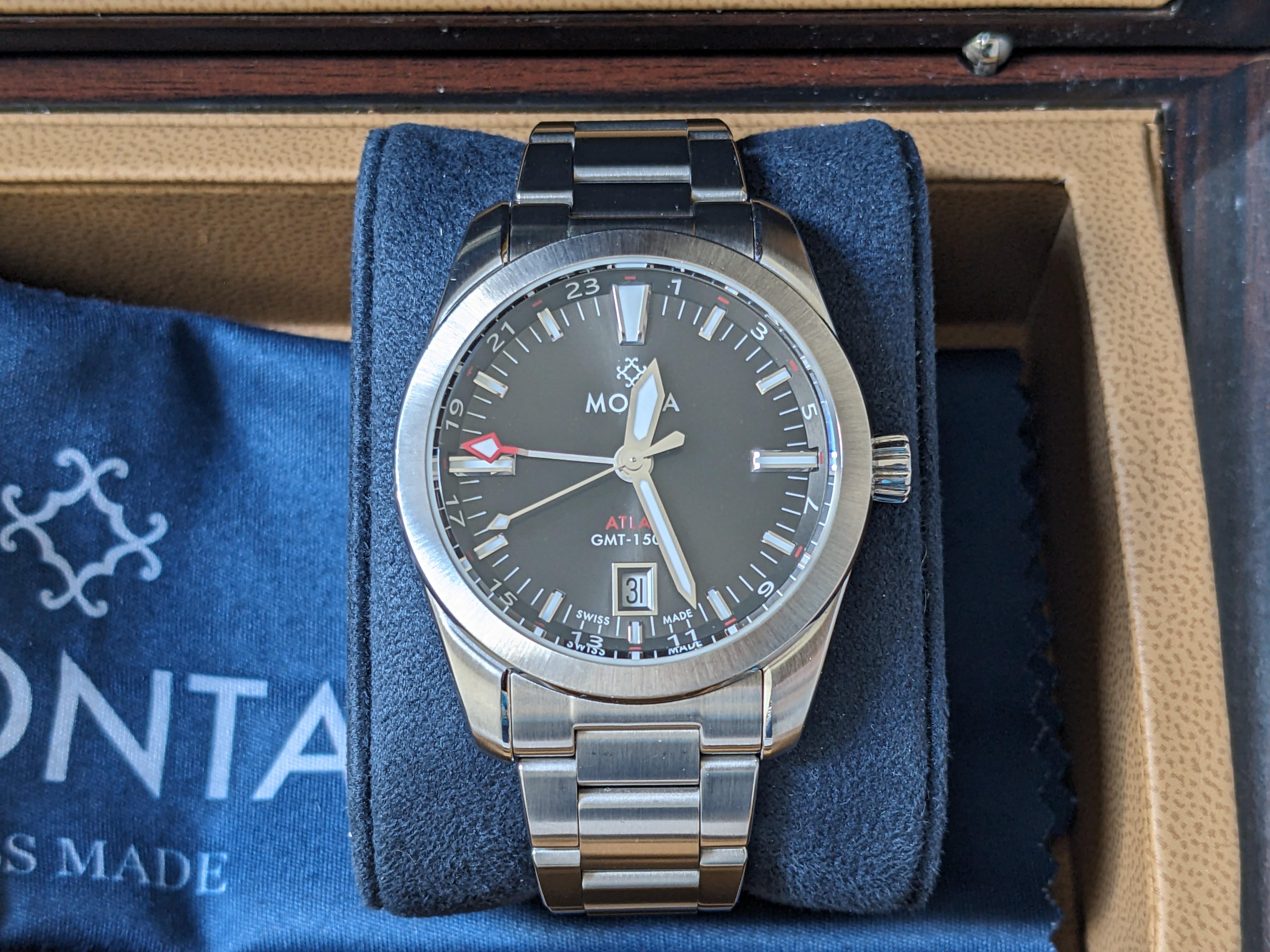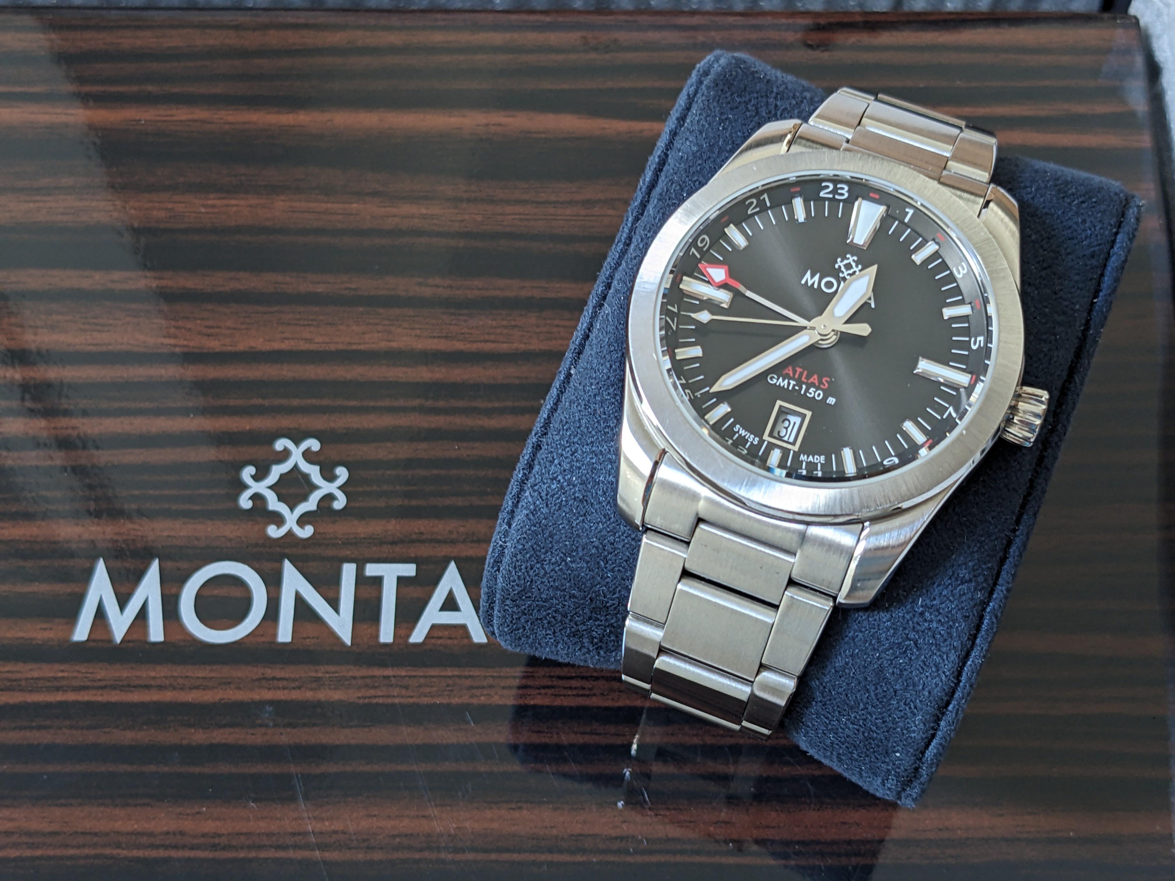 Monta Atlas GMT Charcoal Grey Sunburst Dial 38.5mm with latest version bracelet and fitted OEM Monta leather strap