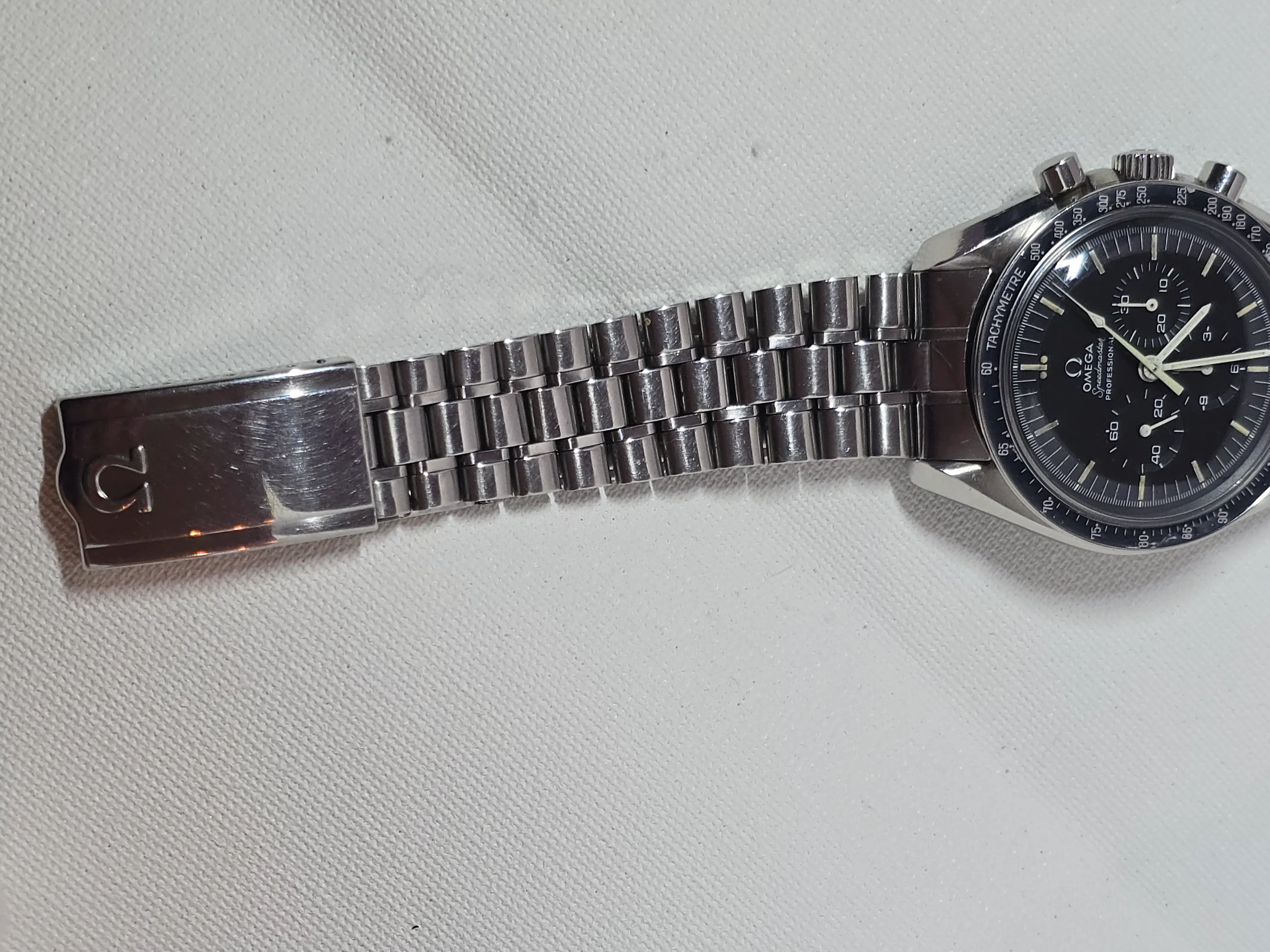 145.022-69 Speedmaster with straight writing Apollo XI caseback. Includes correct 1116 bracelet with endlinks. No accessories. Serviced Nov 2023.