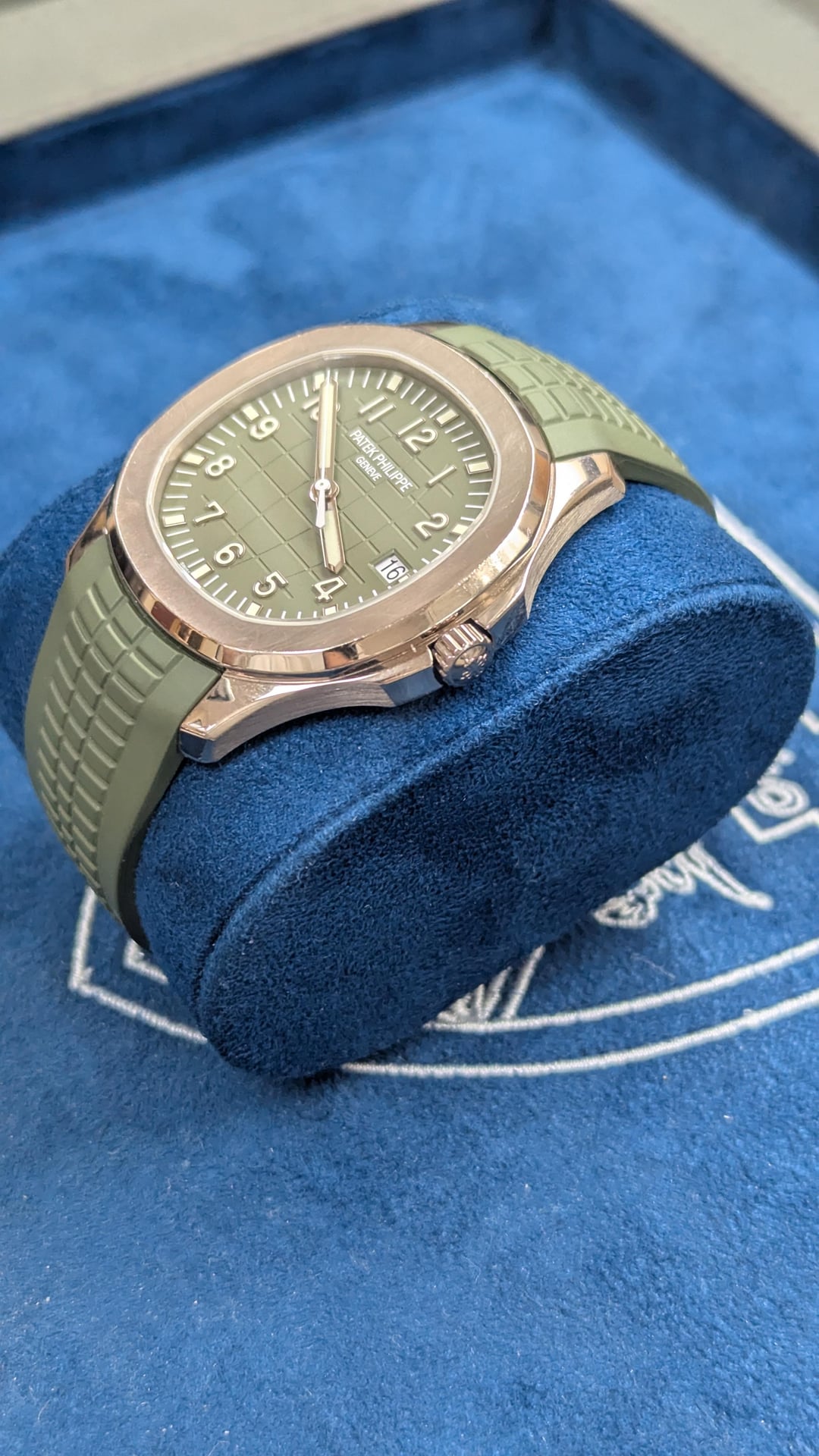 As a Navy man, it’s hard to admit that Army green is cool, but wow this is cool. Patek Philippe: the 5168G-010 Aquanaut. Introduced to mark the Aquanaut’s anniversary, this white gold model is instantly recognizable for its larger case size and elegantly sporty aesthetic. Complete Price $75,000. This is a rare piece and we are open to all inquiries. Case * Material: 18k White Gold * Diameter: \~42.2 mm * Thickness: \~8.25 mm * Crystal: Sapphire (front and display back) * Water Resistance: 120 meters (suitable for most water activities, though periodic pressure tests are recommended if frequently exposed to water) Movement * Patek Philippe Calibre 324 S C (Automatic) * Power Reserve: \~35–45 hours Shipping * Domestic (USA): Complimentary FedEx Priority Overnight (Morning Delivery) Payment Methods * Wire, Zelle, and all major credit cards Service History: The watch has been inspected to confirm it is in excellent mechanical and cosmetic condition. Any routine maintenance or servicing is covered under a one-year service warranty (details available upon request). About Us Aletto Jewelers is a family-owned business with five generations of heritage, offering a selection of premier watch brands, GIA-certified diamonds, and estate jewelry. For over two decades, our showroom in the heart of Boca Raton, Florida has showcased timeless pieces with enduring style. Our commitment to quality and impeccable craftsmanship informs everything we do, ensuring that each piece you select meets the highest standards. Please follow us on Instagram, Youtube, or Tiktok if you’d like to see more of our selection: * [https://www.](https://www.tiktok.com/@alettojewelers?lang=en)[instagram.com/alettowatches/](http://instagram.com/alettowatches/) * [https://www.tiktok.com/@alettojewelers?lang=en](https://www.tiktok.com/@alettojewelers?lang=en) * [https://www.youtube.com/channel/UC83BfOrE3zlpyk9kg5dSJjg](https://www.youtube.com/channel/UC83BfOrE3zlpyk9kg5dSJjg)