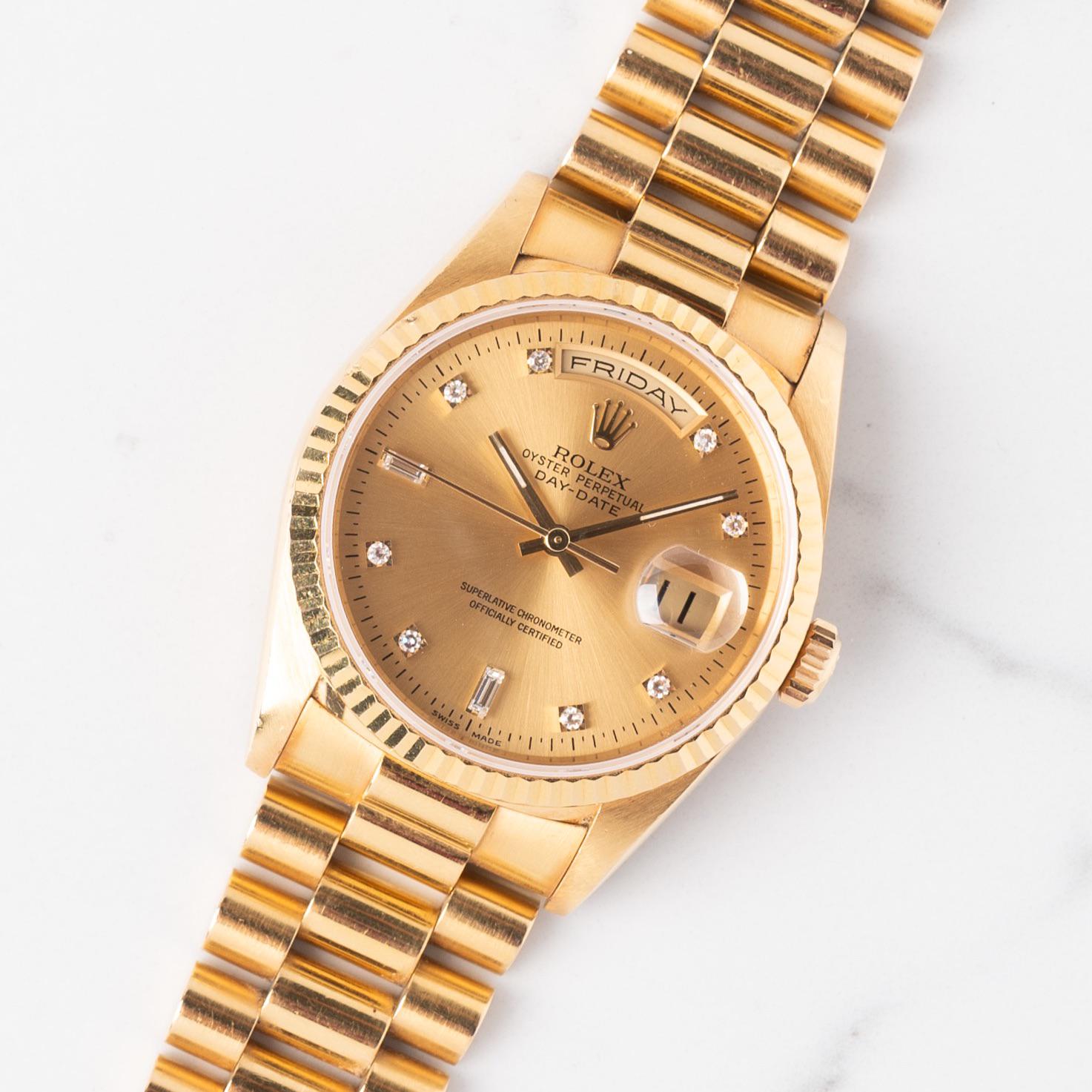1995 Rolex Day-Date 18238 Champagne Diamond Dial $15,450 Day-date reference 18238 with the double quick day/date setting, in great vintage condition, a very thick case and tight bracelet. The watch exhibits a French hallmark on the caseback, as required for watches sold in France. A couple of bites on the bezel at 10 o’clock, light nicks on the lugs as well. Some honest signs of wear throughout the case and bracelet. Serial - Year: W serial ~1995 Bracelet - Strap: 8385 bracelet with 55B endlinks. Fits up to 7.5” wrist Box - Papers - Accessories: Watch only Service History: Unknown. Running at 12s/d, 284 amplitude Pictures https://imgur.com/a/18238-w-kDucLwu Timestamp https://imgur.com/hUtN5CR Watches will be shipped via FedEx upon receipt of bank wire only. Sorry, no P2P payment platforms due to scams. Zelle with references. Prices are for an outright purchase, no trades preferred. **Inquiries:** [Instagram](http://www.instagram.com/angelcitytime), PM or chat [Member of r/Watchexchange for years. Check my references.](https://www.reddit.com/r/WatchExchangeFeedback/search?q=mrs_LA&restrict_sr=1&sort=new) Excellent references on other platforms and forums which I can provide upon request. Please buy with confidence. All sales are final. Thanks for looking!