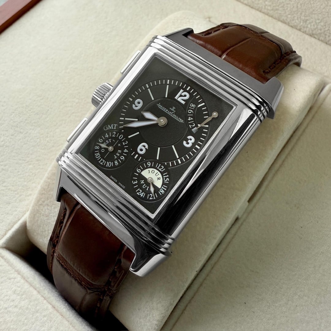 The Jaeger-LeCoultre Grande Reverso GMT, reference Q3028420, is a masterpiece of horological design, blending timeless elegance with exceptional craftsmanship. This particular model features a stunning, dual Silver and Black Guilloche dial that exudes sophistication and versatility. The meticulous guilloche detailing on both sides of the reversible dial showcases the brand's commitment to artistry and functionality. One of its standout features is the GMT complication, a highly useful function for those who traverse time zones or appreciate tracking a second time zone. This practical yet refined feature allows effortless adjustment between local and home time. The Grande Reverso GMT also boasts day and night indicators, adding further functionality and charm. Completing the package is the 24-hour sub-dial, beautifully integrated into the design for maximum legibility without compromising the watch's aesthetic appeal. This is a timepiece that offers both utility and luxury in equal measure. The Reverso design holds a special place in the history of horology. It was first conceived in 1931 for polo players who needed a watch that could withstand the rigors of the sport. The ingenious reversible case was born out of this need to protect the delicate crystal during play while offering an elegant solution to adapt the watch for every occasion. Over the decades, the Reverso has evolved into an iconic symbol of style and innovation, continually reinterpreted with new complications and materials while retaining its Art Deco-inspired beauty. Offered with its original box and warranty papers, this watch is a collector's dream, ready to take its place as a centerpiece in any fine timepiece collection. For the discerning collector or lover of fine watches, the Jaeger-LeCoultre Grande Reverso GMT is more than just a timepiece—it is a statement. It combines rich heritage, exceptional functionality, and exquisite design, making it a worthy addition to any luxury collection. **THE DETAILS** **Case:** 29mm x 39mm stainless steel case which is in stunning condition. **Dial/Hands:** Original Jaeger Lecoultre Silver & Black Guilloche dial in stunning brand new condition. Hands are like new as they came from the factory **Caseback:** Original stainless steel case in stunning condition **Movement:** Original Jaeger Lecoutlre 878 manual winding movement which is running well. Service is always recommended for time keeping. **Bracelet/Strap:** Factory original Jaeger Lecoutlre black leather band in attractive condition with signs of previous wear. The leather band is attached to the factory Jaeger Lecoultre stainless steel deployment buckle. **Crystal:** Original sapphire crystal in perfect condition **Accessories:** The watch comes with everything in the photos including the box, outer box, booklets and warranty card Available for sale US 9800
