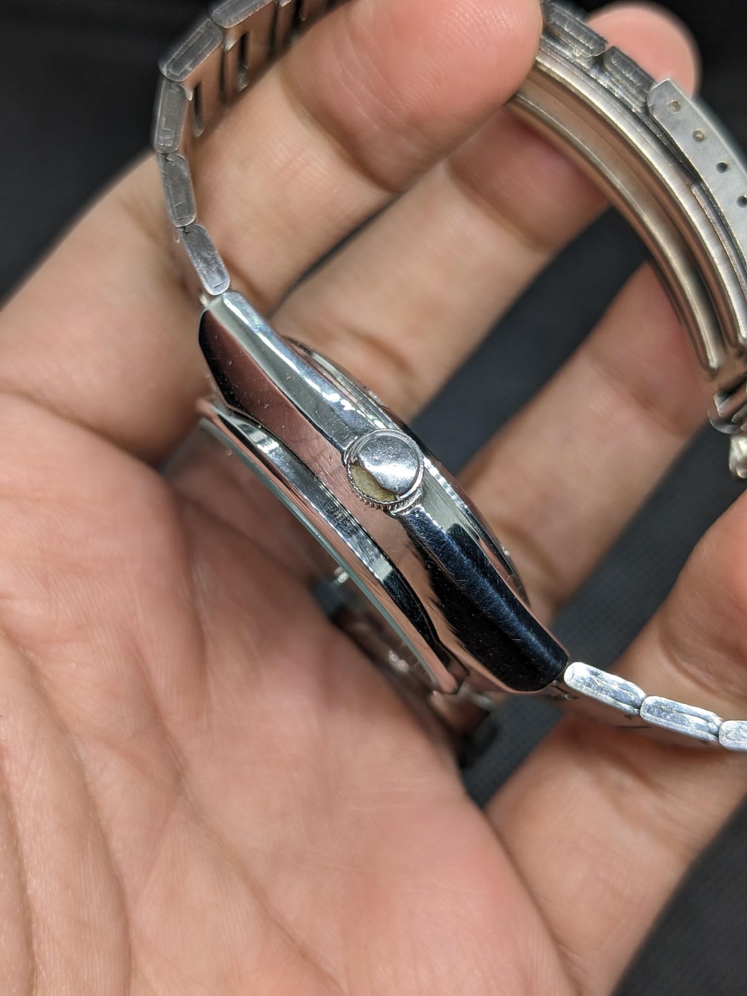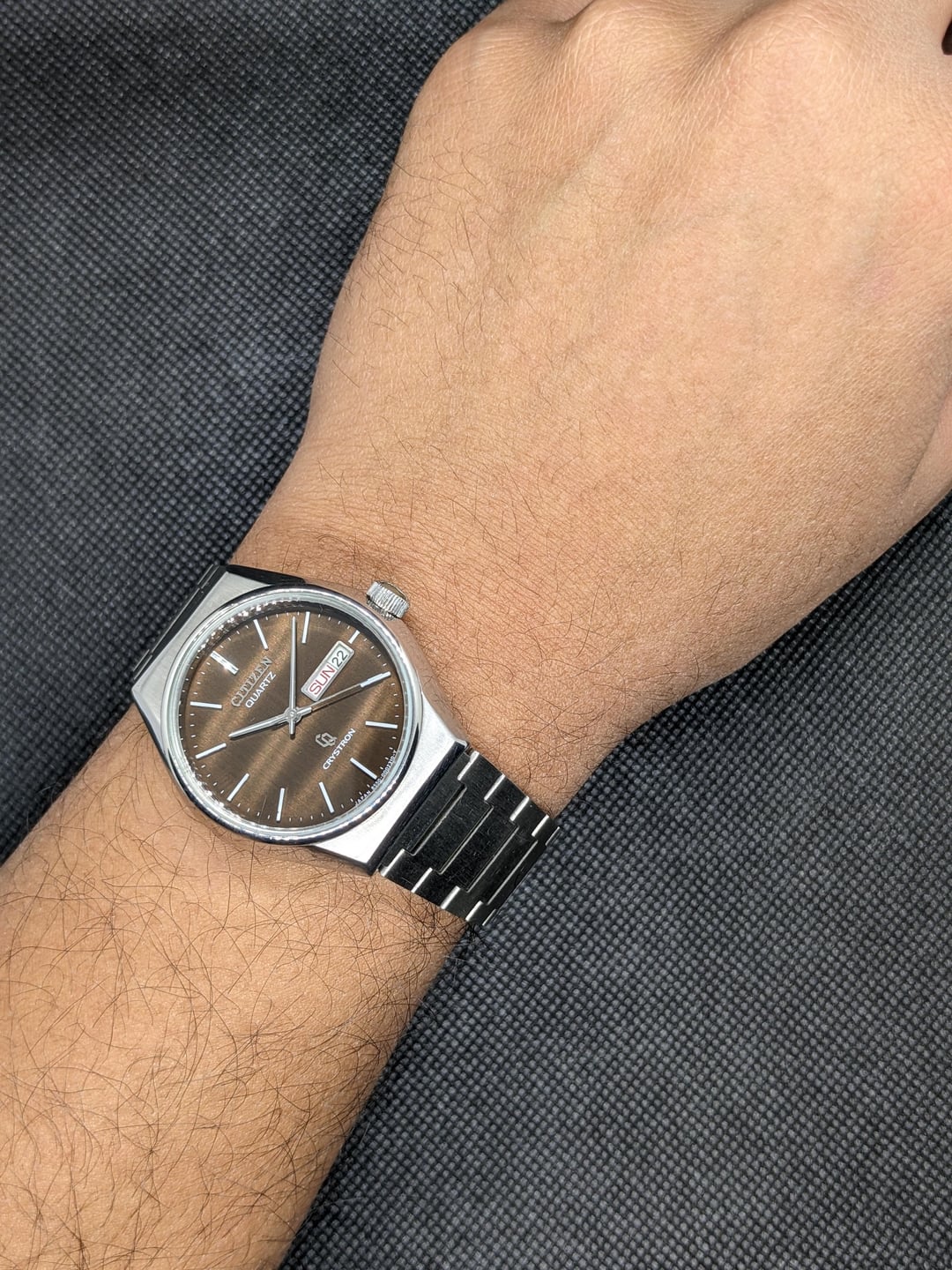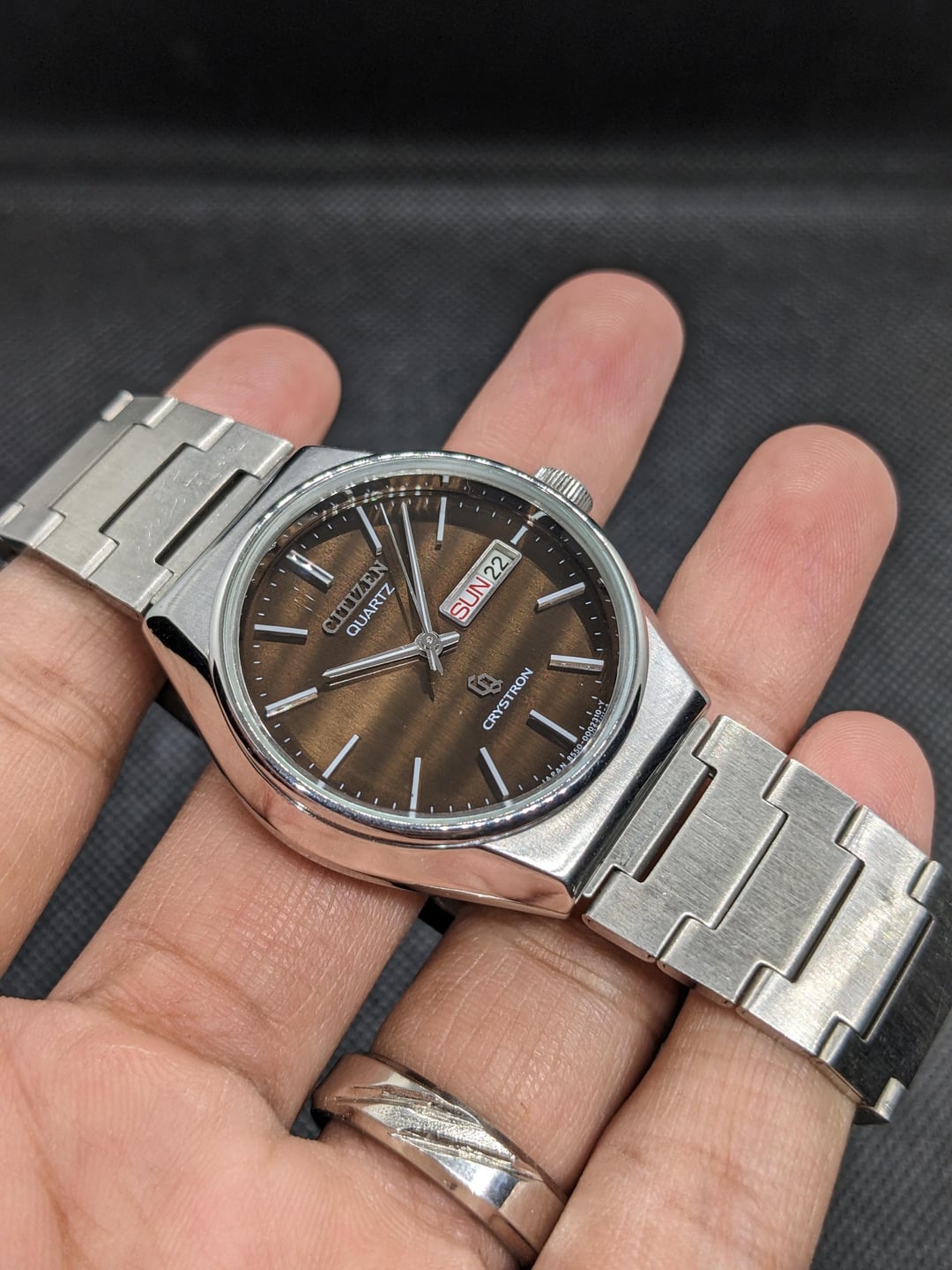 For Sale here is a Citizen Crystron Quartz featuring a crazy Chocolate Brown Sunburst Dial. 38.5mm inclusive of the screw down crown. Chain fits up to 7.25 inch wrists comfortably. The chain likes to catch hair a lot, so make sure you get a snug fit and it doesn't move around on your wrist. USD 165 Shipped. I accept Zelle, Paypal FF, and Crypto.