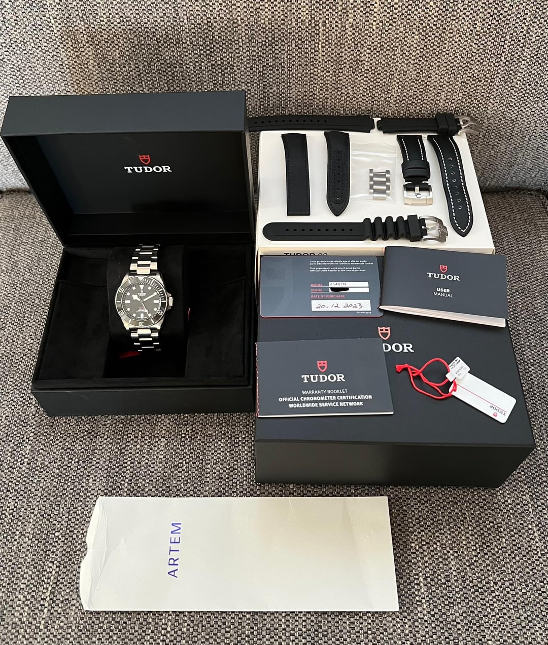 Selling my Tudor Pelagos 39, which is in great condition. It’s an absolute strap monster. Minor desk diving marks on the bracelet clasp. The watch hit itself is in excellent condition with the only wear on the back of the watch (see pictures). Included rubber strap has never been worn. Papers dated December 2023 so lots of warranty left. Full kit: Inner and outer box, hang tag, papers, all links included. Extras: Artem loopless strap (minus clasp), StrapsCo sailcloth strap. Price: $3,450 via Venmo F&F, includes shipping. No trade offers please.