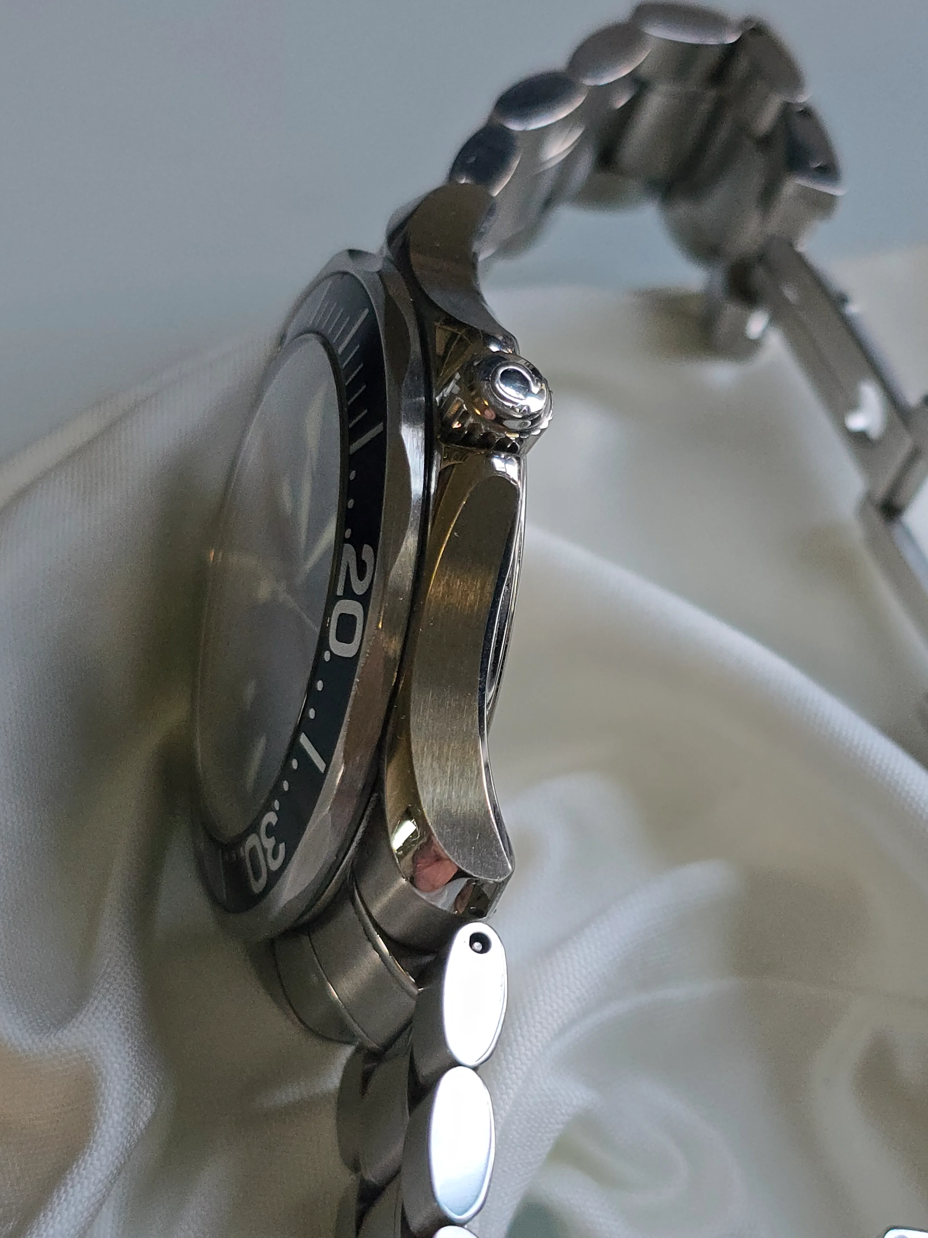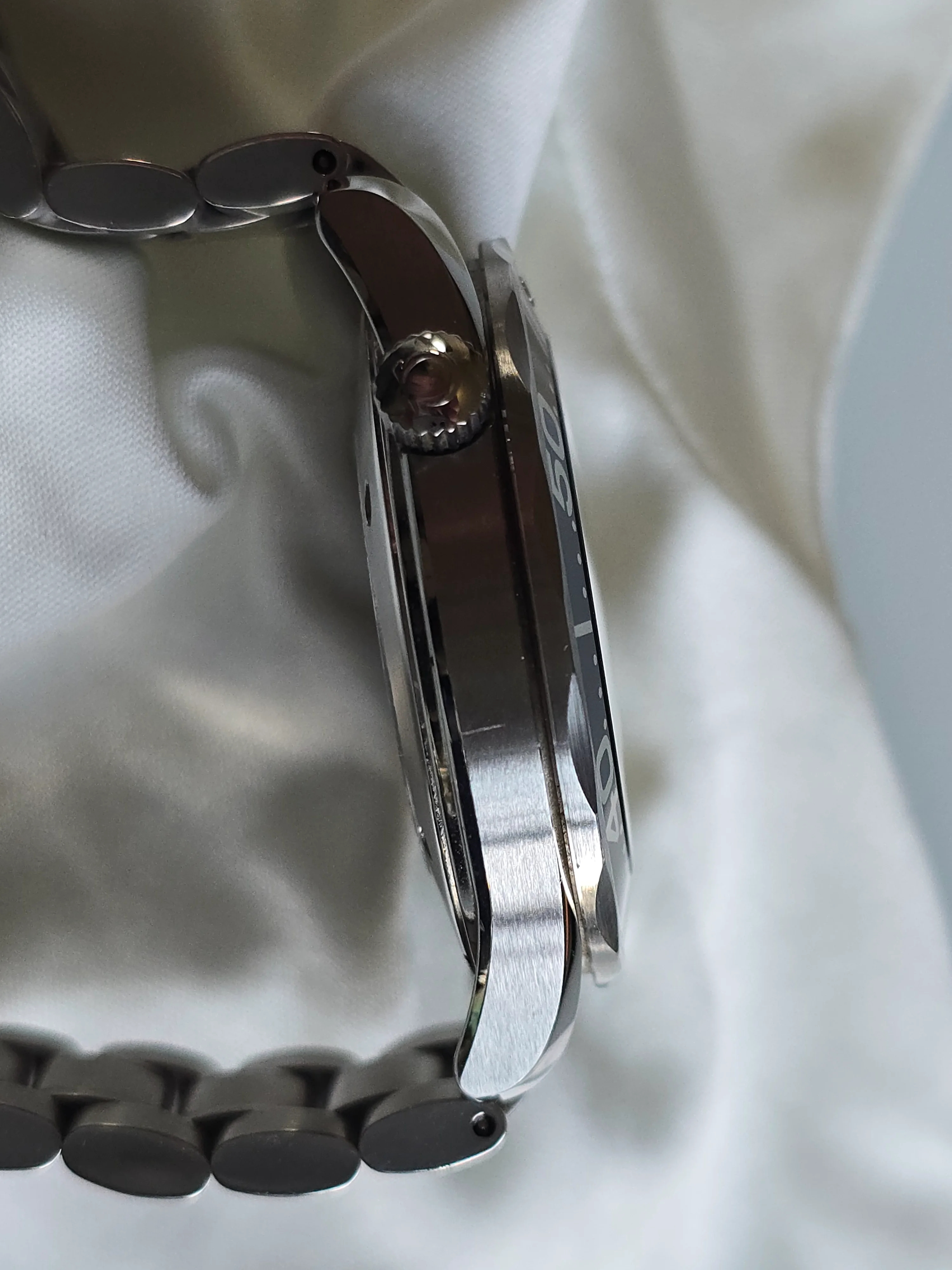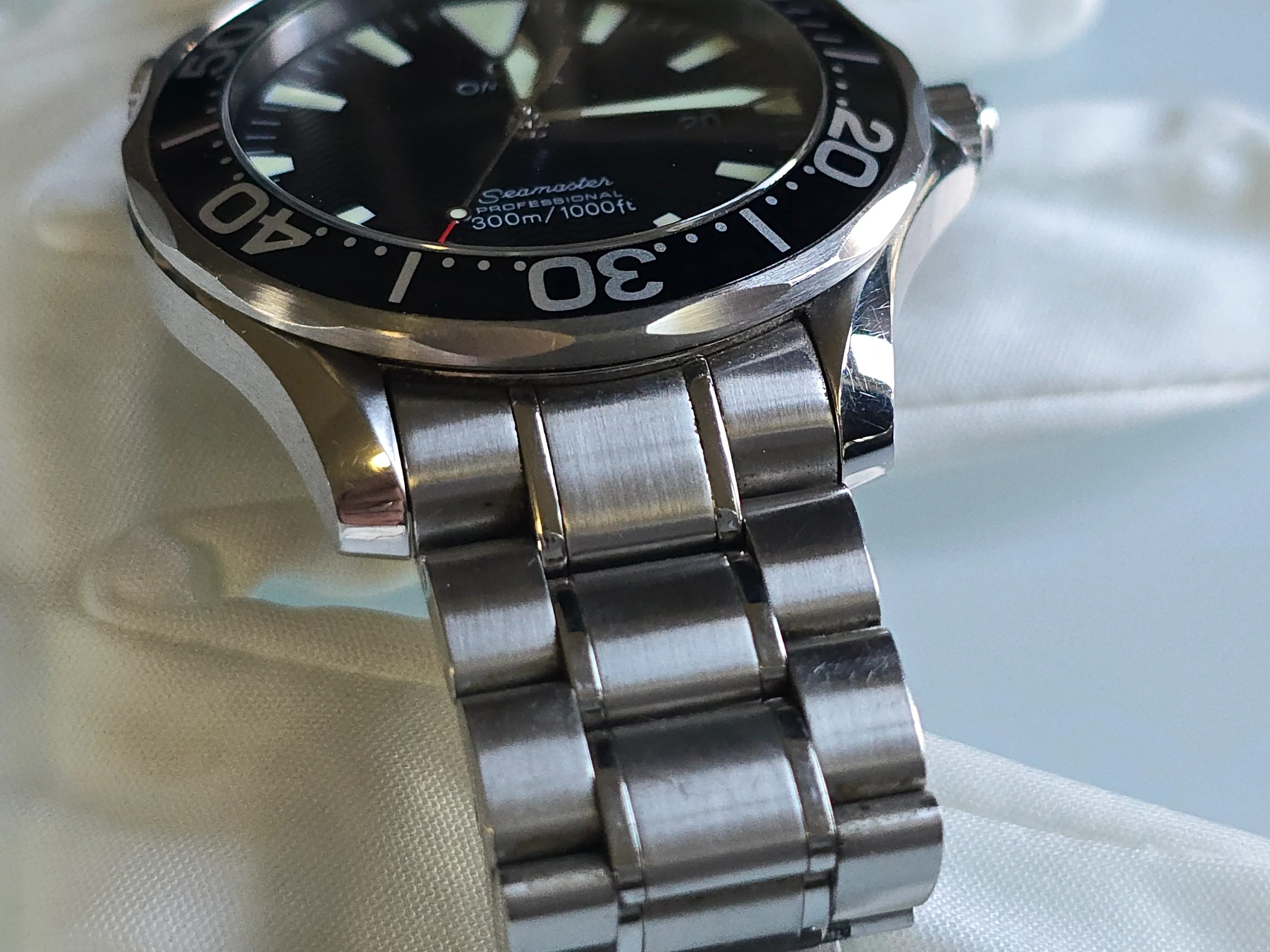 This is a very nice condition watch IMO. There are only a few spots on the case that keep it from appearing unworn. The most visible is a scratch on the caseback, surface scratches on the buckle, tiny nicks on a small section of the bezel edge and an almost imperceptible mark on the brushed edge side. It's not NOS, but it's very nice.
