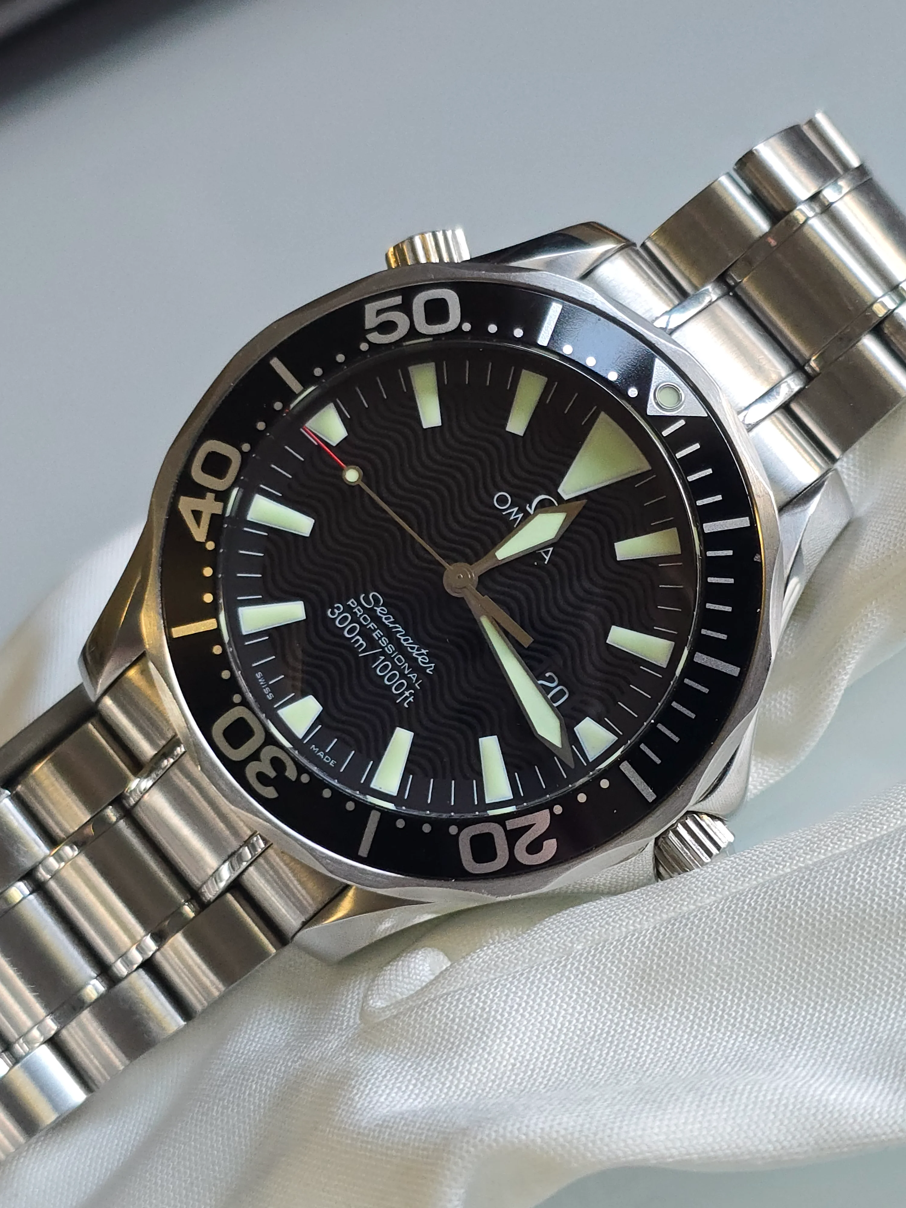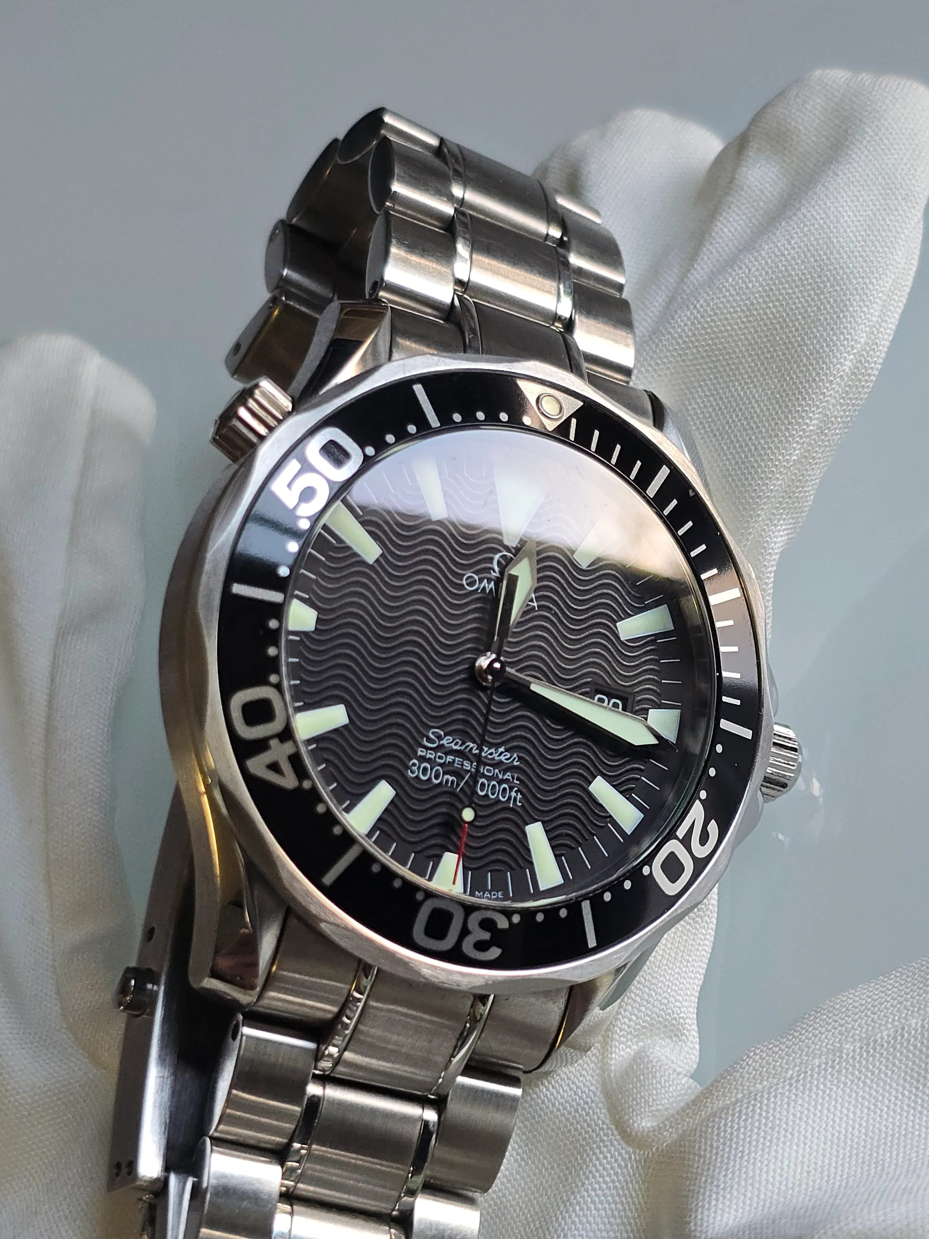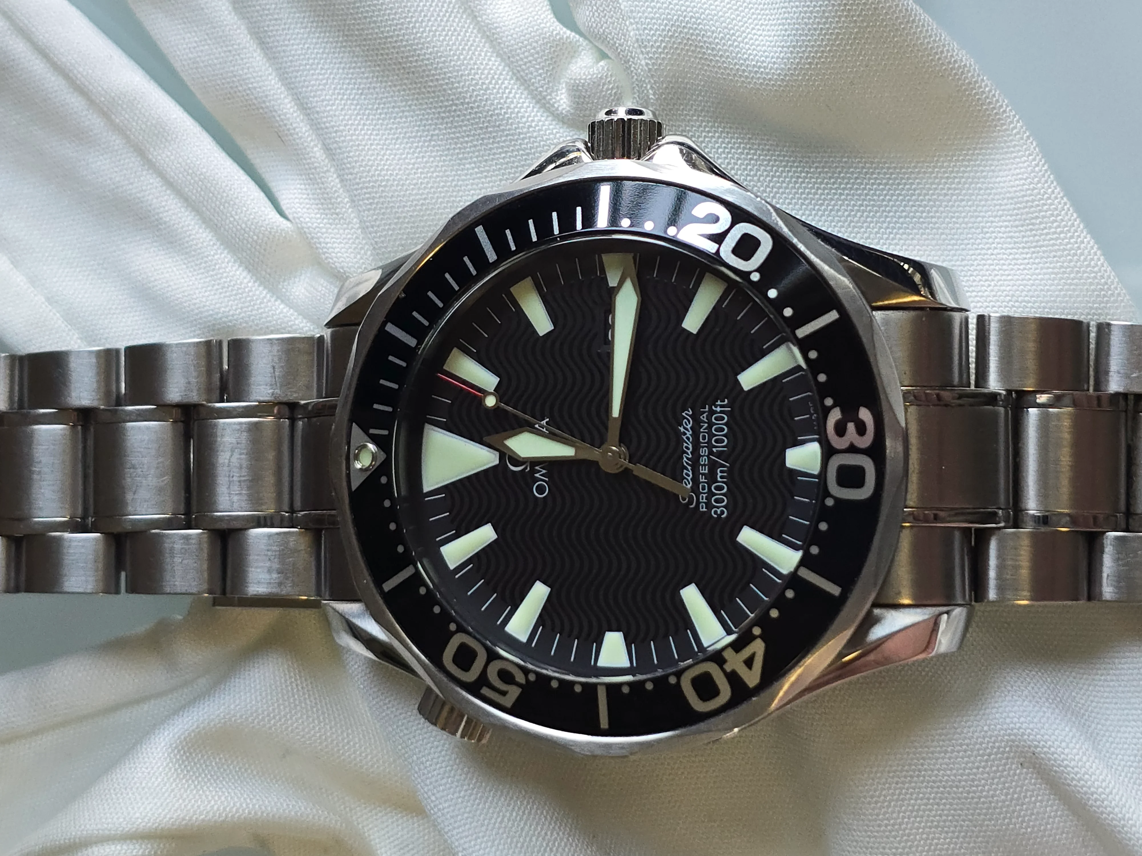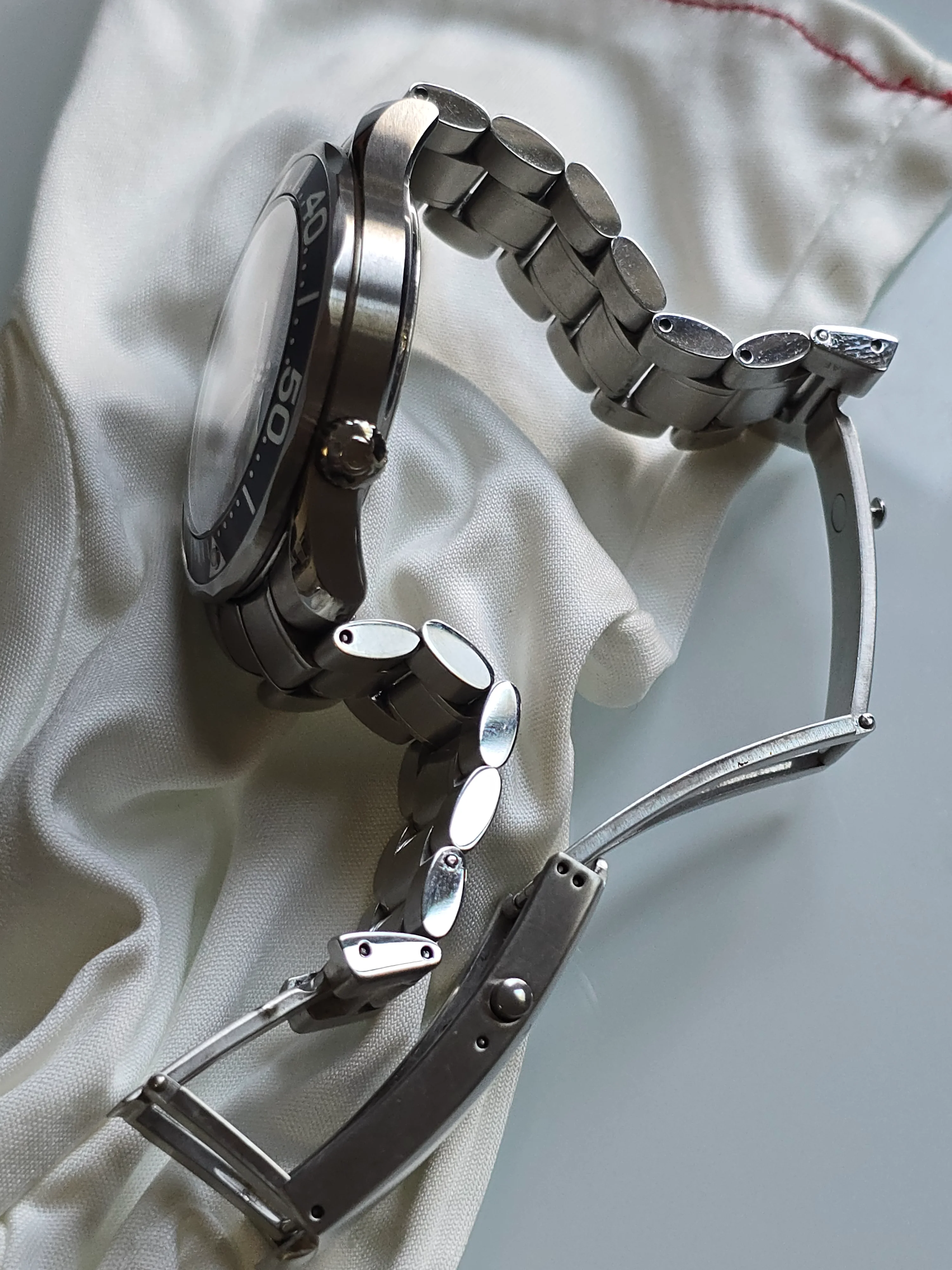 This is a very nice condition watch IMO. There are only a few spots on the case that keep it from appearing unworn. The most visible is a scratch on the caseback, surface scratches on the buckle, tiny nicks on a small section of the bezel edge and an almost imperceptible mark on the brushed edge side. It's not NOS, but it's very nice.