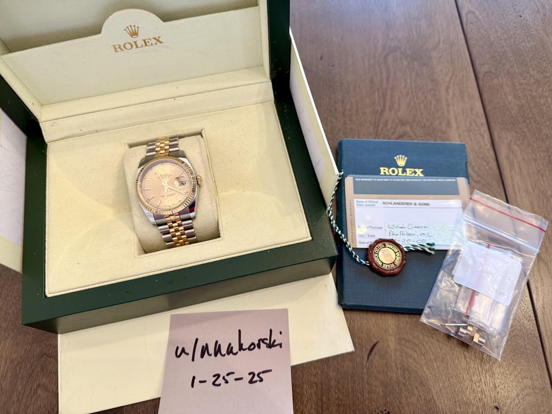 Up for grabs is a Rolex Datejust Ref. 116233 with a champagne dial, 18K fluted bezel, and 18K two-tone bracelet. It was originally purchased in 2008 from an AD in Ann Arbor, MI. The watch was essentially a safe queen for years until being sold to Lewis Jewelers, also in Ann Arbor, MI, in early 2024. I purchased it from Lewis in July 2024 and have only worn it a few times, so on it goes. It comes with the original box, all links only one removed), and warranty card and booklet. Service history is unknown but it kept great time during the times I wore it. Hit me up with any questions. I'll do my best to answer them. Please comment on this thread before chatting/DMing me. Thanks. [Timestamp](https://share.icloud.com/photos/069IHg3KgE4f8uQdKlrMmdScw) [Album](https://share.icloud.com/photos/0adjGFTAUYkpUUCrTJ_4E68qg) Price: $5,999 USD net to me Shipping: Fully-insured with FedEx or UPS Priority, CONUS, AK, and HI only Payment Methods: Bank wire, PayPal G&S, or crypto Crypto Accepted: BTC (10% discount) or XRP, SOL, HBAR (5% discount) I realize that this is an expensive purchase so I am happy to provide additional photographs and/or hop on a FaceTime or video call. Offers considered. Trades and low-ball offers will be politely ignored.