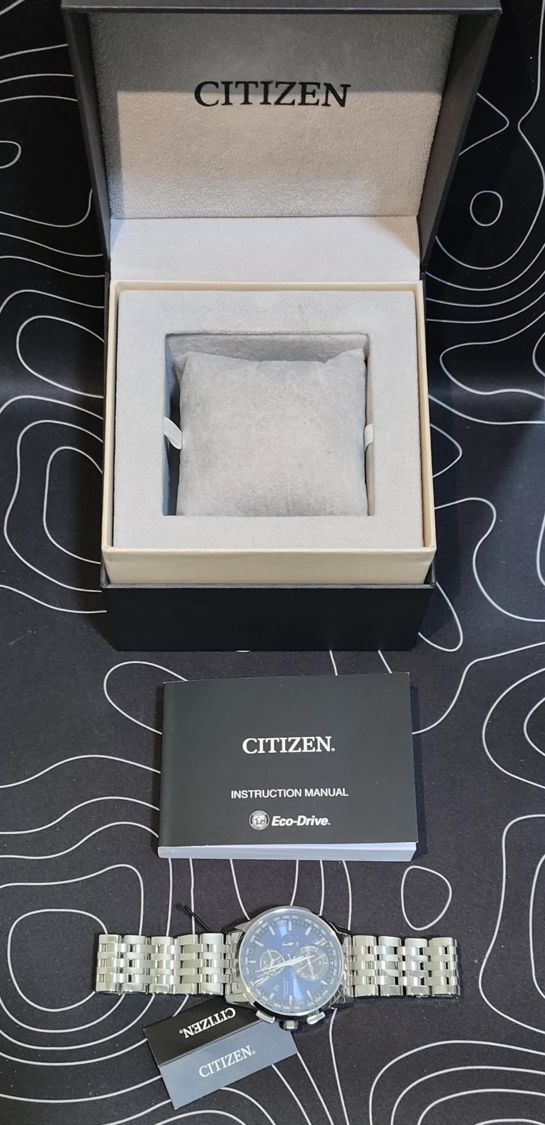 I am selling this Citizen Eco Drive AT8110-61L as my first sale on r/watchexchange This watch is an absolute beauty with tons of functions, solar powered and radio controlled The watch is unworn, includes box and user manual, no papers The watch came with small manufacturing defects in the bracelet, minor scratches on the removable links and one of the push pins is too loose, but all should be good once it is resized Asking price: $260 The watch is located in Dubai, United Arab Emirates. International shipping excluded from price Accept paypal, bank transfer, or cash on delivery (within UAE) Watch specifications: * Model number: AT8110-61L * Movement: Eco-drive (Caliber H804) * Power reserve: 6 months at full charge * Case material: stainless steel * Case diameter: 42.7mm * Case thickness: 9.9mm * Band material: stainless steel * Crystal: sapphire * Water resistance: 10 bar (100m) * Weight: approx. 153.4g * Functions: perpetual calendar, radio controlled timekeeping, chronograph, world time, 24 hours display, day and date display, power reserve indicator, insufficient charge warning, overcharge prevention, auto time correction, summer time function, energy saving feature, impact detection, hand correction, JIS1 anti-magnetic