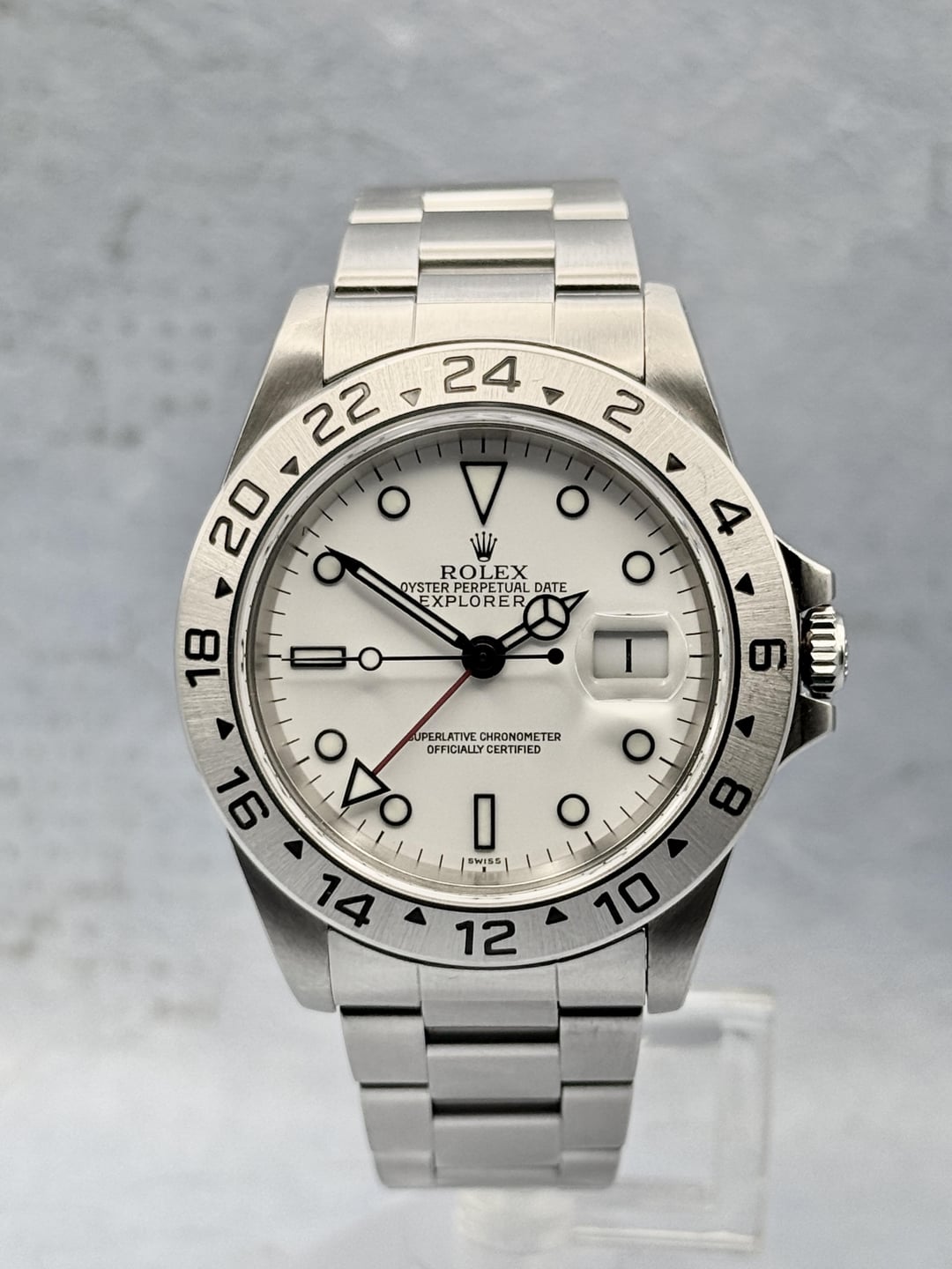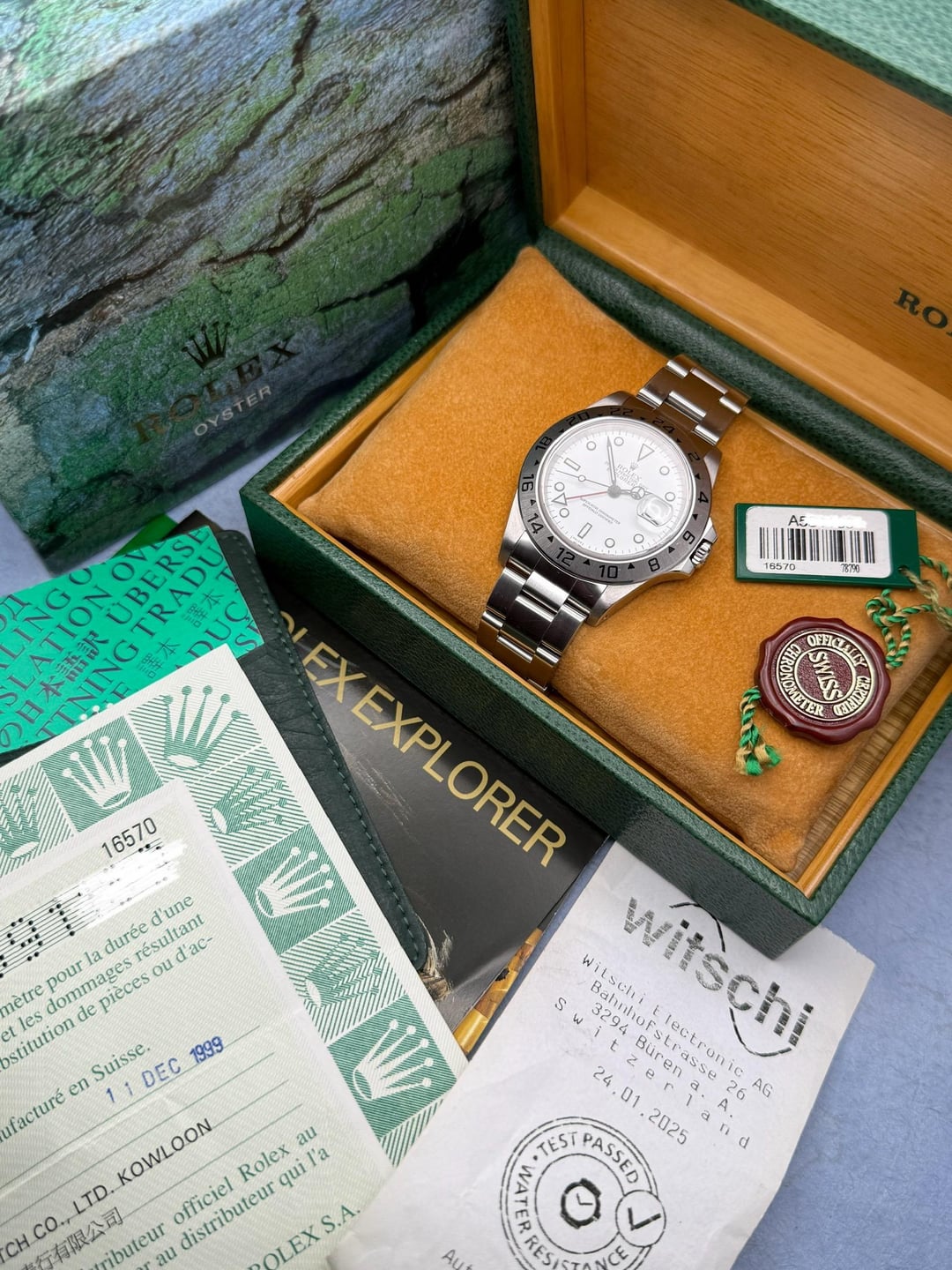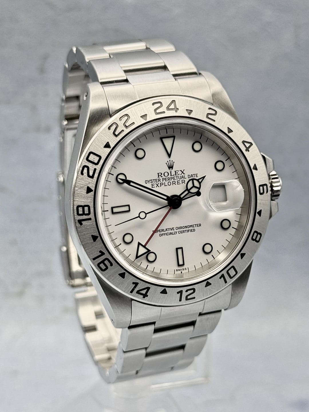**\[WTS\] Rolex Explorer II "Polar" - 16570 - 1999 - FULL SET & SERVICED** [MORE PICS](https://www.grailtimeco.com/rolex-explorer-ii-16570-polar-1999/) [TIMESTAMP](https://imgur.com/cZwvuLv) [TIMEGRAPHER STATS](https://imgur.com/28HqUHe) [INSTAGRAM](https://instagram.com/grailtimeco) **As Crisp as Polar Snow** The ever popular Rolex Explorer II offers a stainless steel finish paired with a striking "Polar" white dial. The luminova hour markers and hands provide easy reading, while the fixed bezel engraved with 24-hour graduations and the GMT complications allows the wearer to keep track of two time zones. Model features the sought after "Swiss Only" luminova dial, made from late 98 to early 2000. This 1999 Explorer II is in very good all round condition. The bracelet is tight, the case is sharp and crown on the bracelet well defined - all signs of light wear. It has received a full movement service and is running and winding like a new watch. Pressure test included. Watch has not been polished as part of the service as the condition does not justify it. Some light surface scratches on bracelet that can be polished for you at a small cost. Watch comes as a full set with warranty papers, original serial number swing tag, inner and outer boxes and booklets. Bracelet fits upto a 7 1/2 inch wrist. **E-Mail or Call for purchase details.** **$7,950** shipped Fedex next day, fully insured, to the USA or arrange pick up from Hoboken, NJ. Can ship internationally if you provide the label. Wire payment, zelle or paypal friends and family. Please feel free to contact via Reddit DM with any questions. As per sub rule, please comment “PM” before sending a PM or DM. Thanks Plenty of references available from Reddit Watch Exchange and Rolex Forums and on my Website.