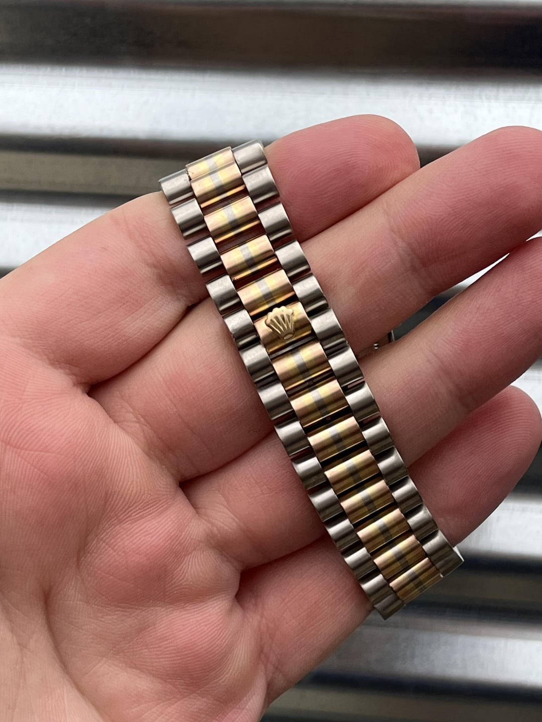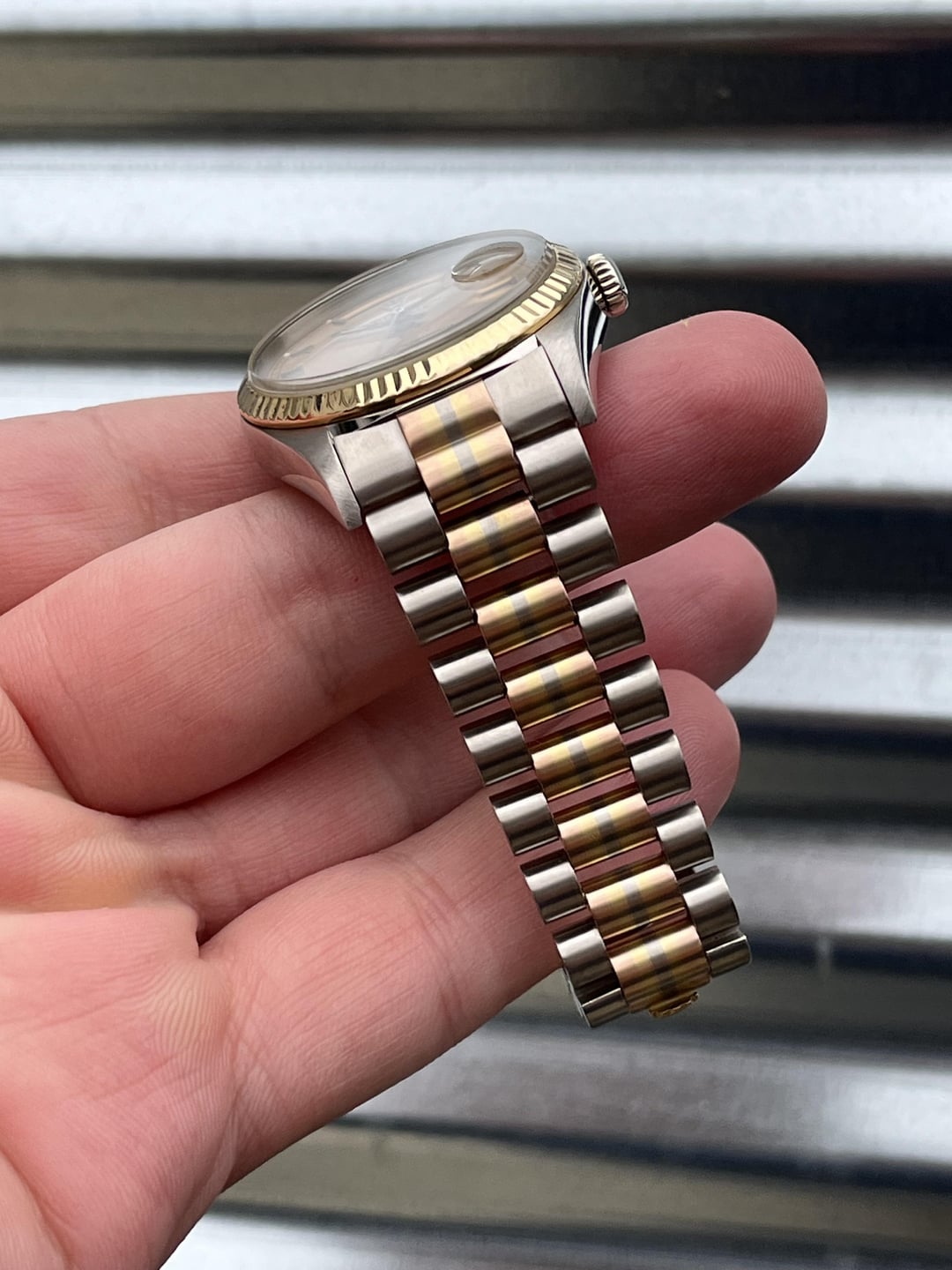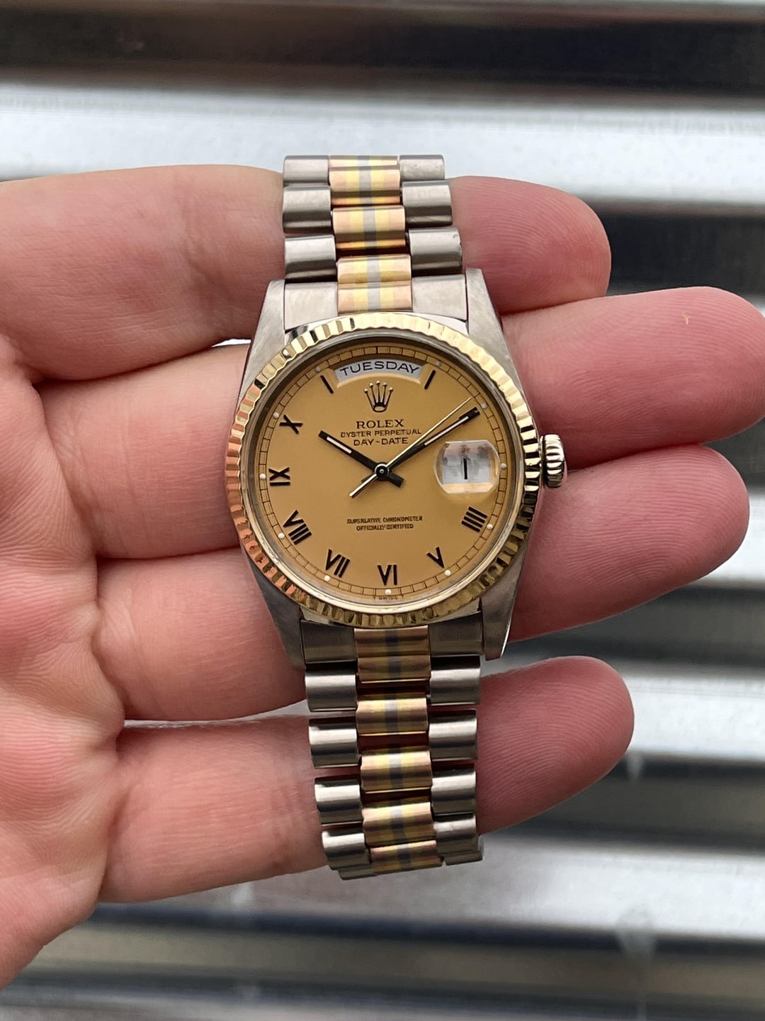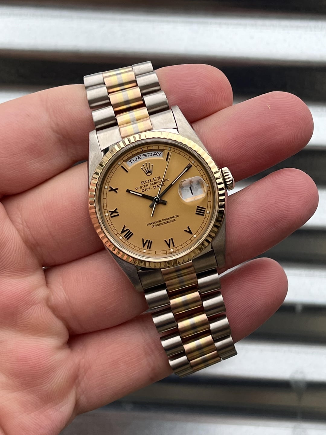 This one is a bit unusual but very unique nonetheless! This beautiful Rolex Day-Date 36mm, reference 18239 “Tridor” (comes with 3 different colors of gold) with a Roman Numeral Lemon Dial is up for sale and ready for a new owner! Reference number: 18239 Serial number: E****** (1990) Comes as WATCH ONLY. No box or papers. 💰1️⃣4️⃣7️⃣5️⃣0️⃣✈️ The watch is in overall good pre-owned condition. The lemon dial is absolutely stunning and hard to come by! The Roman numerals make all the difference and make this piece look classic. Clean hands. Case remains in good shape with thick lugs. The 18k yellow gold fluted bezel is nice and sharp. Some wear on the bracelet. The links have a clean finish .The clasp is nice and tight. Clasp code and end links check out. Coronet shows signs of polish. Overall awesome watch and an unbelievable value for the money. 4 screws (fits about 7” wrist. Pics included. 💰1️⃣4️⃣7️⃣5️⃣0️⃣➕✈️ I accept Zelle/Wire. Shipped with fully insured shipping once payment clears, no exceptions. I have plenty of references across Facebook groups as well as Reddit feedback. Follow me on IG for more deals: @215watches Thank you for your time!! [photo album](https://imgur.com/a/pNifm5k) [time stamp](https://imgur.com/a/q5AKYiL)