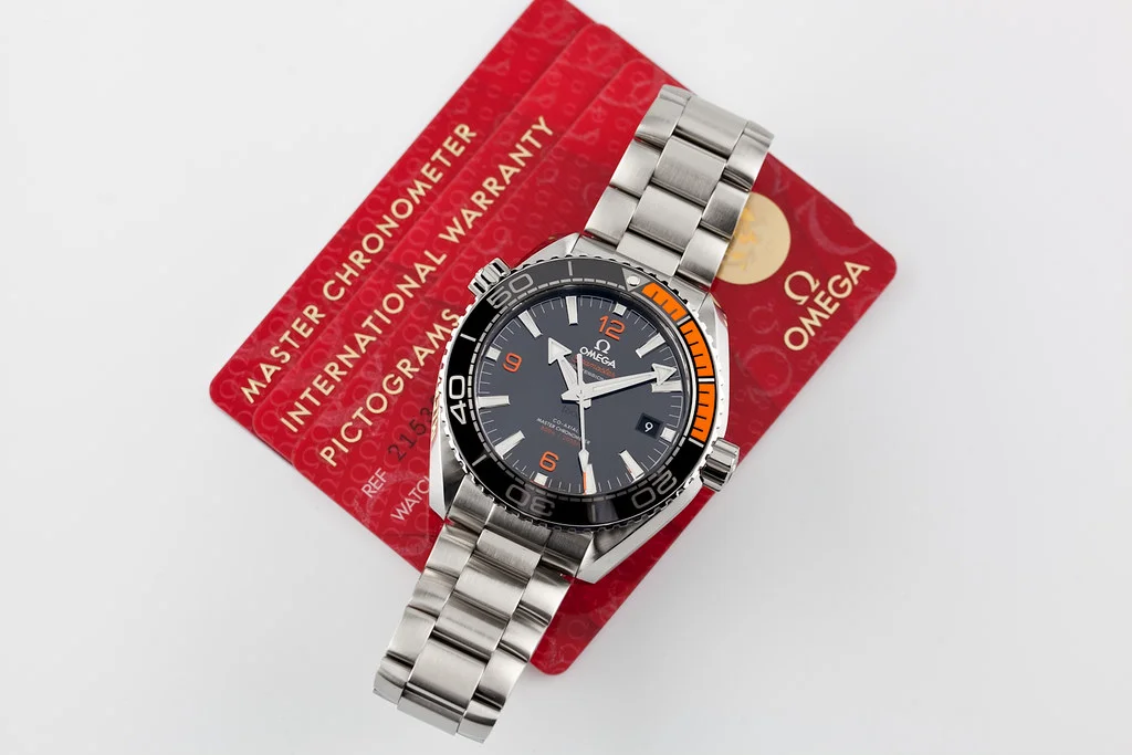 Up for sale is a brand new Omega Planet Ocean 8900 43.5mm Black with Orange accents, reference # 215.30.44.21.01.002 It comes complete with all boxes, papers, booklets, hang tag and Omega Warranty Card dated February 2025.