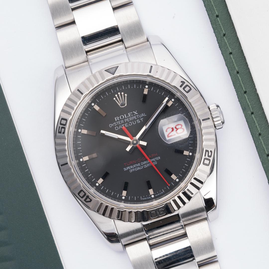 **Model**: 116264 **Condition**: Excellent (little to no signs of wear) **Year**: 2006 (D-Serial) **Scope**: Box & Papers **Movement**: Automatic **Case Width**: 36mm **Strap Length**: 7.75" **Listing ID**: 220001827 **Price**: Offered at $7,350 shipped. Wire, Zelle, or Crypto [Album](https://imgur.com/a/tSgjHUV) | [Timestamp](https://imgur.com/dUjMN5B) **Our Take** A fluted "Thunderbird" bezel helps bridge the gap between dressy and sporty in this unique 2000s Turn-O-Graph. In addition, this example features the desirable "engraved rehaut" beneath the crystal. There is also a red date wheel on the dial. This particular ref. 116264 is in mint pre-owned condition, exhibiting little to no signs of wear. Possibly some light handling marks. The watch comes with its box, hangtag, and original papers dated 2006. The watch is keeping time at +2sd with 280 amplitude.