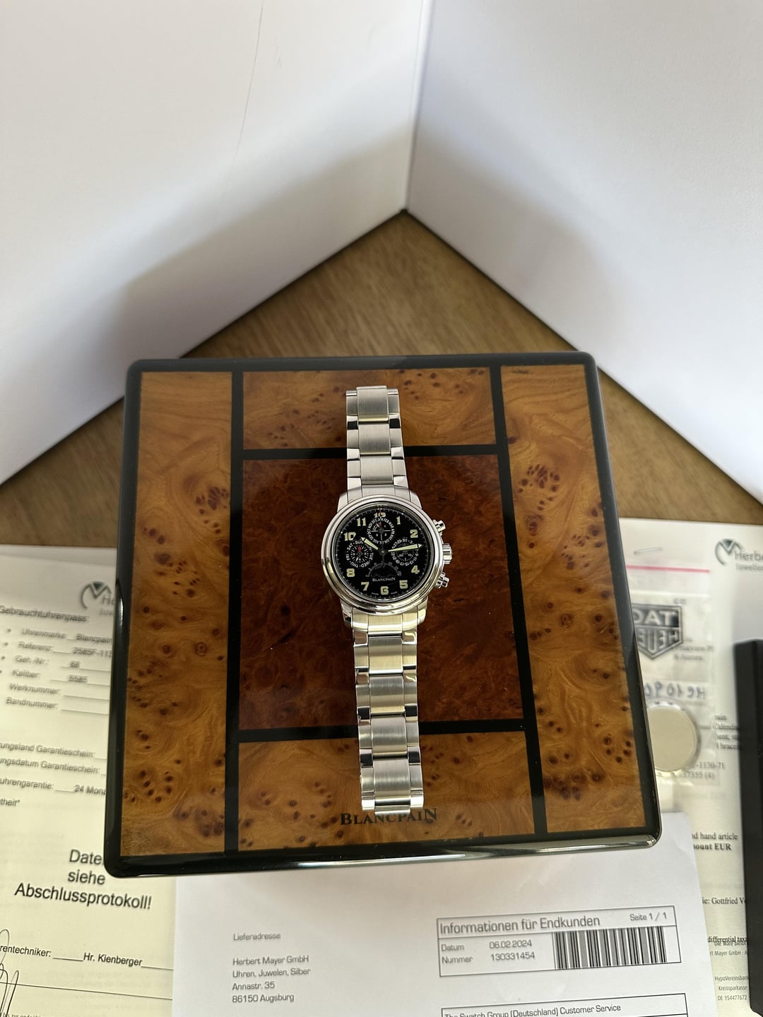Up for sale is a Blancpain 2585f-1130. It is a black dial variant of the Blancpain Leman Perpetual Calendar Flyback Chronograph in a stainless steel case. Dimensions and specs: * 38mm diameter * 44mm lug to lug * 20mm lug width * 13.6 mm thickness * 80m water resistance The watch was imported from Herbert Mayer in Germany. It completed a full movement, gasket, and case service (I’m not sure if it was polished) in February 2024. It was also subsequently tested by Herbert Mayer. Paperwork for both are provided and photographed. I was told by Herbert Mayer that they paid ~$2,000 for the full service. This sale includes a full set: * The watch * Original inner and outer boxes * Operation booklet and stamped guarantee paper * All original bracelet links, screw heads are all in good shape * Service paperwork from February 2024 — complete service * Original case back numbered 68 * All purchase paperwork from Herbert Mayer Also — the watch has been fitted with an exhibition/see-through sapphire caseback, made specifically for this model, by American watchmaker RGM. It cost ~$350 and allows the owner to admire the solid gold rotor and world-class finishing of the movement. The original caseback, with “68” hand engraved noting its serial number, is also included. The condition is excellent. There are some minor nicks on the bezel, as well as some minor scratches on the original caseback. Otherwise, the case has hardly any blemishes. The crystal has some very faint scratches on the external anti-reflective coating, but they are only noticeable at a very flat angle in certain light. The bracelet is in excellent condition with a few scuffs from normal wear. It’s keeping time at around +4 seconds per day. No issues with any of the calendar or chronograph functions. There are very few perpetual calendar chronographs made in stainless steel, from any brand. It has a column wheel, vertical clutch, flyback chronograph. It is also finished to the highest standards. The case is mirror polished, and so are the links of the bracelet. The moon disc for the moonphase is also a perfect mirror, allowing you to see the underside of the chronograph seconds hand at certain angles. The rehaute and pushers are mirror polished. You can tell Blancpain put their best effort into this watch. Asking $17,500 shipped next day UPS air. Local deal in Denver is also available. Zelle, Payal f&f, or bank wire only. Many references here to provide.