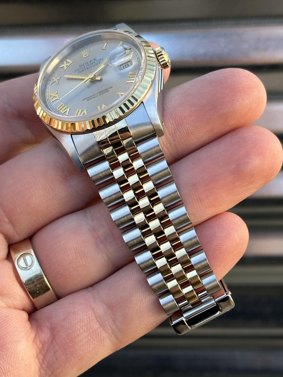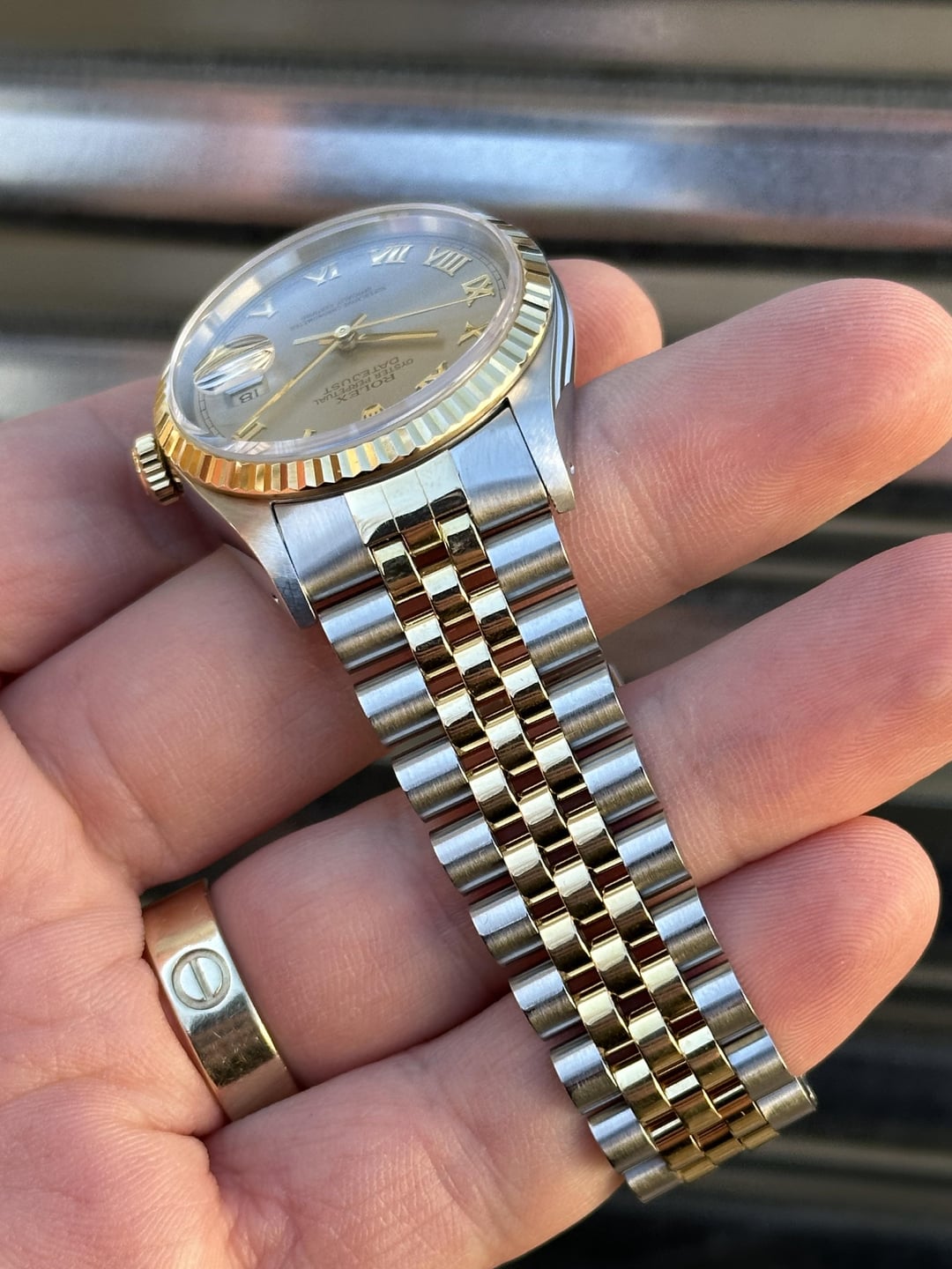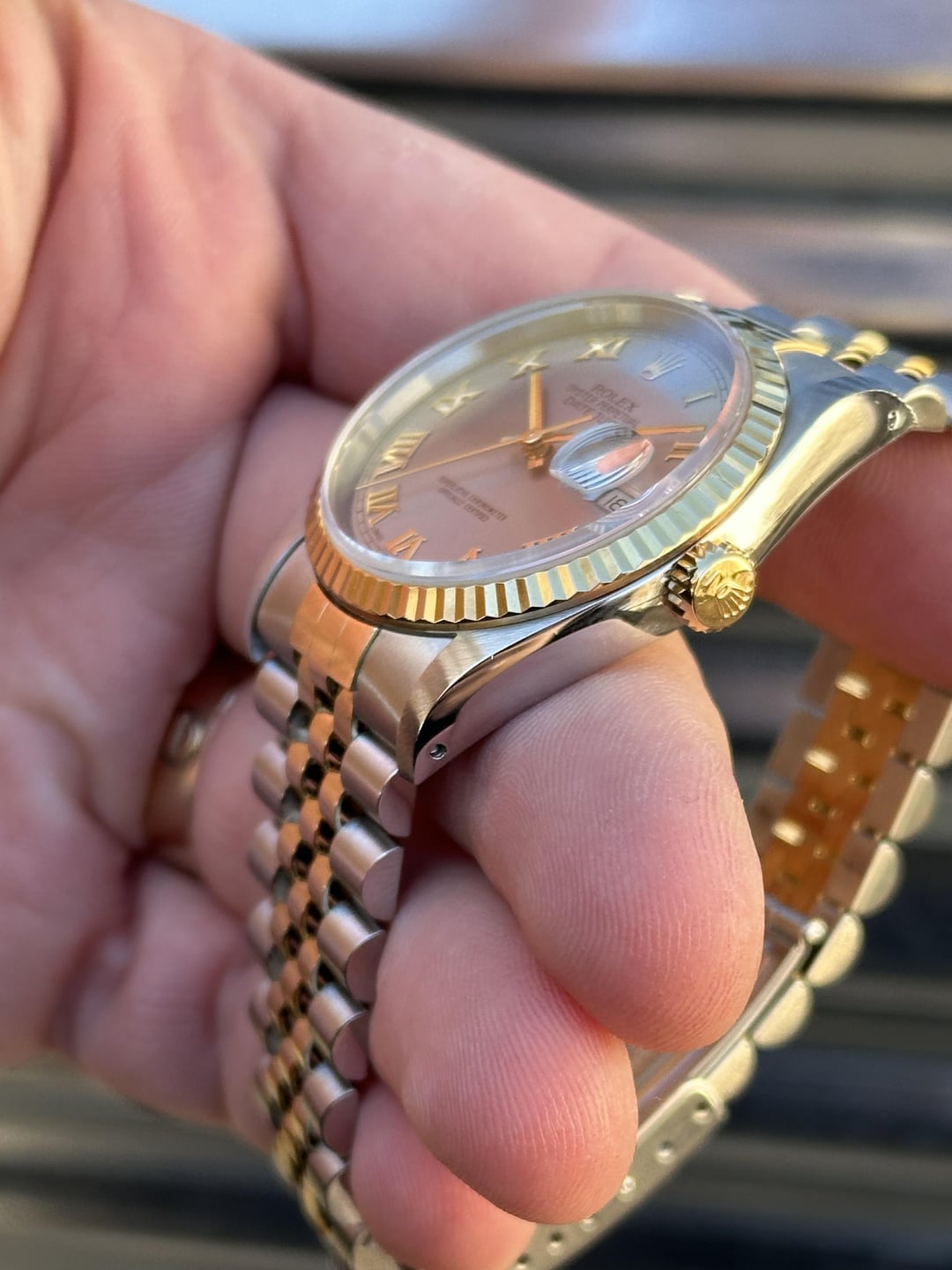 Available is a beautiful two-tone Rolex Datejust with Grey Roman Numeral Dial reference 16233. It features an 18k gold fluted bezel on a jubilee bracelet. It comes with Box & Papers, Original Purchase Receipt, Multiple Service Cards and is in phenomenal condition. It’s clearly a watch that’s been well kept throughout the years. Reference number: 16233 Case:36mm Serial number: S*** which dates this watch to 1993 Papers are stamped July 4, 1994 COMES WITH BOX, PAPERS, BOOKLETS, PURCHASE RECEIPT, MULTIPLE SERVICE Cards (See pic 2.) 💰6️⃣8️⃣0️⃣0️⃣+✈️ The watch is in overall excellent pre-owned condition - see pics for details. Dial looks absolutely beautiful and remains in great shape with no corrosion. Case is in phenomenal shape with nice sharp edges. Thick lugs and clean high polish surface. The 18k yellow gold fluted bezel is in very good shape as well. Coronet on the clasp is well defined. Tight bracelet. Quickset movement. Sapphire crystal. Solid no-holes case. If you’re in the market for a clean DJ then save yourself the time and buy this one! You won’t be disappointed! 20 Links on bracelet Fits about 7.25 inch wrist 💰6️⃣8️⃣0️⃣0️⃣+✈️ We accept Zelle/Wire as payment. Overnight fully insured shipping. I have plenty of references across different platforms so buy with confidence. All of our photos are taken in natural sunlight and are in no way edited with computer programs. Follow us on ig @215Watches for daily deals. Thank you for your time [photo album](https://imgur.com/a/xNOhVbU) [time stamp](https://imgur.com/a/wud2T69)