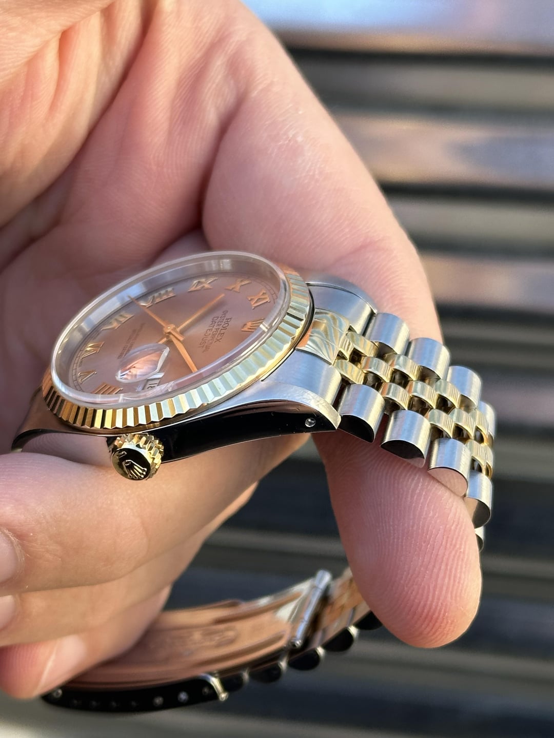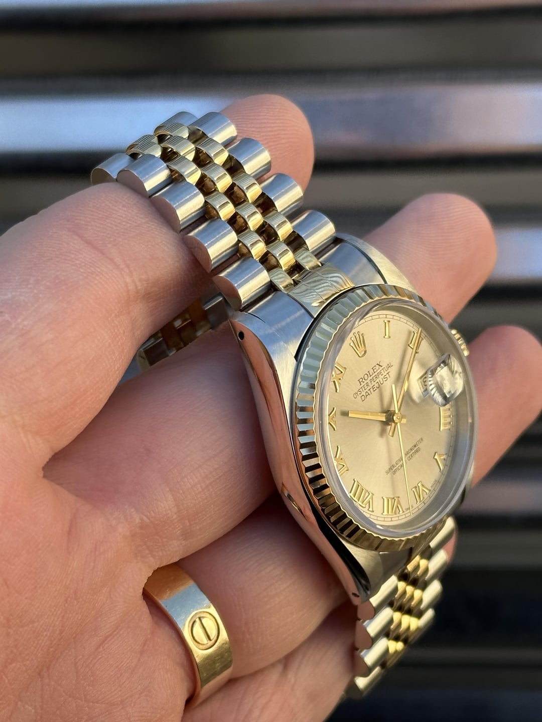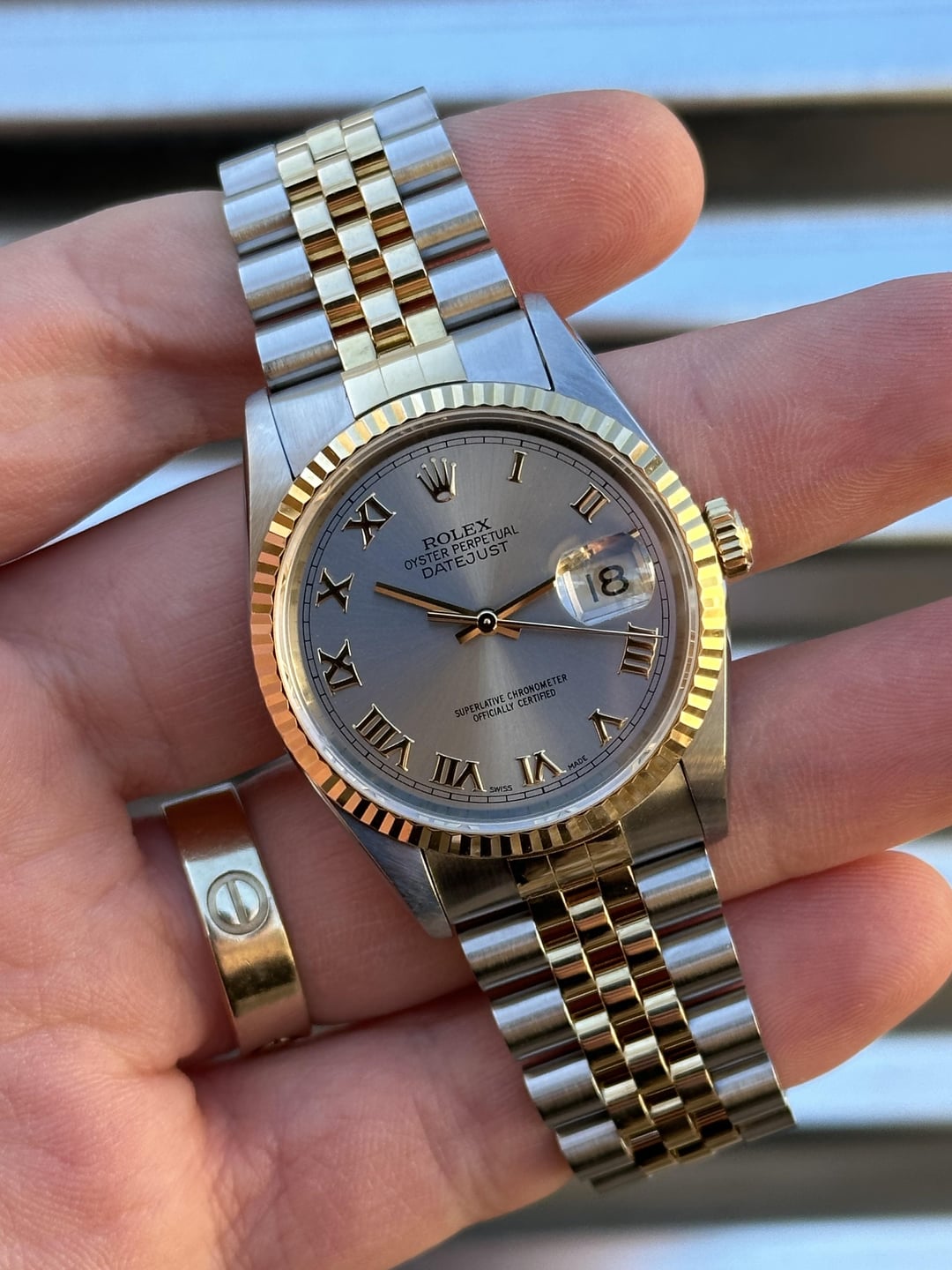 Available is a beautiful two-tone Rolex Datejust with Grey Roman Numeral Dial reference 16233. It features an 18k gold fluted bezel on a jubilee bracelet. It comes with Box & Papers, Original Purchase Receipt, Multiple Service Cards and is in phenomenal condition. It’s clearly a watch that’s been well kept throughout the years. Reference number: 16233 Case:36mm Serial number: S*** which dates this watch to 1993 Papers are stamped July 4, 1994 COMES WITH BOX, PAPERS, BOOKLETS, PURCHASE RECEIPT, MULTIPLE SERVICE Cards (See pic 2.) 💰6️⃣8️⃣0️⃣0️⃣+✈️ The watch is in overall excellent pre-owned condition - see pics for details. Dial looks absolutely beautiful and remains in great shape with no corrosion. Case is in phenomenal shape with nice sharp edges. Thick lugs and clean high polish surface. The 18k yellow gold fluted bezel is in very good shape as well. Coronet on the clasp is well defined. Tight bracelet. Quickset movement. Sapphire crystal. Solid no-holes case. If you’re in the market for a clean DJ then save yourself the time and buy this one! You won’t be disappointed! 20 Links on bracelet Fits about 7.25 inch wrist 💰6️⃣8️⃣0️⃣0️⃣+✈️ We accept Zelle/Wire as payment. Overnight fully insured shipping. I have plenty of references across different platforms so buy with confidence. All of our photos are taken in natural sunlight and are in no way edited with computer programs. Follow us on ig @215Watches for daily deals. Thank you for your time [photo album](https://imgur.com/a/xNOhVbU) [time stamp](https://imgur.com/a/wud2T69)