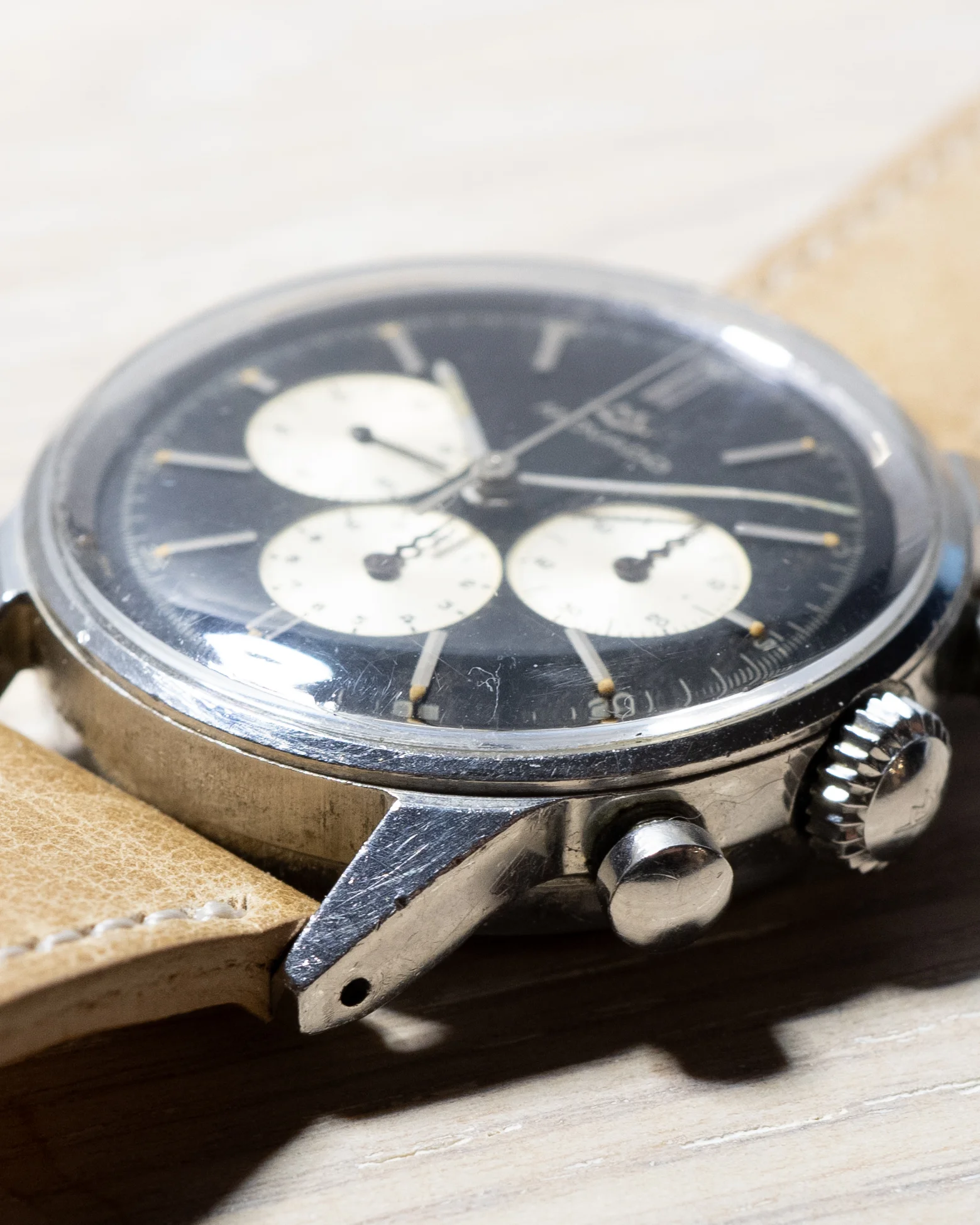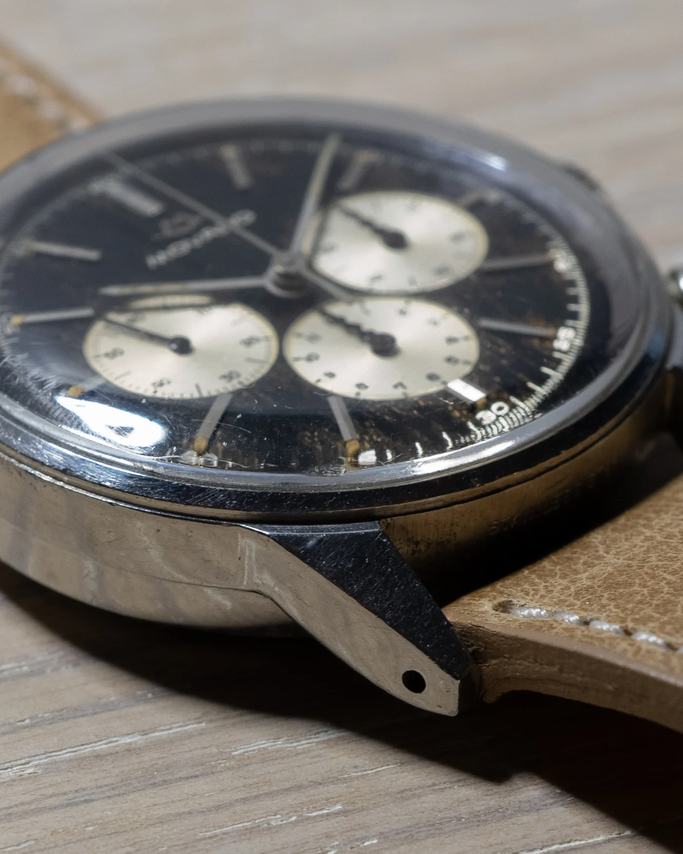 Dial/hands: Lume on dial and hands has aged to a nice sandy hue with lume loss at 11 and 12. Dial has beautiful and unique aging throughout that shows a brown patina in light.