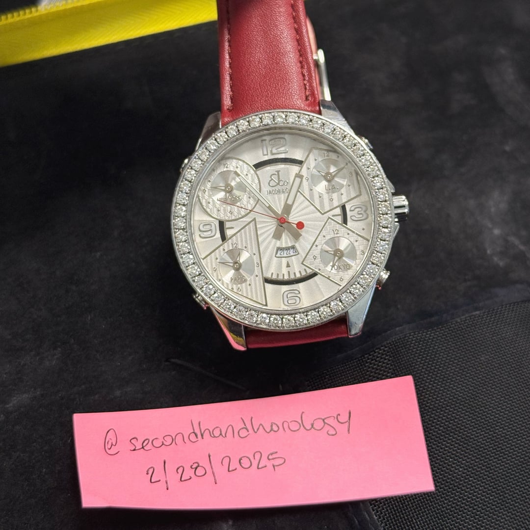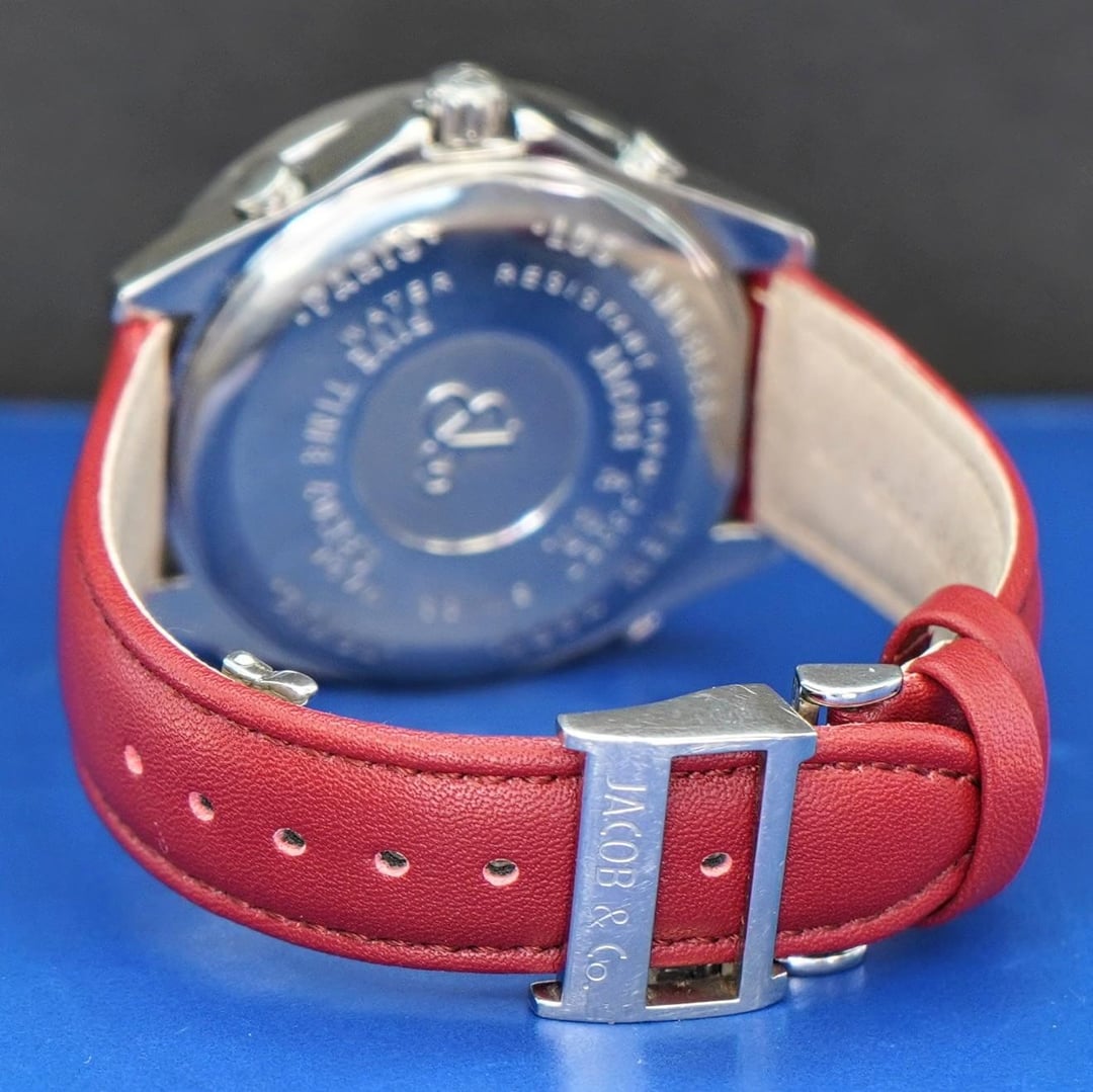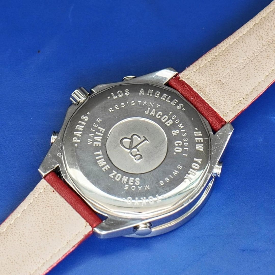 The Jacob & Co. Five Time Zone watch is an iconic luxury timepiece designed for global travelers, featuring a bold dial that displays local time alongside four additional time zones—New York, Los Angeles, Tokyo, and Paris. It is one of the brand’s most recognizable designs, blending luxury with practicality for global travelers. Introduced in 2002 and popularized by celebrities like Cristiano Ronaldo and Victoria Beckham, this watch was spread by celebrities and athletes, becoming a statement piece of bold, contemporary watchmaking. Known for its oversized case, vibrant color schemes, and diamond-set variations, this watch blends practicality with Jacob & Co.’s signature extravagance. Powered by a Swiss quartz movement, it offers precision with minimal maintenance. The movement powers the main time display and four additional sub-dials, each set independently to track different global time zones. Additionally, it includes a date complication for enhanced functionality. A distinctive sunburst silver textured dial features silver and luminous Arabic numerals and hands, complemented by the four time zone sub-dials. A vibrant red sweep second hand adds a striking contrast, while the date display is positioned at 6 o’clock. The dial is elegantly signed with the Jacob & Co. logo, showcasing the brand’s signature style. Housed in a robust 47mm stainless steel case with a dazzling diamond-set bezel, this timepiece retains its original crown and offers a water resistance of 100m (330ft). The watch comes in its original Jacob & Co. Five Time Zone colorful bag/box, complete with the original padded two-piece leather straps in red and yellow, each with its respective butterfly clasp. Additionally, we are including a brand-new red genuine microfiber two-piece leather strap and a black alligator leather two-piece strap for added versatility and style. **Asking Price: $4,590 + Label** Thank you for looking, we are SECOND HAND HOROLOGY! Please feel free to check out our website and social media, fresh inventory everyday!