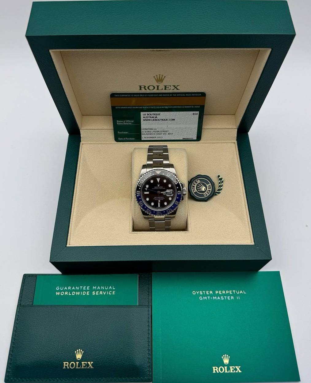 Gorgeous Rolex GMT-Master II “Batman” 116710BLNR Two tone black and blue ceramic bezel oyster bracelet black dial, Protective stickers, like new condition comes with card 2015 green tag and accessories The best choice for you