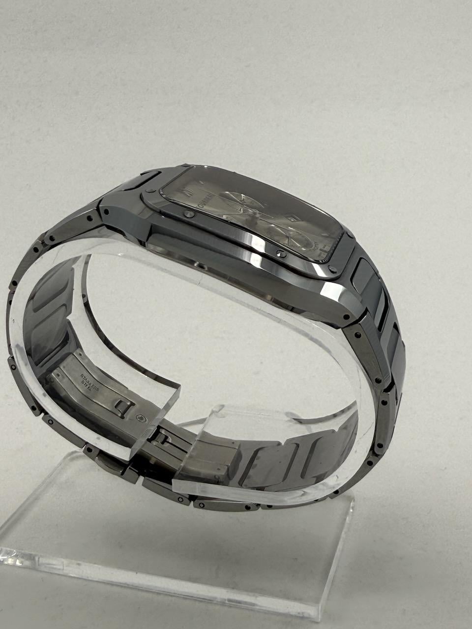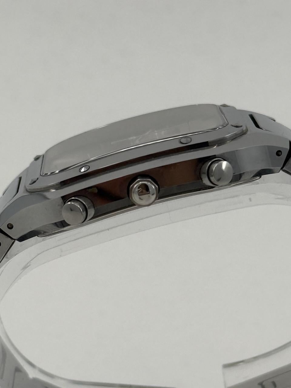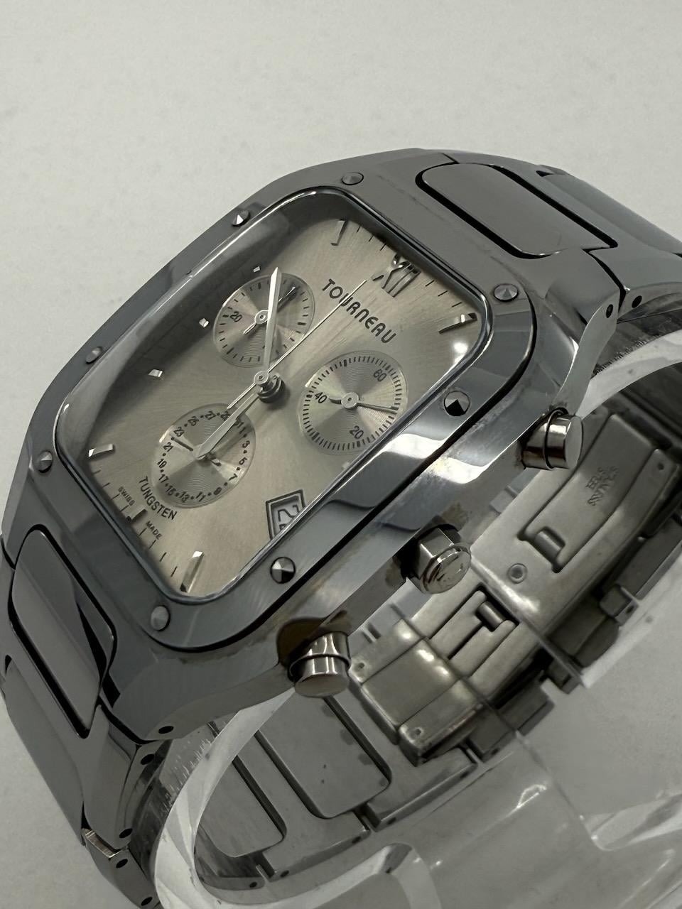 Selling for $600.00 USD plus $20 insurred 2-day FedEx. If you are in LA, I would be happy to meet in person. I do not have the box or the papers. A couple of years ago, I threw them out, dont ask why. I keep my boxes to my smoke detectors, but decided that the watch box was too large to store. This is a VERY unique watch. This is 100% Tungsten (except for the case back). NOTE: The Bracelet is listed as steel, because while Chrono24 allows Tungsten to be selected for the Watch Case, it does not provide Tungsten as a value for the Bracelet. This is because Tungsten is SUPER rare to have in a Bracelet. People are getting tungsten rings these days because it doeso not scratch, well imagine that in a watch. I have had this for about 15 years, purchased it from Tourneau Shop in the Las Vegas Caesar's Forum shops, when it was the largest watch store in the world. Please take a look at the pictures, this watch does not have a single scratch on it. It gleams like the Sun and everybody will ask you what kind of watch you have. It is truly that unique, and looks it. The heavy polish on this watch will allow it to be a Dress watch or even a knock around watch if you dont mind the shiny. Movement: This is a Quartz Chronograph movement and it works perfectly. The battery was just replaced so you should be good to go for a while. Lastly, this watch has a date window at the 4:00 position. Weight: This watch weighs 183 grams including the watch, currently sized bracelet, and the extra links. While Gold is a heavier metal than Tungsten, watches are not made out of 24 Carat Gold, so this watch feels heavier than a solid gold watch of the same size which are made out of alloys lighter than pure gold. Tungsten is a very hard and dense material. If you look at the pictures of the watch and you will see that the watch links are extremely thin and the watch itself is also pretty thin. This is just a great feeling heafty watch. Tungsten is also extremely hard. It is harder than Steel, Gold, Titanium, and... Ceramic. On the Mohs hardness scale, tungsten typically scores higher (around 8-9) compared to ceramic which usually falls in the 6-7 range, making tungsten more resistant to scratches and wear and tear than ceramic. Apple can talk about their DLC or their super hard materials, but nothing they produce can hold a candle to tungsten. This watch is not unscratchable, but it is the hardest possible watch to scratch. If you are going to be desk diving, this is your watch. They did not make many of these, mainly because the material is so hard to work with, let alone polish to a shine such as this. Movado made some tungsten watches awhile back, but they are rare these days. If you have any questions at all, please let me know and I will respond quickly.
