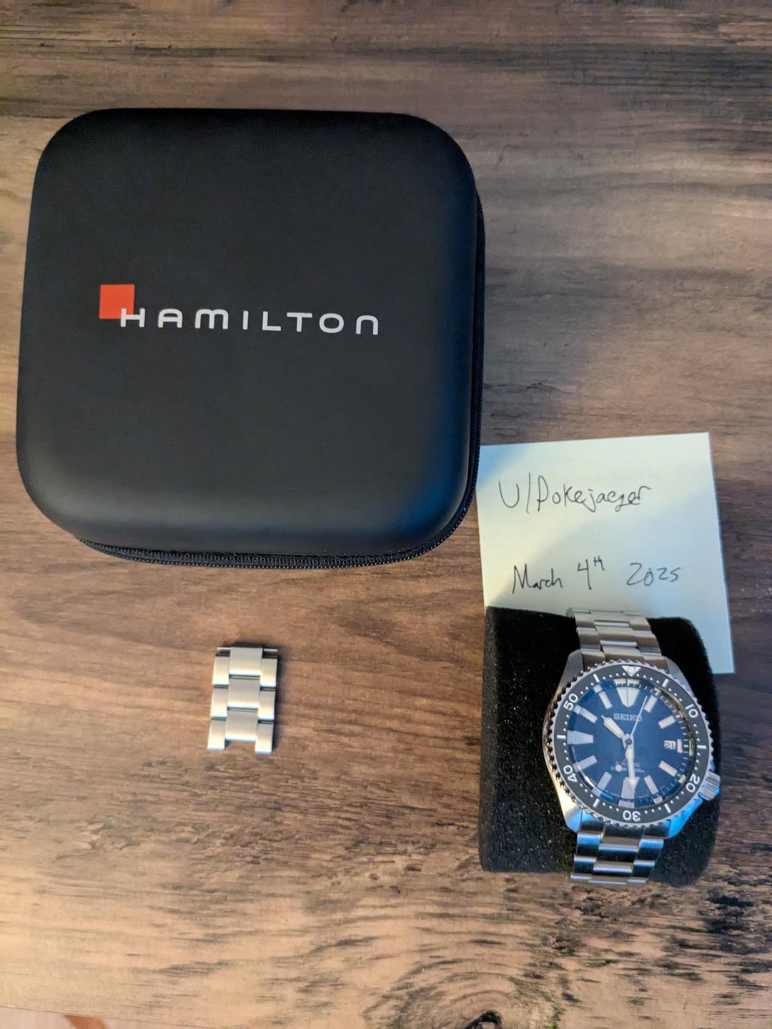Up for sale is this unique Seiko Mod. OEM SKX Hands and OEM Dark Manta Dial in a Heimdallr case. Comes with free Hamilton travel case and 3 extra links. It's a great watch, I just don't wear it as much as I should be to justify keeping it. Currently sized for my 7in wrist, probably can go up to 8in quite comfortably with the included extra links. There is some slight wear on the left side of the case and one of the band links - I tried to capture it on camera but it's extremely slight. I would give the condition 9/10 rounding down. Specs: Dial: OEM Seiko Dark Manta Hands: OEM Seiko SKX Diameter: 42.5mm Lug to Lug: 46mm Lug Width: 22mm Thickness: 13mm Case: Stainless Steel, Screw Down Crown Movement: Seiko NH35 Crystal: Sapphire Bezel: 120 Click Bracelet: Stainless Steel with microadjust flip-lock clasp Link to Seiko Product page for Dark Manta Dial: https://seikousa.com/collections/prospex/products/srpf79 Price: $250, includes CONUS shipping and Hamilton Travel Case. PayPal/Zelle/Venmo