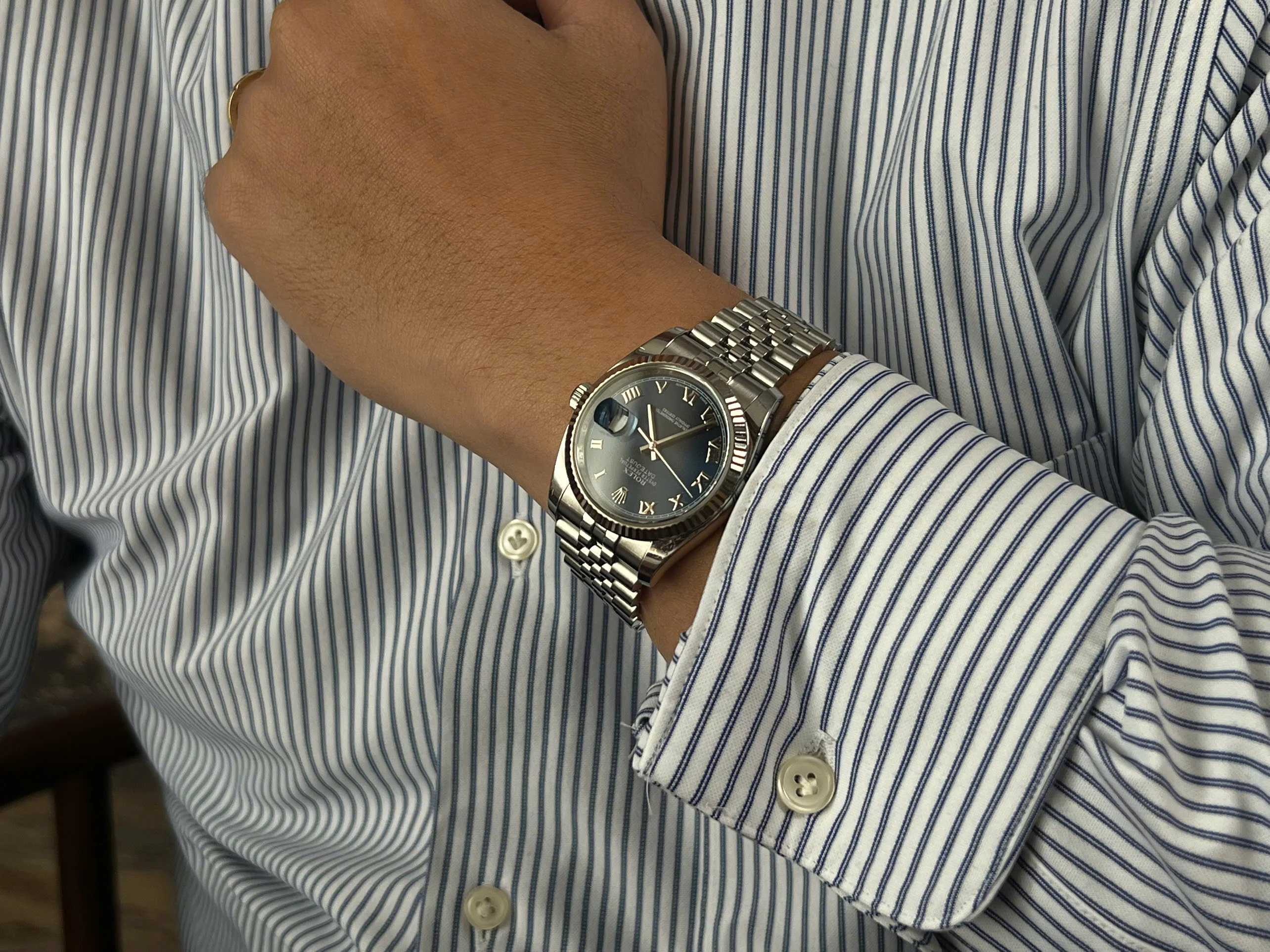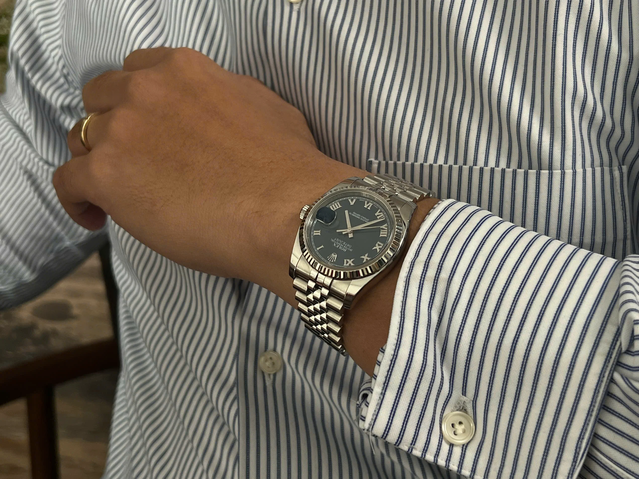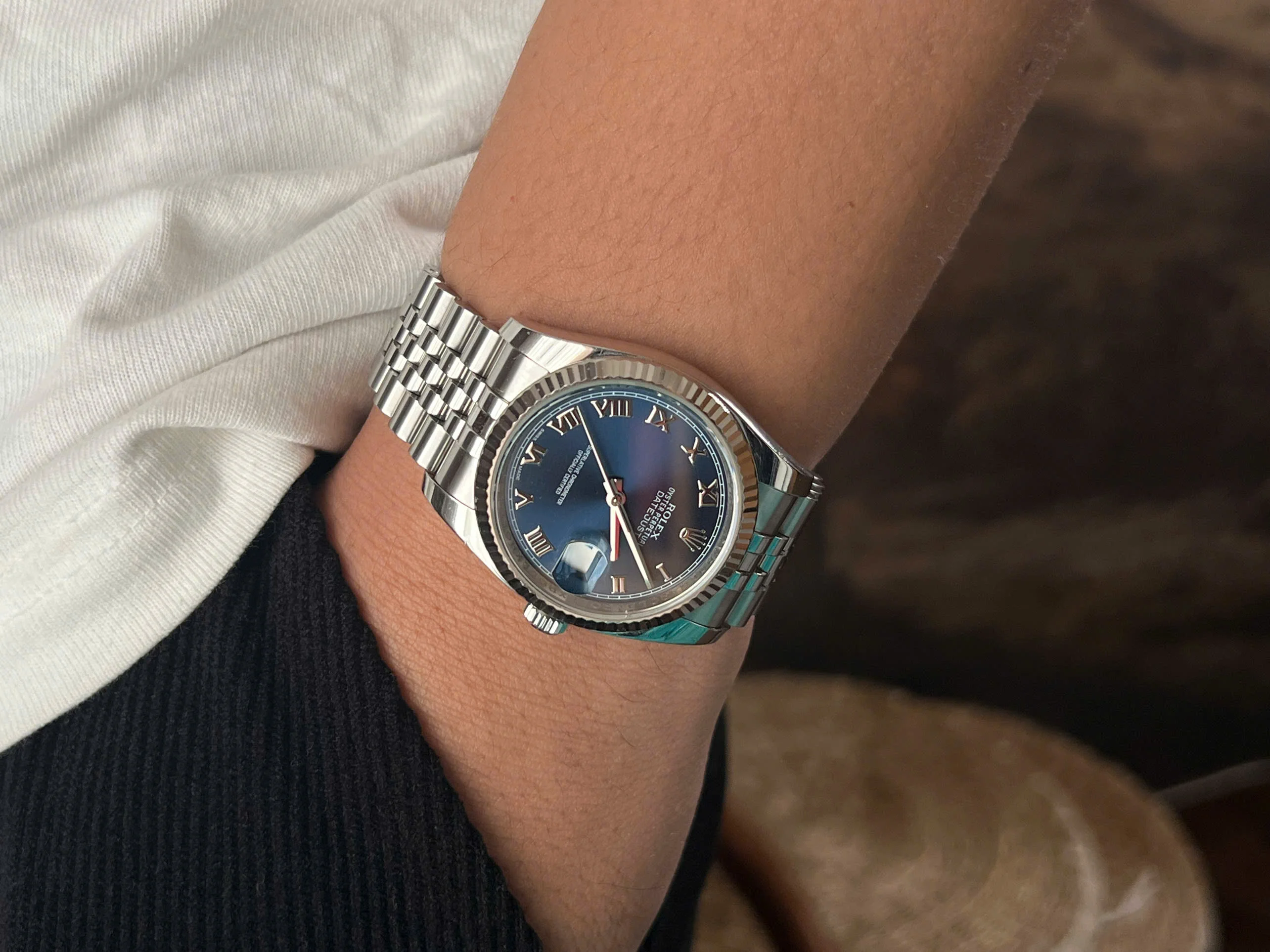 The dial is in flawless condition. A blue dial with Roman numerals is exactly the combination I wanted when I was looking for a Datejust.