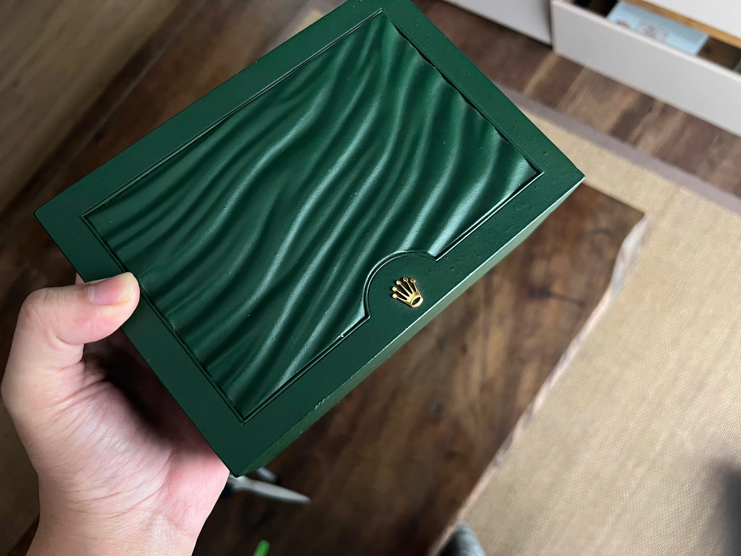 It includes the original Rolex green 31.00.64 box (pictures of the box), booklet, and hang tag, as well as the sale receipt (information can be shared with interested buyer—please ask). No card (only a picture of the card is available—please ask).