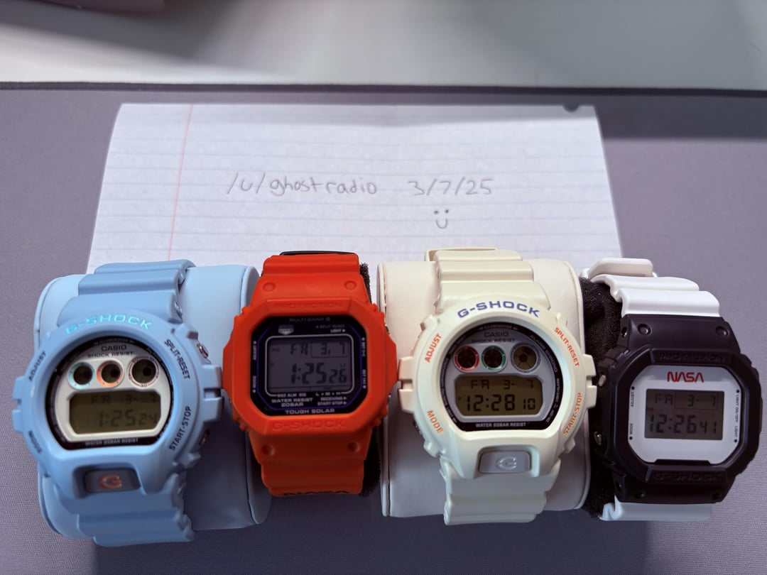 Hey guys! I'm selling what I've (casually) accrued of my limited edition G-Shock collections. I'm selling each one for $200 USD OBO shipped to CONUS, or all four watches for $600 USD OBO shipped CONUS. All four watches have had little wrist time, with zero scratches or blemishes on ANY watch. All four come complete with warranty cards and full packaging ready for display. I just never got around to finishing my collections of either the NASA editions or John Mayer Hodinkee collabs, and have gradually lost interest having kept them in my closet 😅 I can provide more photos or videos as well! Would prefer payments through Zelle, but will do PayPal to buyers with reasonable feedback. To break it down specifically, I am selling: * G-SHOCK Ref.6900-PT80 (White) - $200 USD OBO * G-SHOCK Ref. 6900-PT1 (Blue) - $200 USD OBO * G-SHOCK Ref. DW5600NASA21 (White & Black) - $200 USD OBO * G-SHOCK Ref. GWM5610NASA4 (Orange) - $200 USB OBO All prices are variable, so shoot me an offer if you're interested. Again, I will either sell each item individually or sell all four together for $600 USD OBO! Thanks for your time reading!