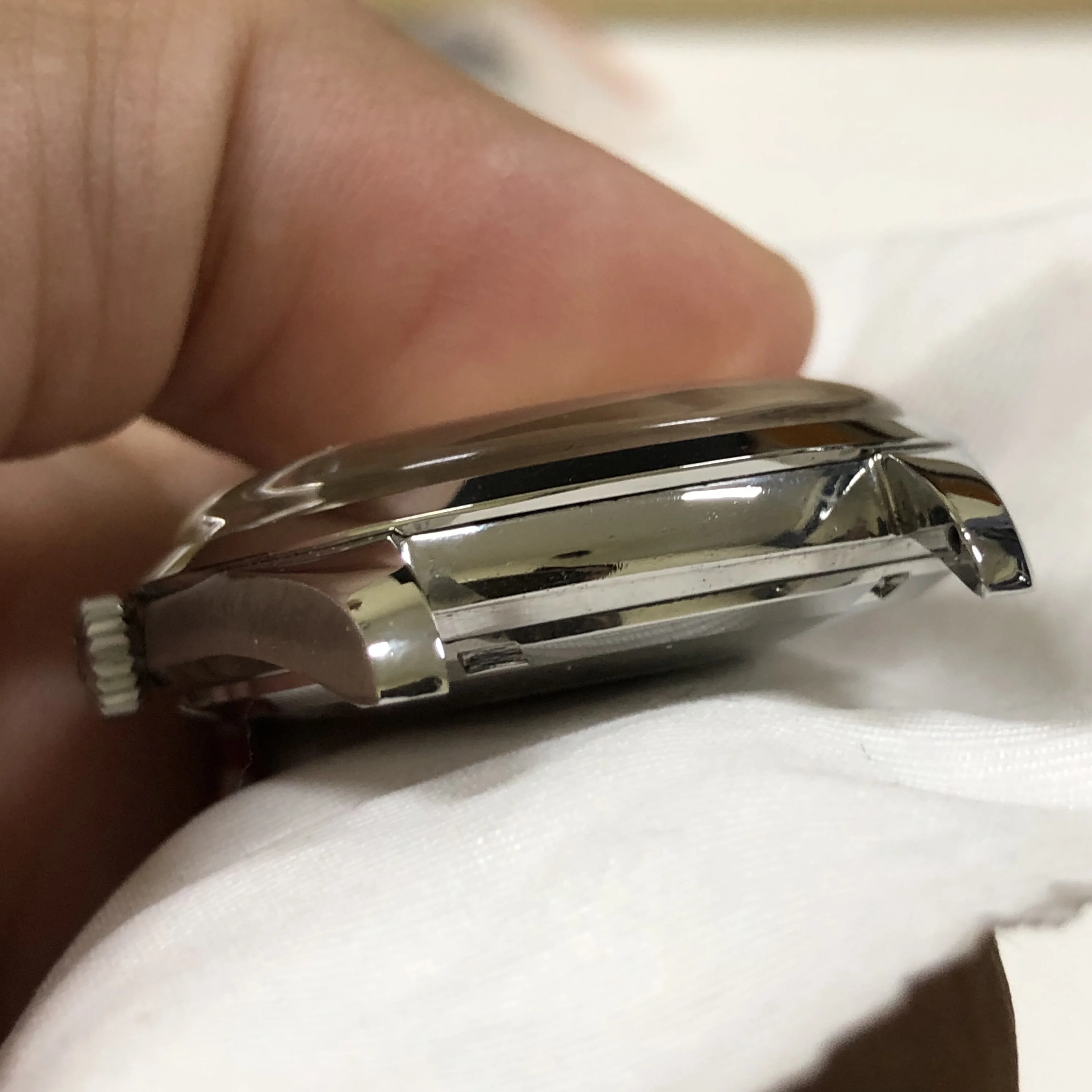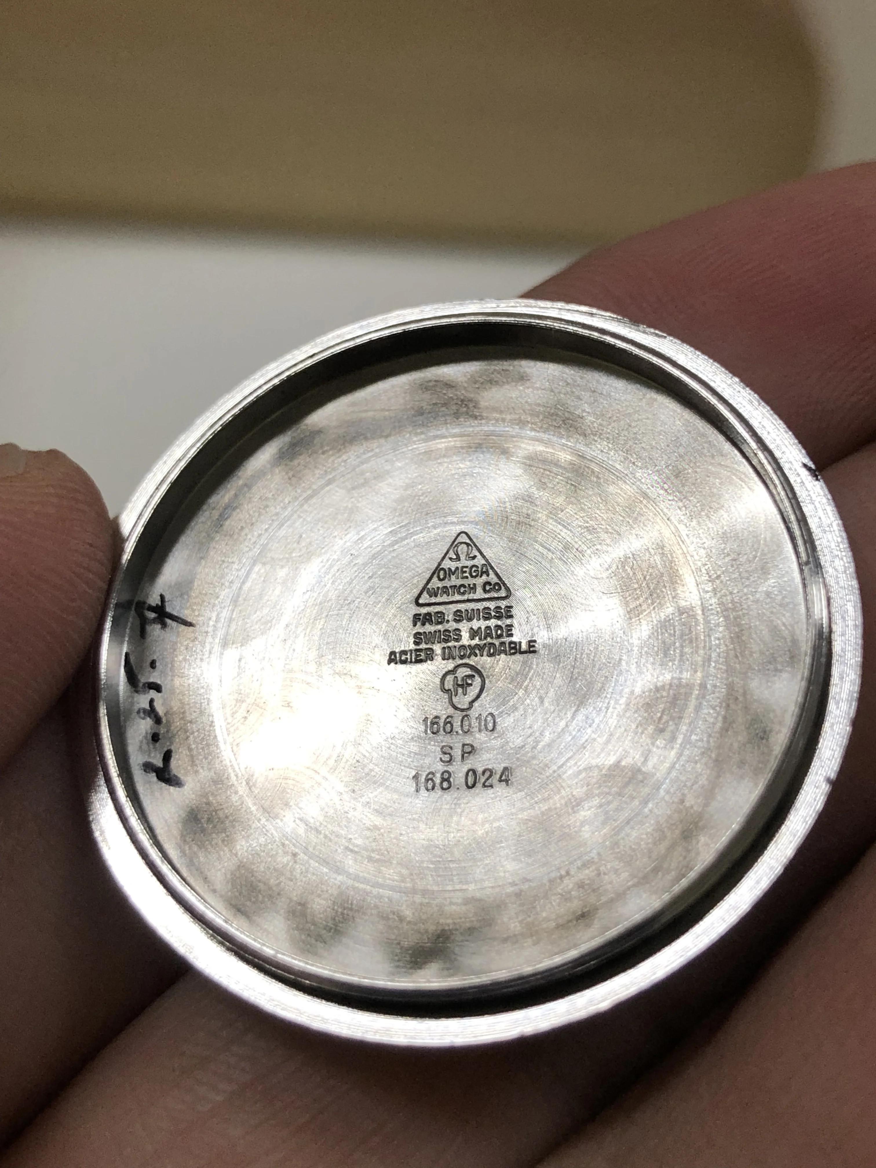 - Case: The diameter is 35mm without the crown. Original case in superb condition, razor sharp, few hairline scratches, still shining. The case back looks like it has not been opened (much) before. Original Omega knurled crown.