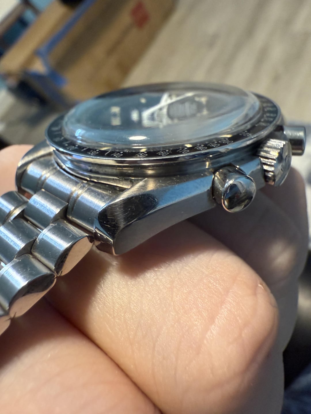 Offered for sale today is a perfect neo-vintage example of the hesalite Speedmaster dating to 1993. This was the classic Moonwatch back in the 90s, and comes with the handwound caliber 861, tritium dial and hands, hesalite crystal, and original 1479 bracelet, all wrapped up in the professional 42mm case. The watch is in excellent condition as the pictures show. The crystal has some very light scratches that you will pick up by looking at the watch, but those really add to the vintage charm (in small doses) and will easily polywatch out. The watch has been keeping excellent time while I’ve had it, and all functions of the watch are working well, including hand-winding and chronograph start, stop, and reset. The watch includes enough links and micro adjust to size the bracelet up to 7.2”. Asking $3500 sale price. I got this in recently but, like the last Speedmaster I had, something just isn’t clicking for me entirely so I’m looking to see what’s out there. Open to all trade offers up, down and sideways as well. TV is a bit higher. Full album: https://postimg.cc/gallery/6yjcWPB Timestamp: https://i.postimg.cc/BZxf3cWx/IMG-2443.jpg