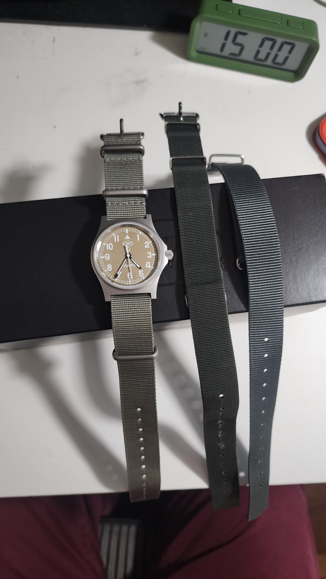 CWC GS Sapphire Desert Storm. It's called Desert Storm but the dial is almost grey green so not sure, not very sandy looking but great looking dial. I maybe wore this 10x at most indoors so it's in excellent condition, and on the mounted grey MWC strap its on. Bonus is the CWC strap was never worn, and also comes with a bonus dark forest green Phoenix NATO. I am the original owner from 2022. These suckers come with a 10 year battery so it will keep on tickin for a while. Full kit. Here are more specs from CWC: Lithium battery for long life Sapphire glass for scratch-resistance and durability Anti-reflective coating on crystal SuperLuminova luminous markings on dial and hands Screw-down crown 715 Ronda lithium movement Screw-down case back Stainless steel case 39.5mm case incl. crown, 36.5mm without crown Weight (without strap): 46g Fixed strap bars 19mm lug width Strap supplied Cabot Military Grey 18mm 20atm / 200m water-resistance Date or non-date version Three year warranty $280 SHIPPED CONUS