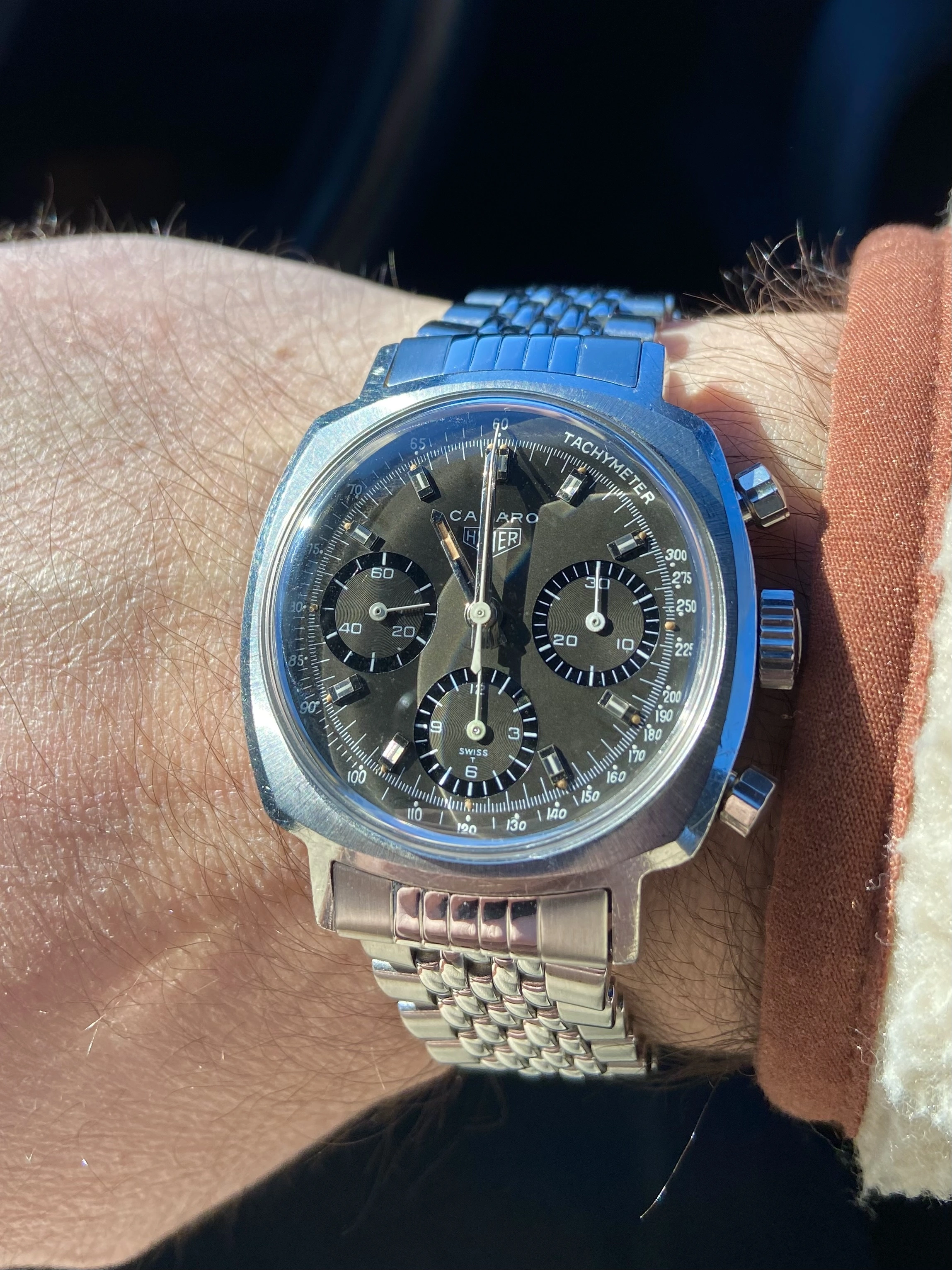 This is a beautiful example of the classic valjoux 72 powered Camaro. I would say it’s genuinely one of the best, if not the best on the market right now. It is all original, with a clean sharp case and beautiful, slightly tropical noir/black dial.