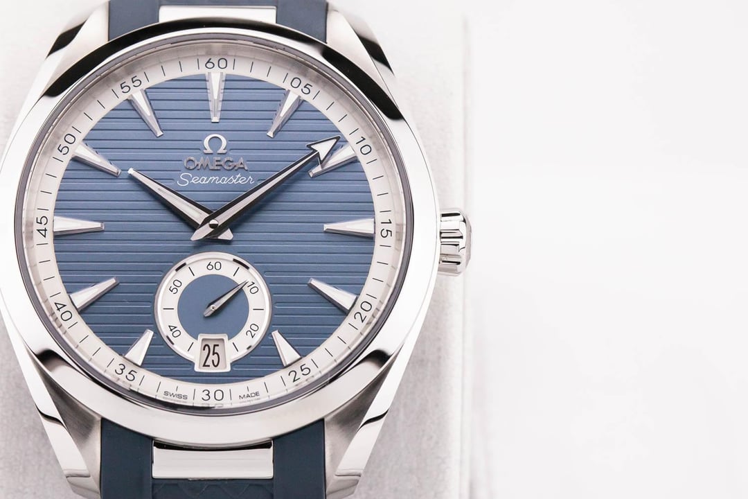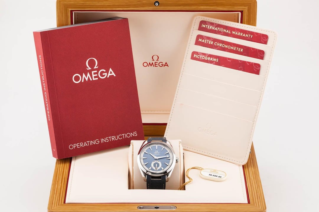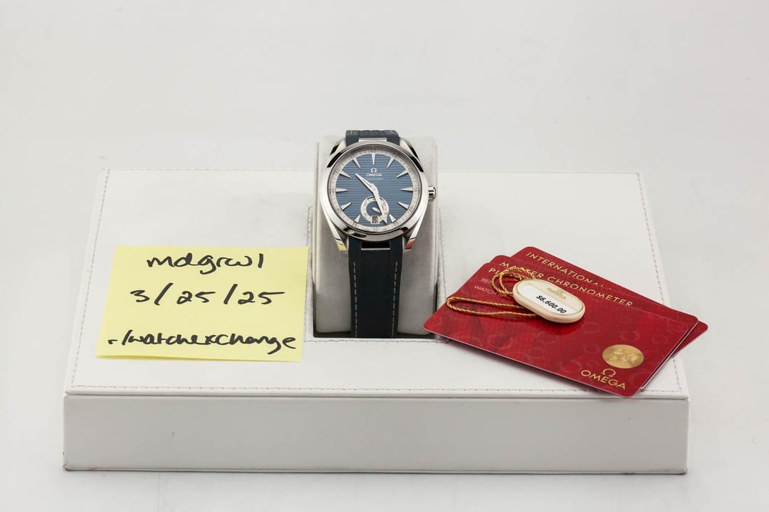 Up for sale is an excellent condition Omega Aqua Terra 150M Small Seconds in Slate Blue, reference # 220.12.41.21.03.005. It comes complete with all boxes, papers, booklets, hang tag, and Omega Warranty Card dated November 2023. Excellent Condition / Complete Set **Item Details:** Omega Aqua Terra 150M Small Seconds 41mm Stainless Steel Case Omega Caliber 8916 **Timestamp:** [https://live.staticflickr.com/65535/54410112259\_486291cb04\_b.jpg](https://live.staticflickr.com/65535/54410112259_486291cb04_b.jpg) **Trades:** We are cash buyers and will consider all modern trades. **Payment:** Listed Price is for Bank Wire, Zelle or any no-fee payment method. Paypal is an additional 3.5%. **Price:** $4650 - Shipped 2 Day Air ! **Shipping:** Fedex Express within the US. International Shipping adds $150. **Returns:** Returns accepted within 48 hours of receipt only if the watch is misrepresented. **Contact:** Please email or text for fastest response. [[email protected]](mailto:[email protected]) or call / text 207-209-4000 Buying a watch on the internet can be scary. We know. You want an established business, accurate presentation of product, followed up by quick responses, and expedited shipping. We understand. That is why we deliver this along with honest, straightforward transactions backed by our well-built reputation. We are new to Reddit but have been selling on forums for many years, and have literally thousands of references. All photography is original. 6.625% state sales tax applies to New Jersey shipping addresses only.