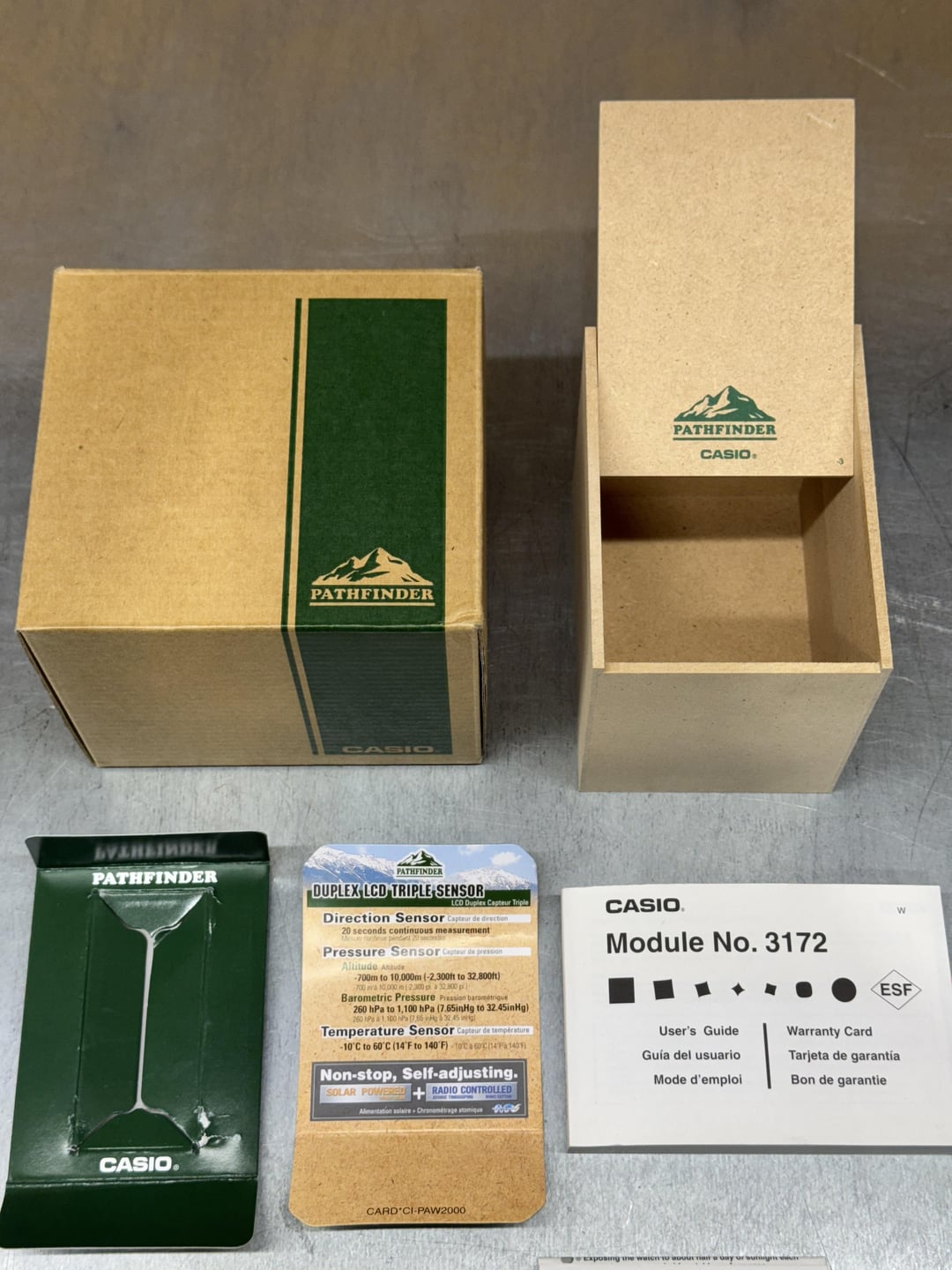 Up for sale is a package deal (no, I won’t split them up at this time) of both a Casio PRW-2500 and PAW-2000. The PRW-2500 is the model with the black rotating bezel and has been worn quite a bit since I bought it new many years ago (2011 - Paid $294.50) when they came out. Thus, the bezel has scratches/dings and overall the watch shows obvious signs of wear. That being said, there is nothing functionally wrong with this watch - it holds solar charge perfectly and the atomic time setting works great. I wore it on a NATO strap, which is why there is no strap attached in the pictures, however both screw in strap bars are in place. I have not used this watch in many years, so it is time to let it go. The PAW-2000 I have also owned since I bought it new many years ago (2009 - Paid $260) and I also wore it on a NATO strap, however both screw in strap bars are in place. This watch also shows obvious sign of a fair amount of use and wear. Although solar charging is working great, the issue with this watch is that it does not seem to sync via its atomic time function. Other than that, everything is in good working order. I also have all the original packaging for this watch, including the cool wooden Pathfinder box. I have also included a completely unused Pathfinder marked strap and the little wings that go with it that I never used due to immediately installing a NATO strap. This strap technically goes to the PAW-2000 but it will fit the 2500. Asking $150 for the package, shipped. USA only. This is my first sale on watch exchange, but I was fairly active on watchuseek forums as well as many other knife and other EDC forums many years ago. So don't hesitate to let me know if you have any questions and thanks for looking!